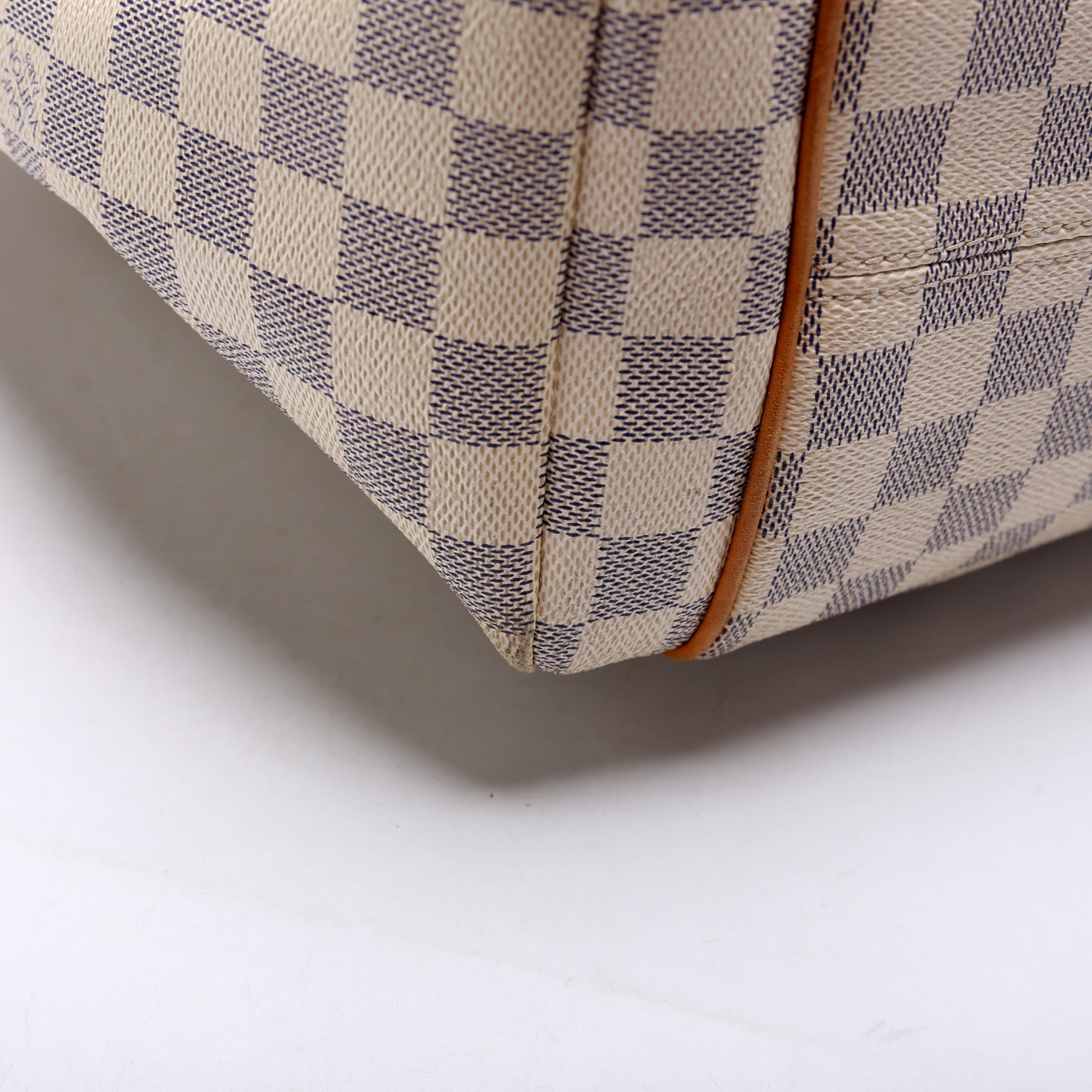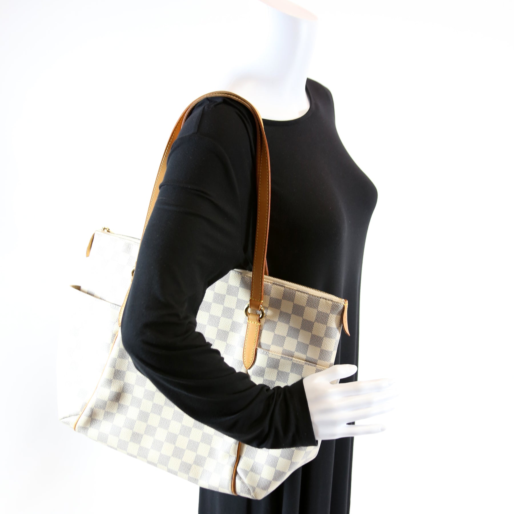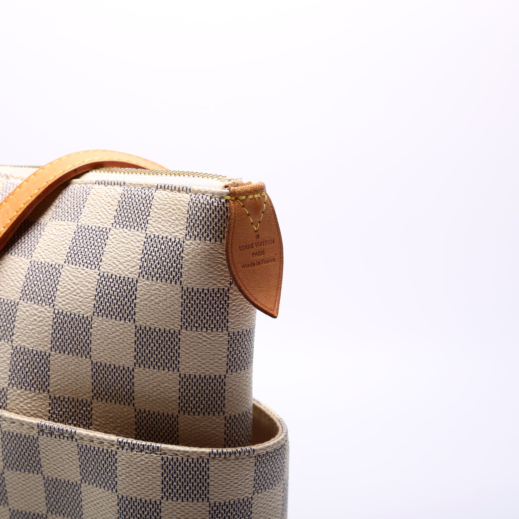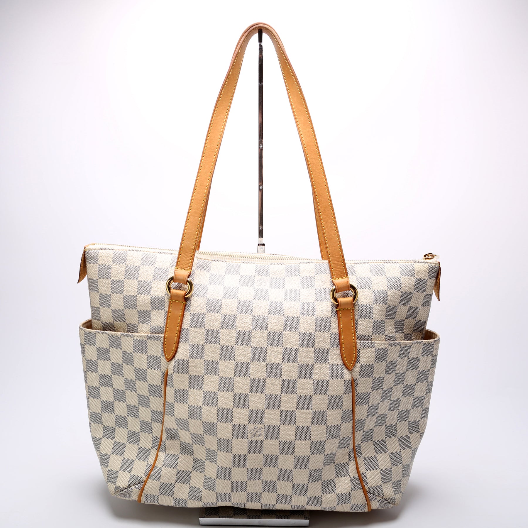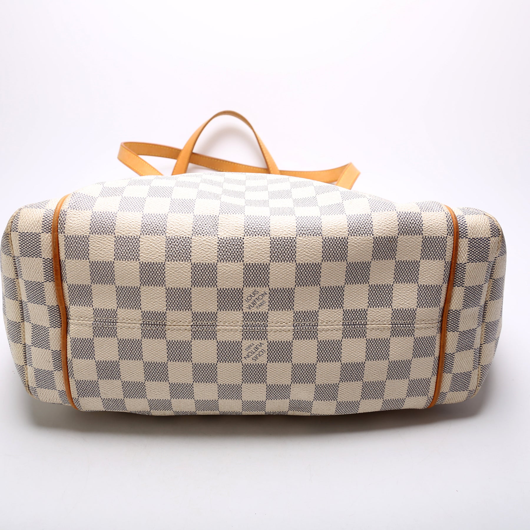 This pre-owned Louis Vuitton Totally MM is guaranteed 100% authentic. The exterior is in the classic Louis Vuitton Damier Azur coated canvas.