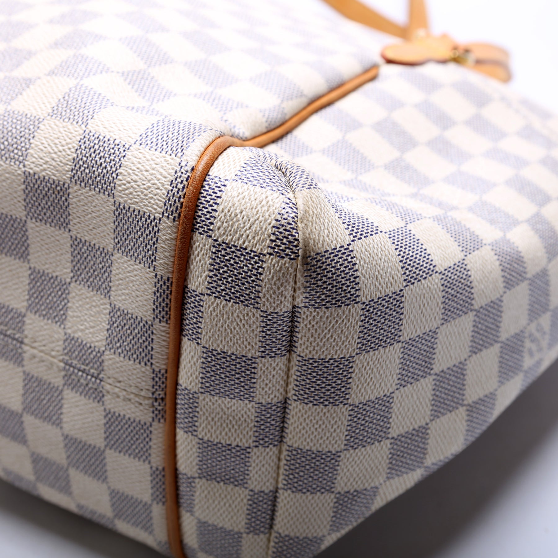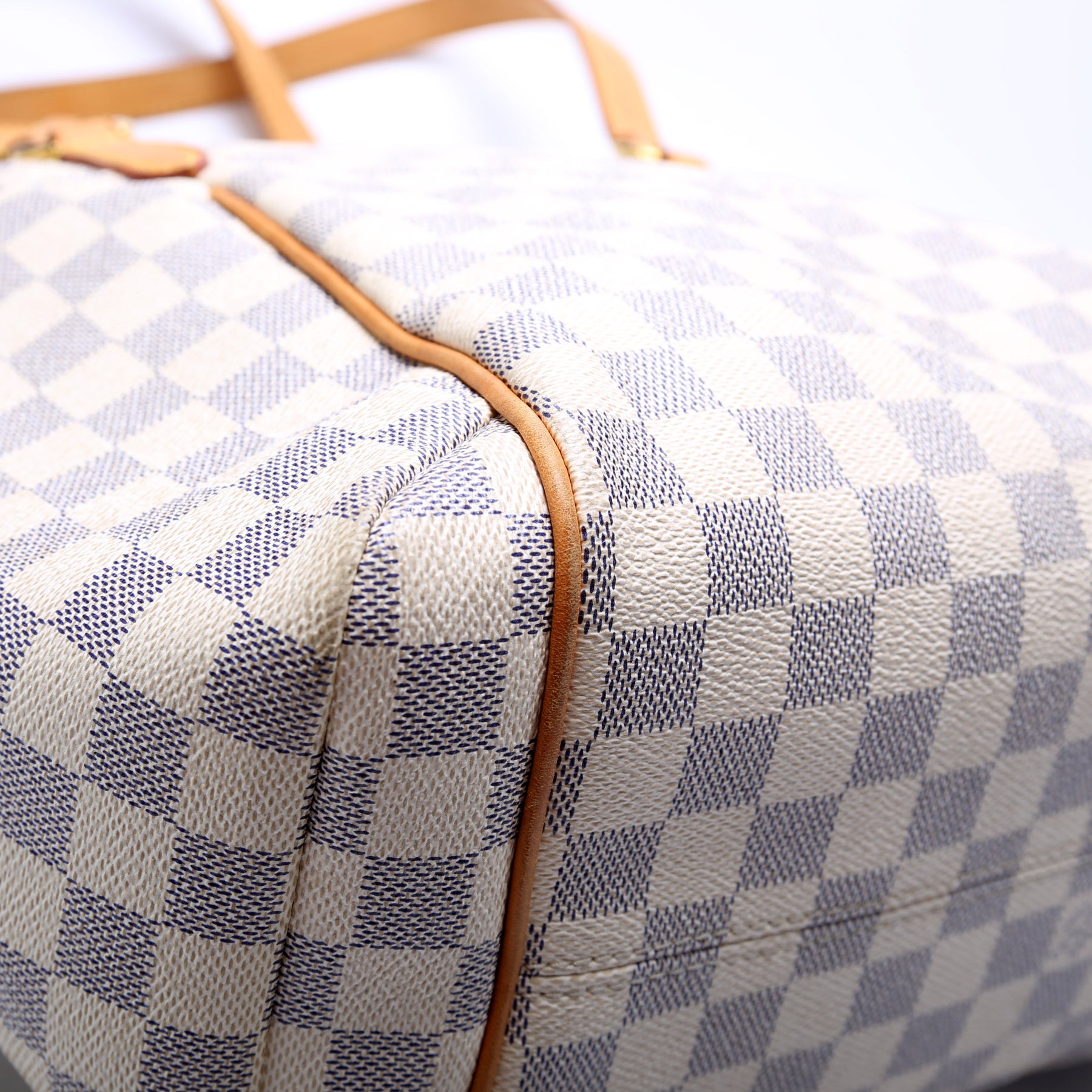 Handle: The leather handles show minor wear and discoloration.