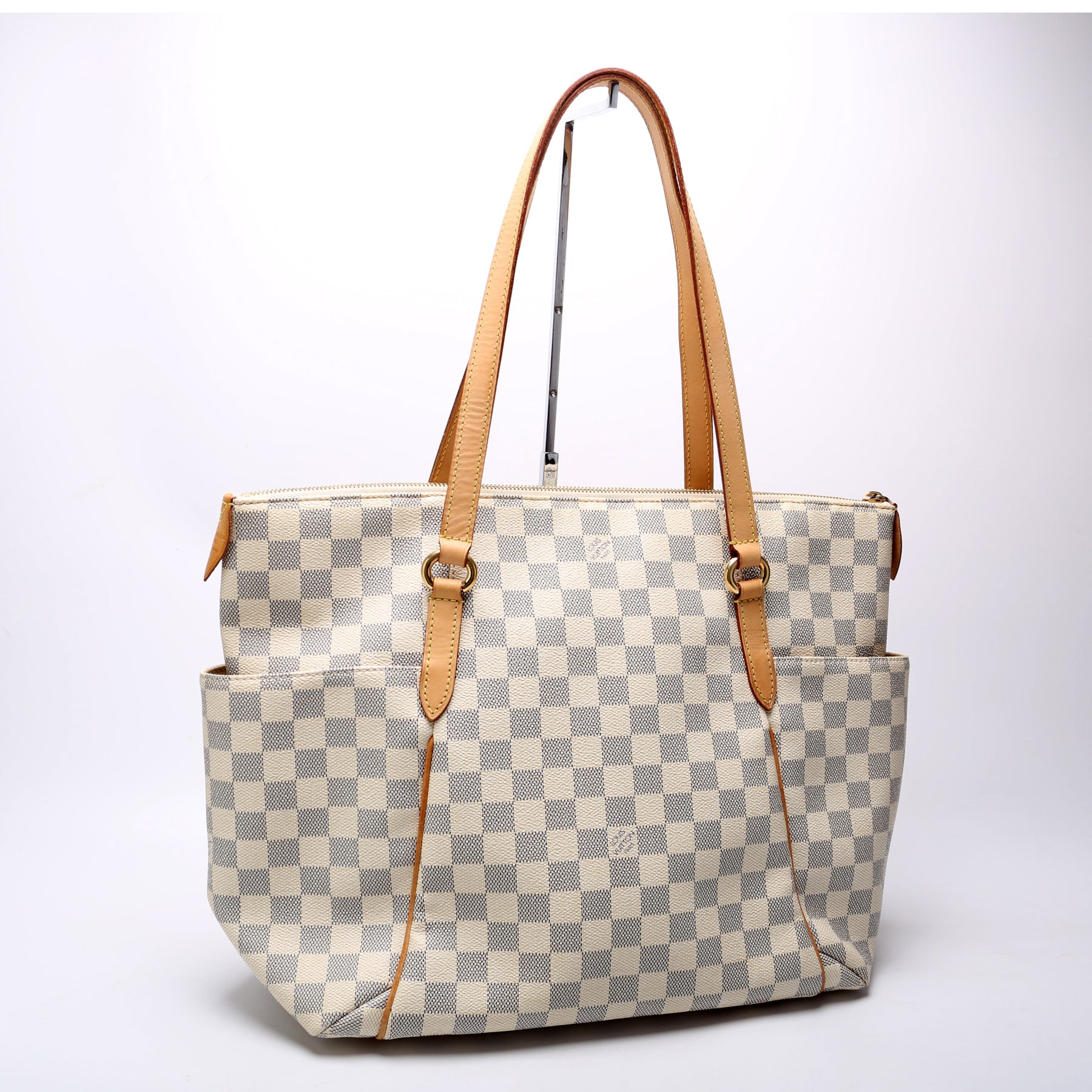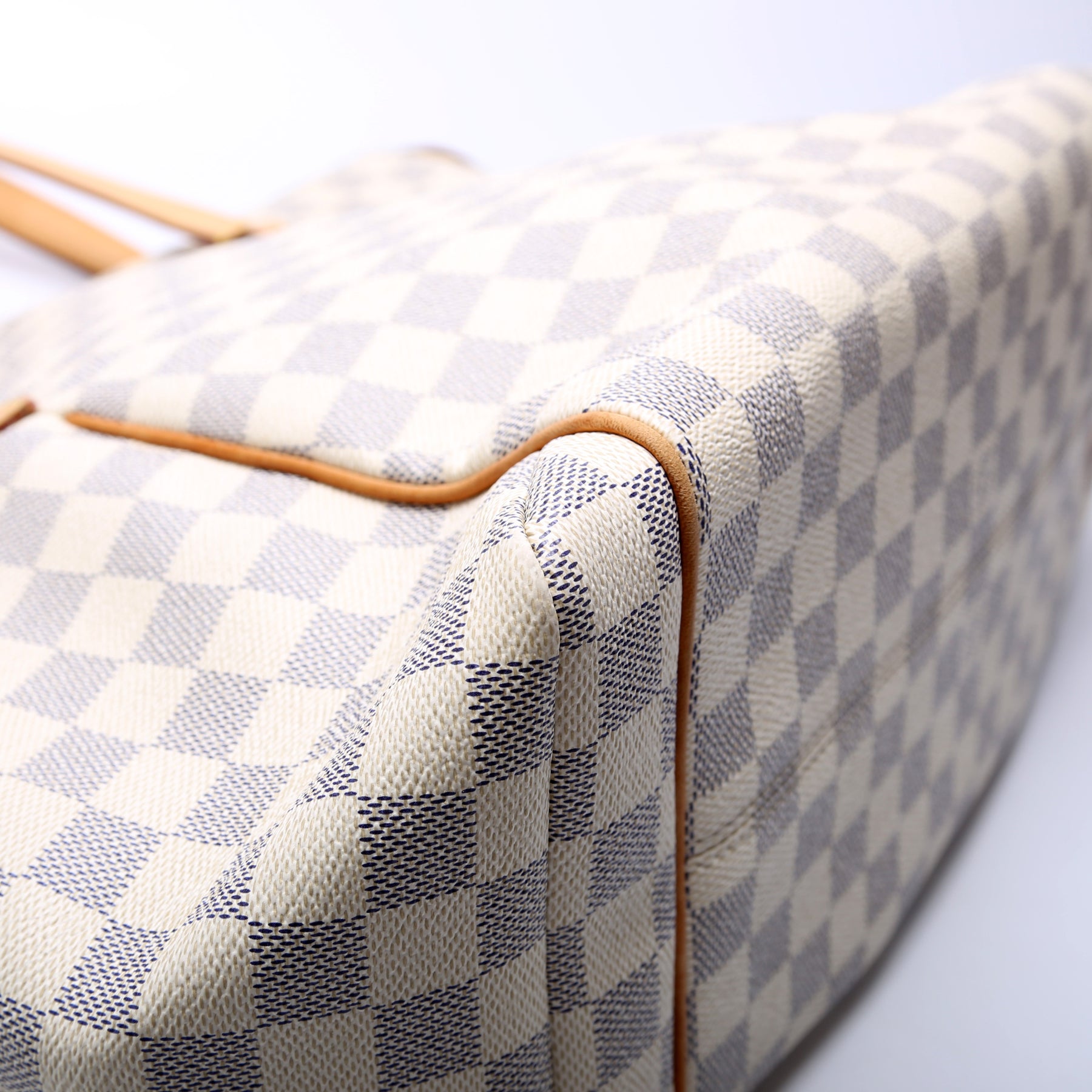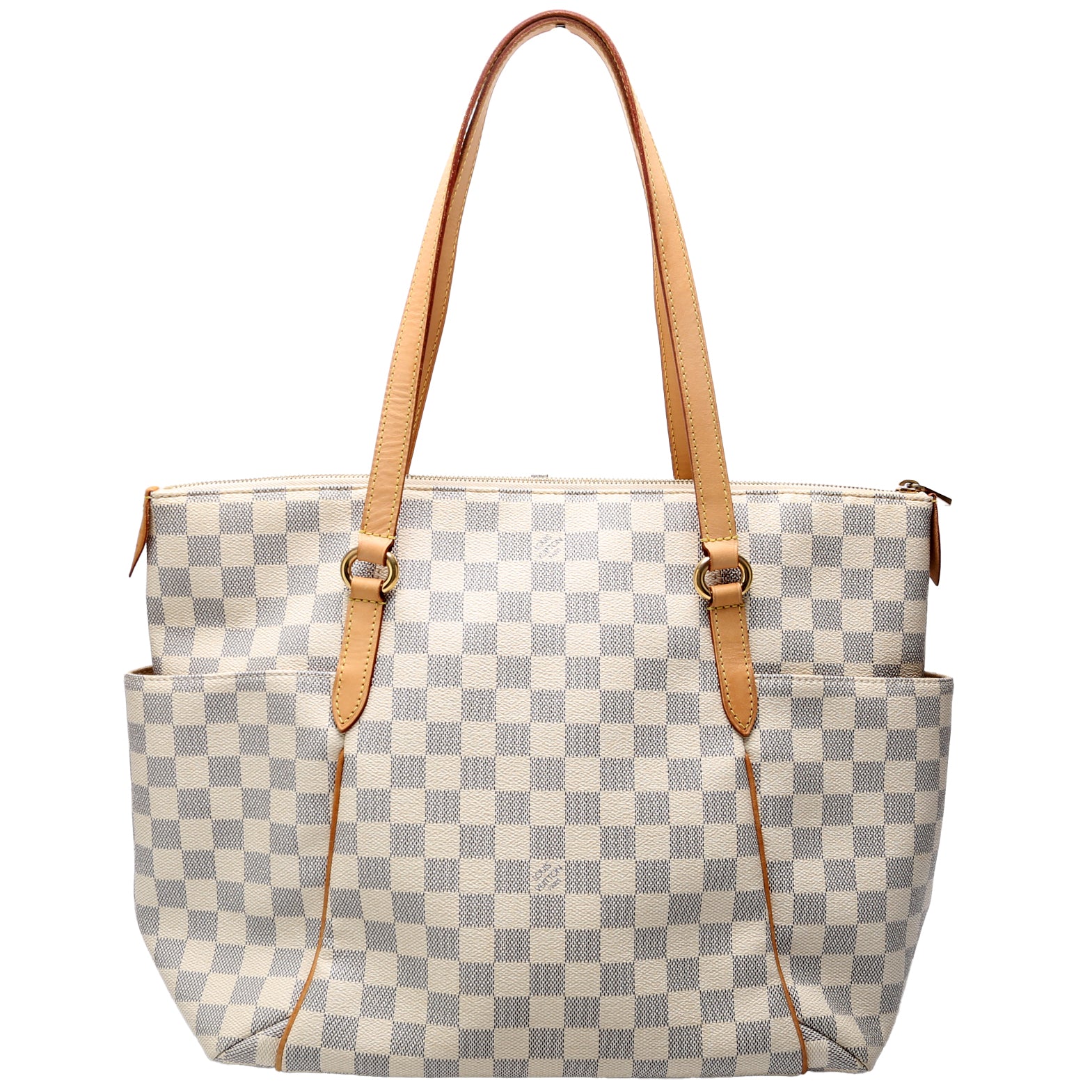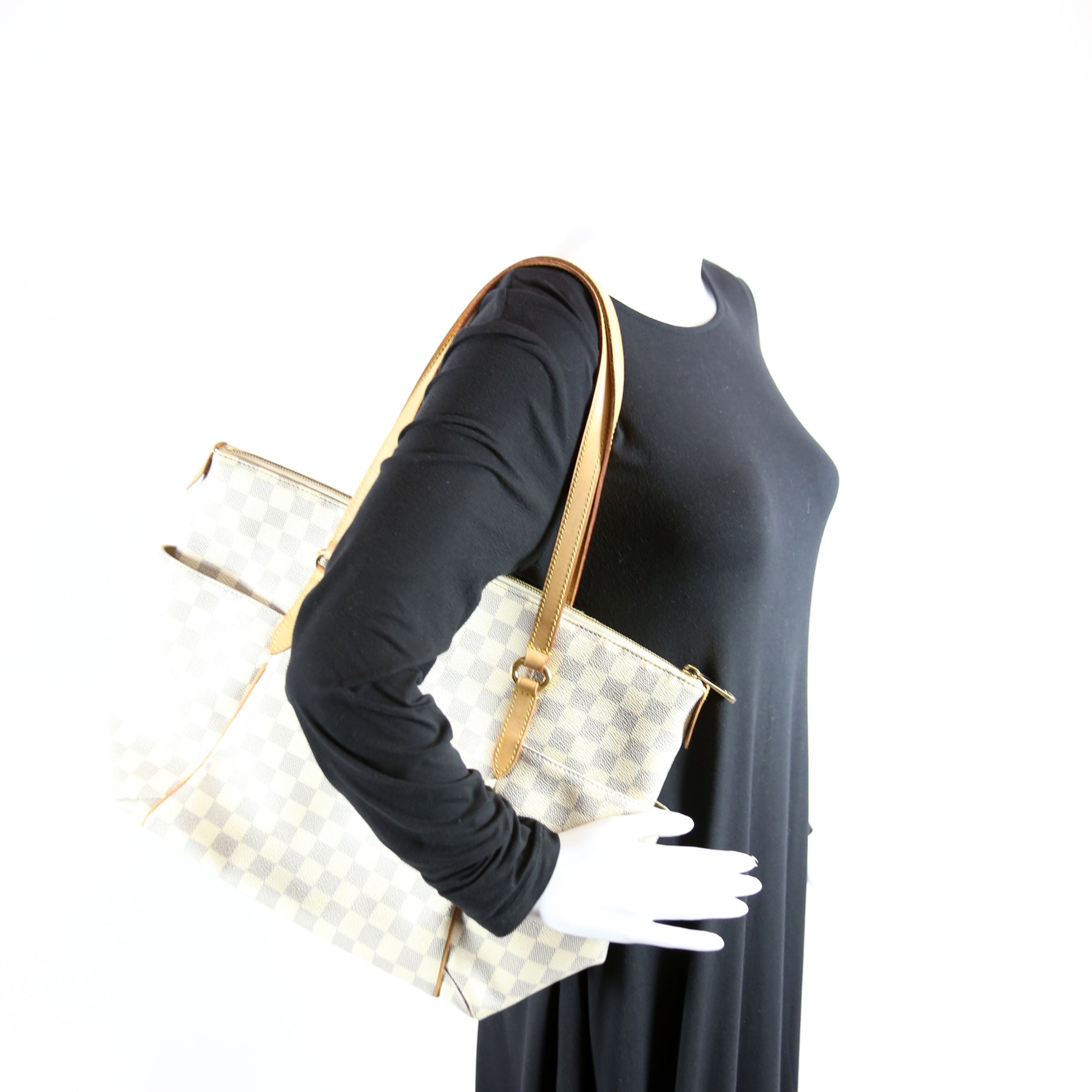This pre-owned Louis Vuitton Totally MM Azur is guaranteed 100% authentic. The exterior is in the classic Louis Vuitton Damier Azur coated canvas.