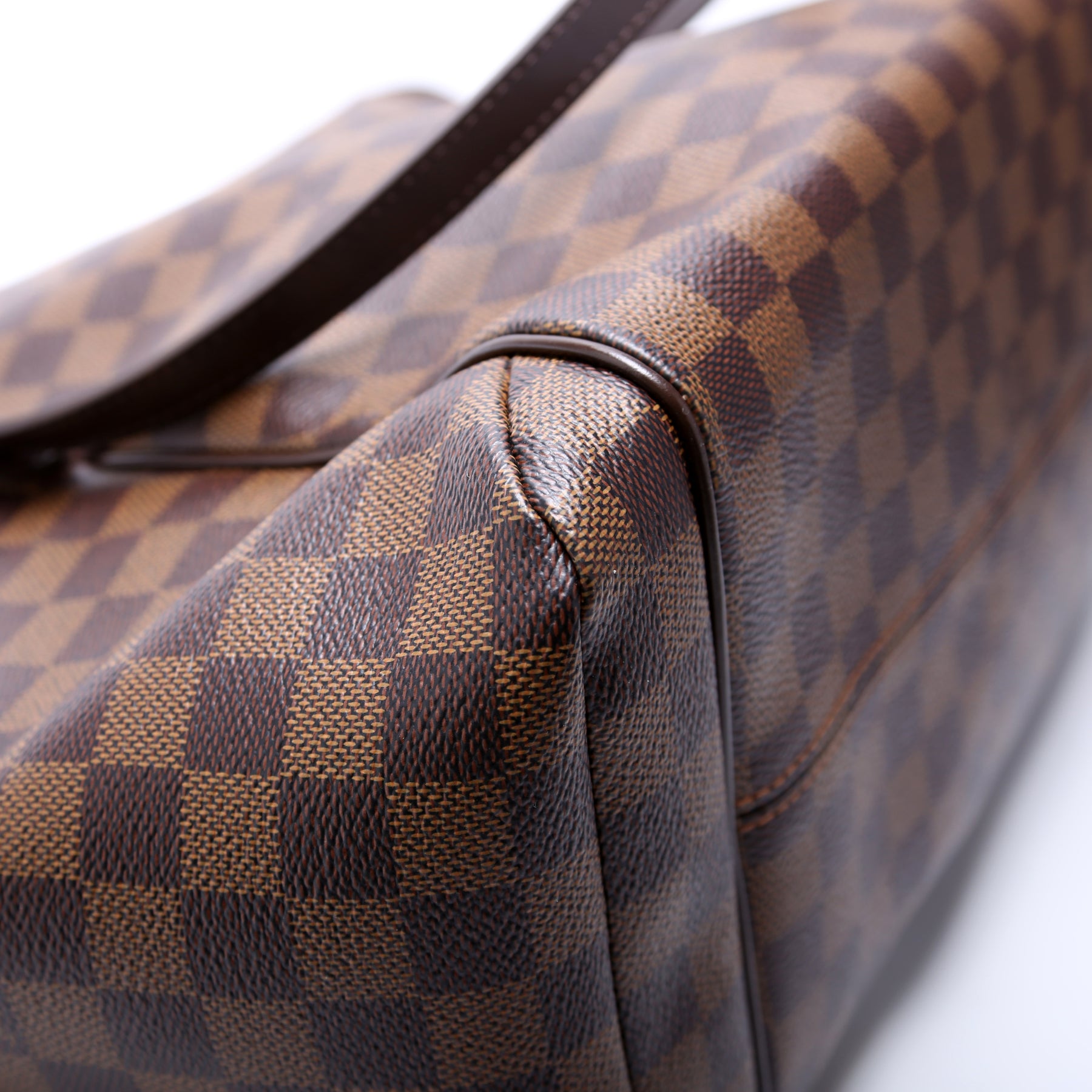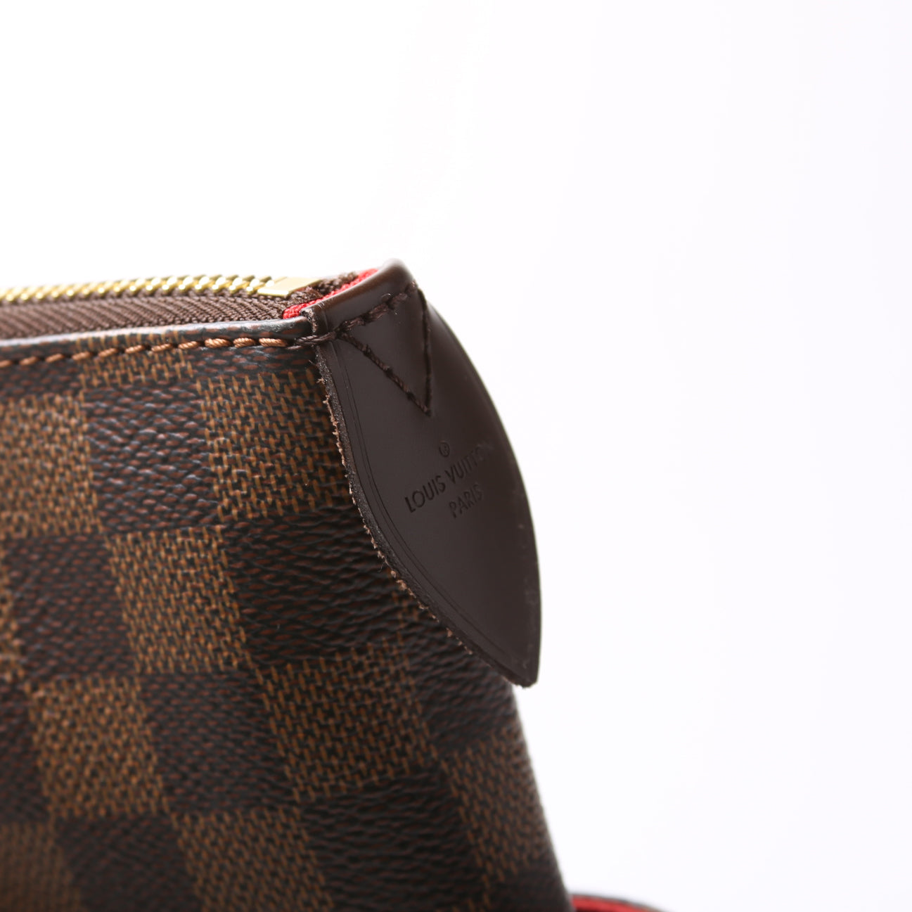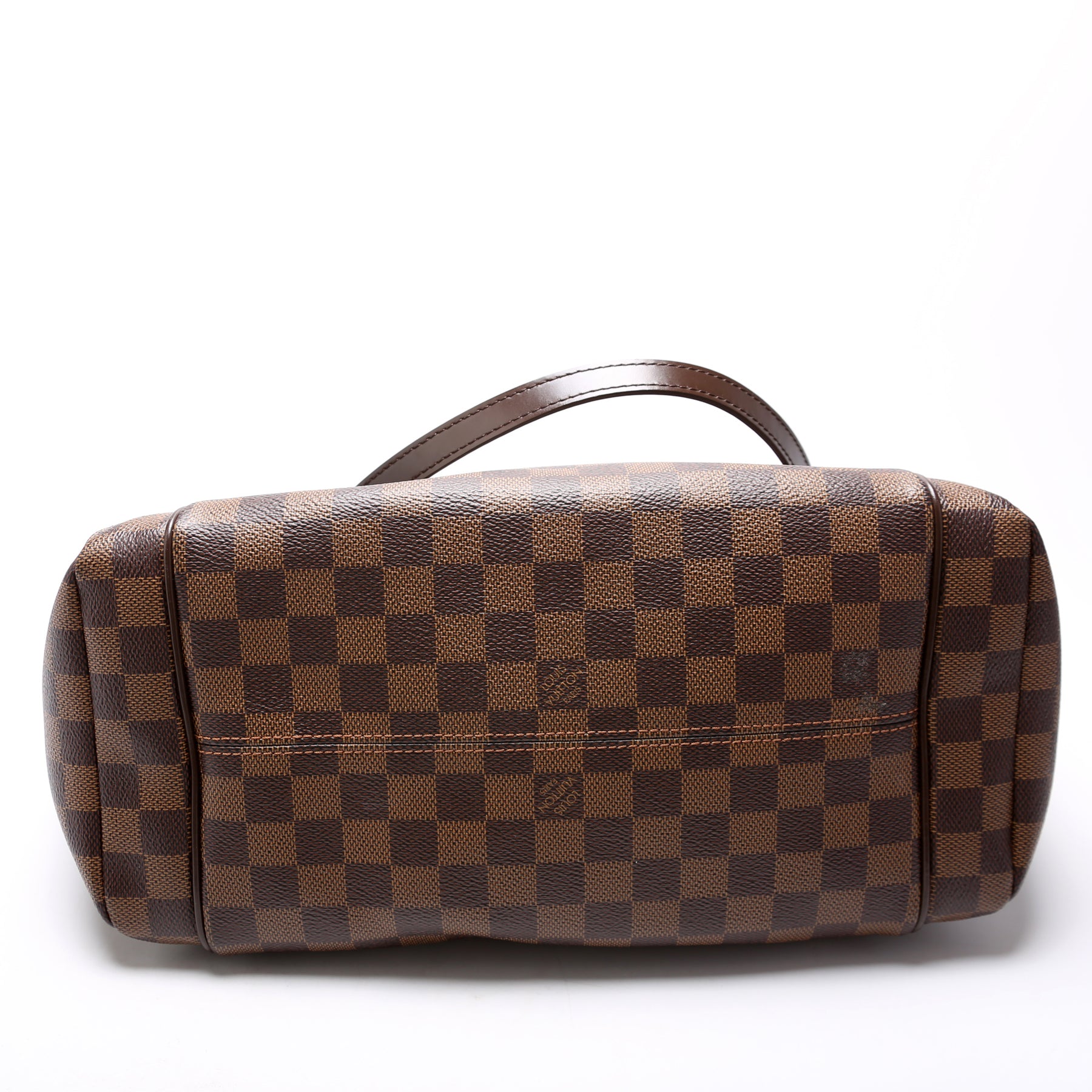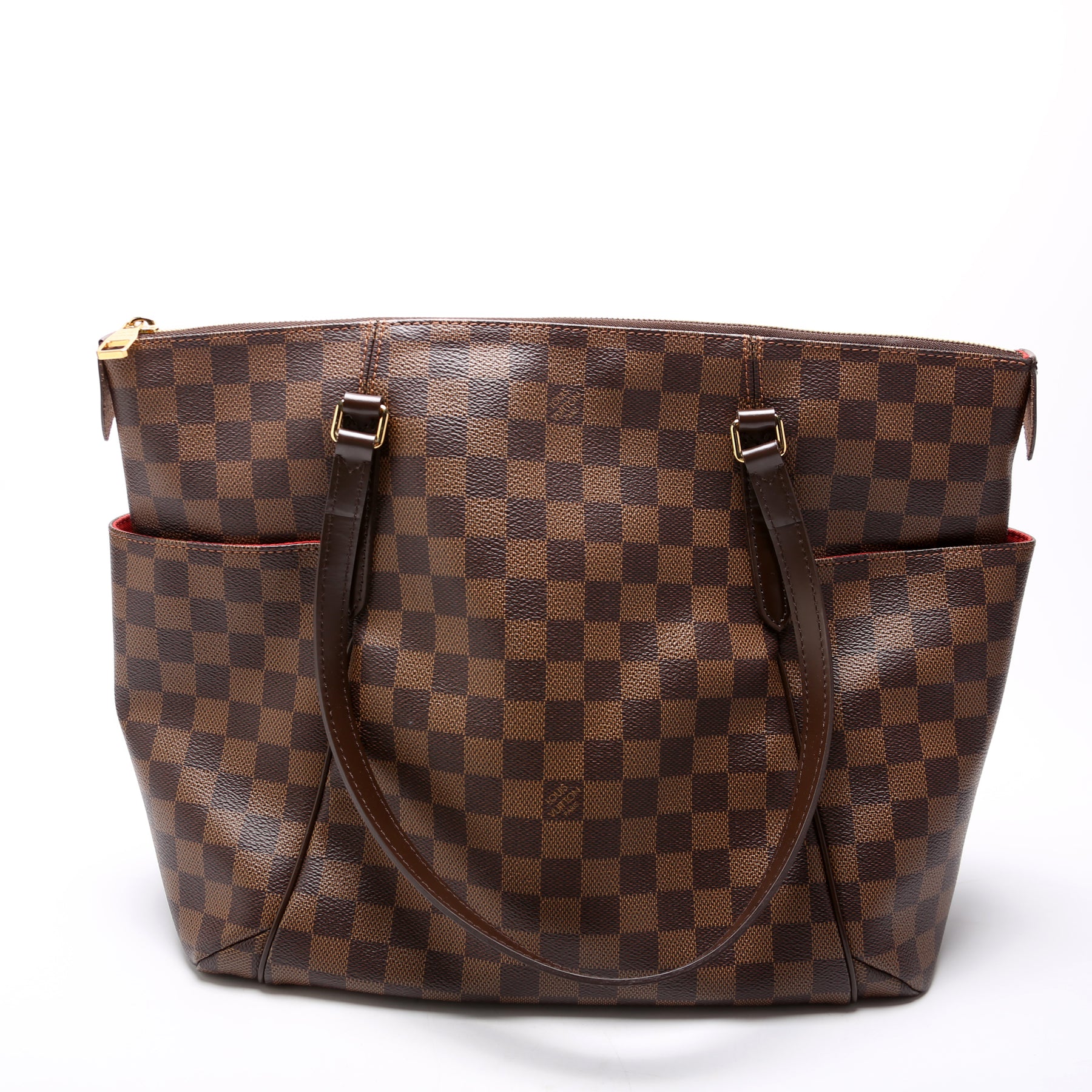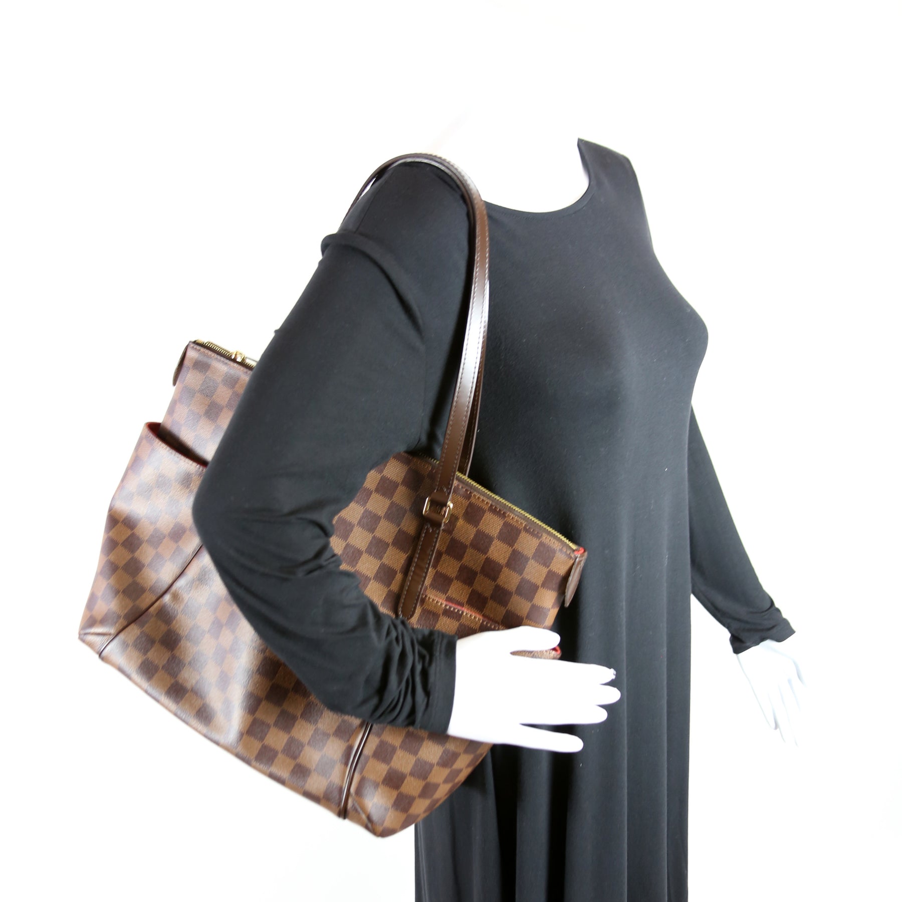 This pre-owned Louis Vuitton Totally MM is guaranteed 100% authentic. The exterior is in the classic Louis Vuitton Damier Ebene coated canvas.