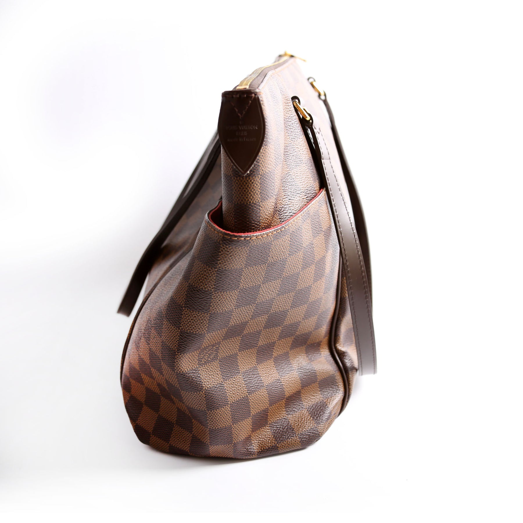 This pre-owned Louis Vuitton Totally MM is guaranteed 100% authentic. The exterior is in the classic Louis Vuitton Damier Ebene coated canvas.