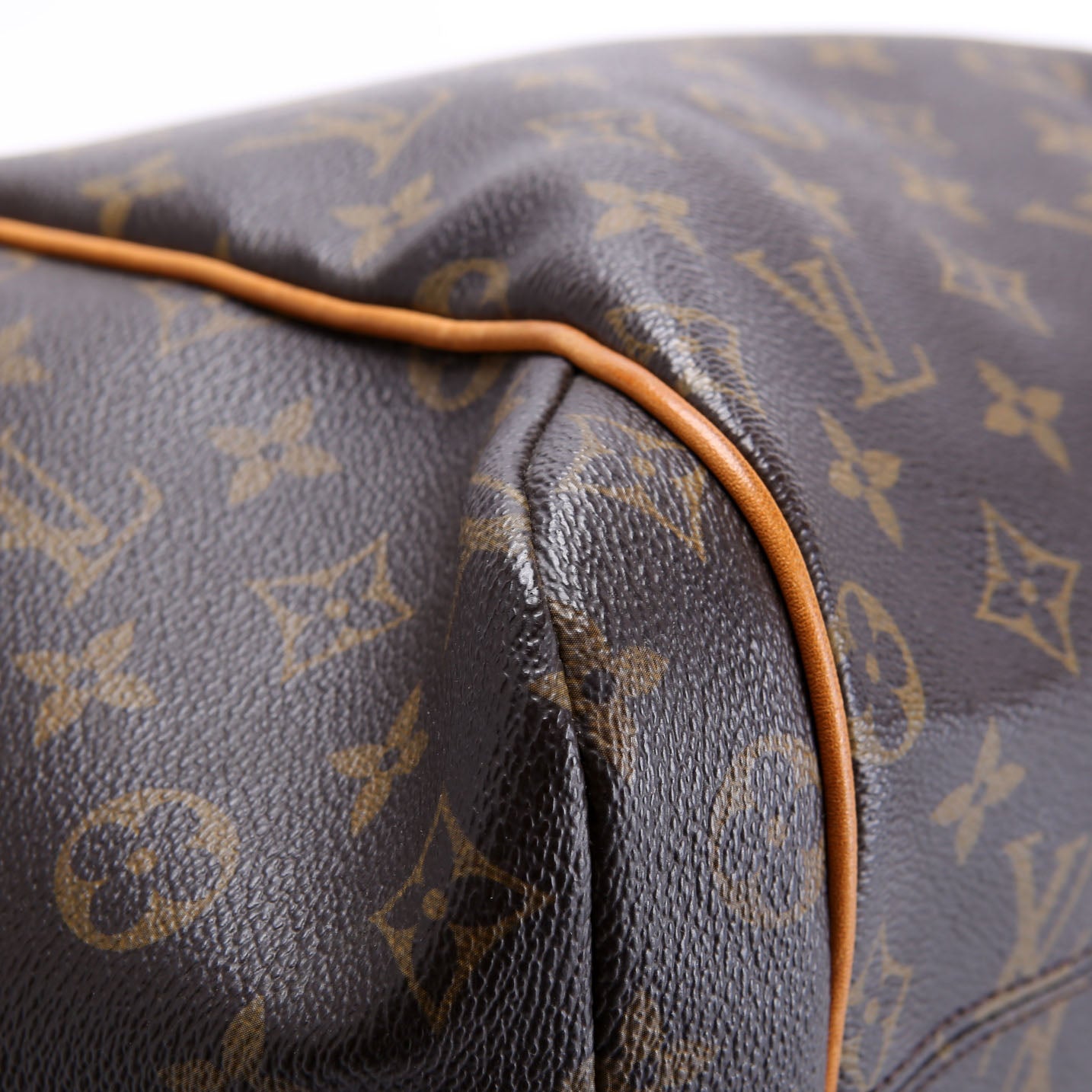 Exterior: The exterior has piping discoloration and wear on all four corners of the base. The leather throughout has discoloration. The exterior features two side open pockets.