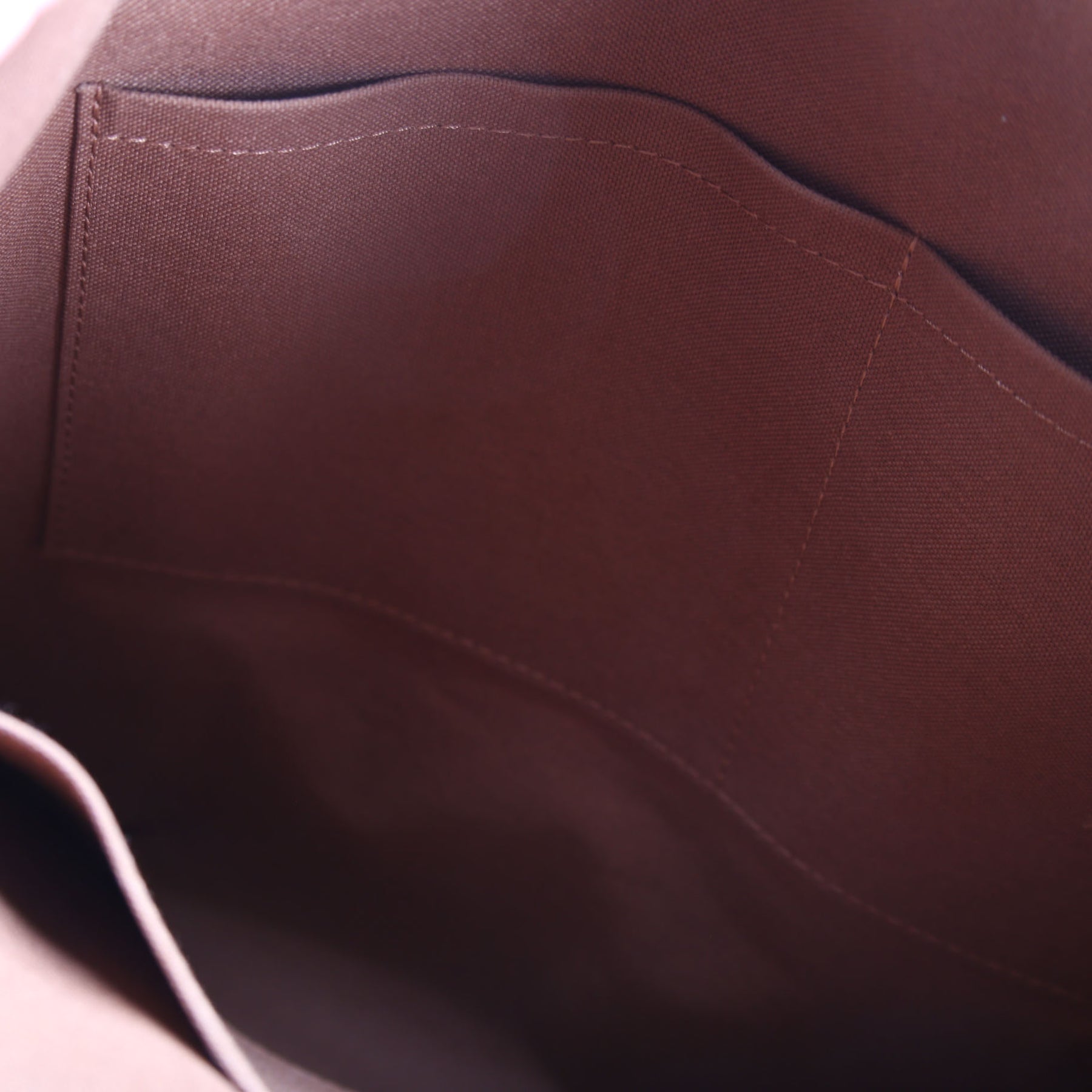 Exterior: The exterior canvas is free of any major signs of wear. The leather trim shows discoloration and wear throughout. The exterior features two open pockets.
