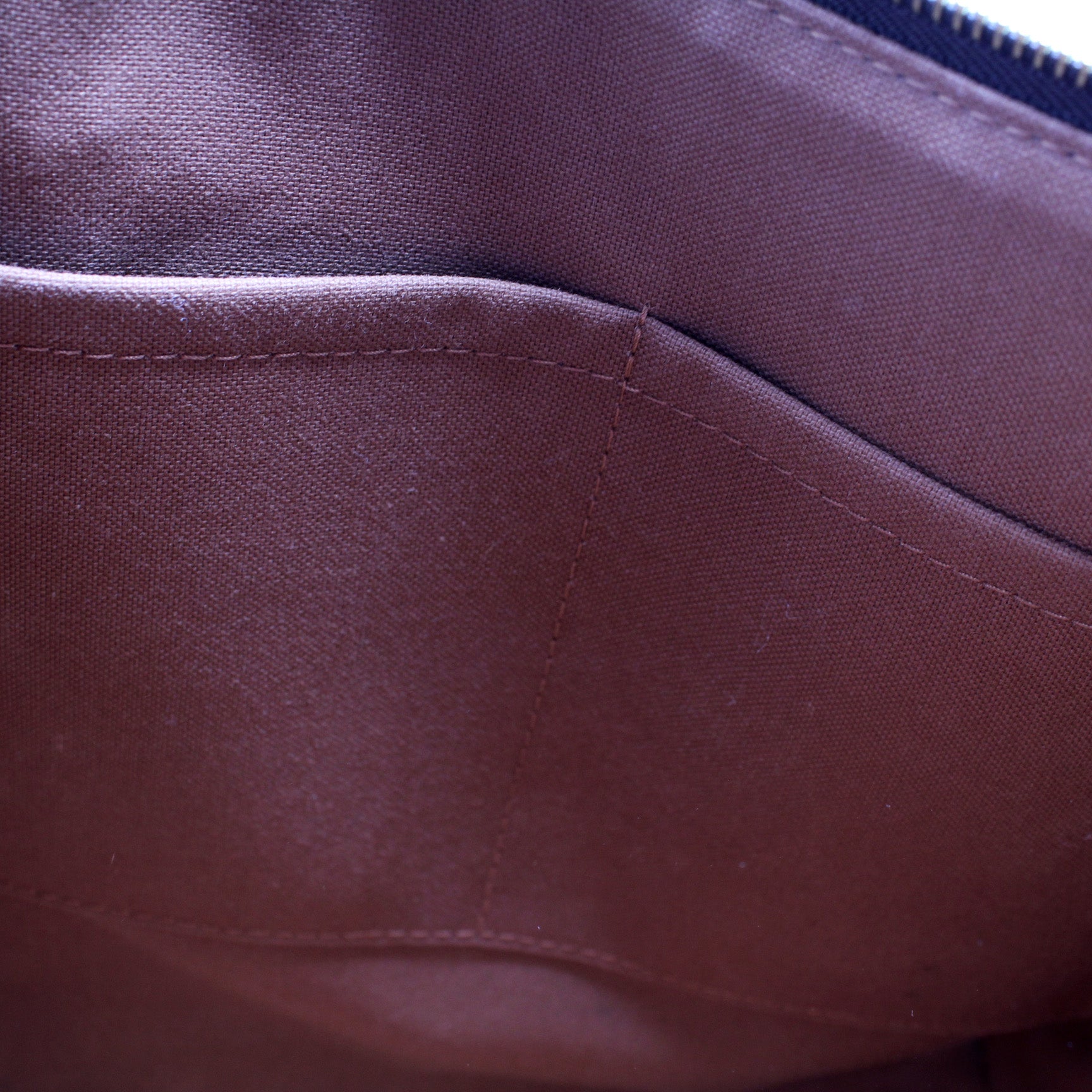 Exterior: The exterior coated canvas is free of any rips or cracks, there are minor scuffs and stains throughout. The exterior features two open pockets. The leather trim and tabs show minor wear and discoloration.