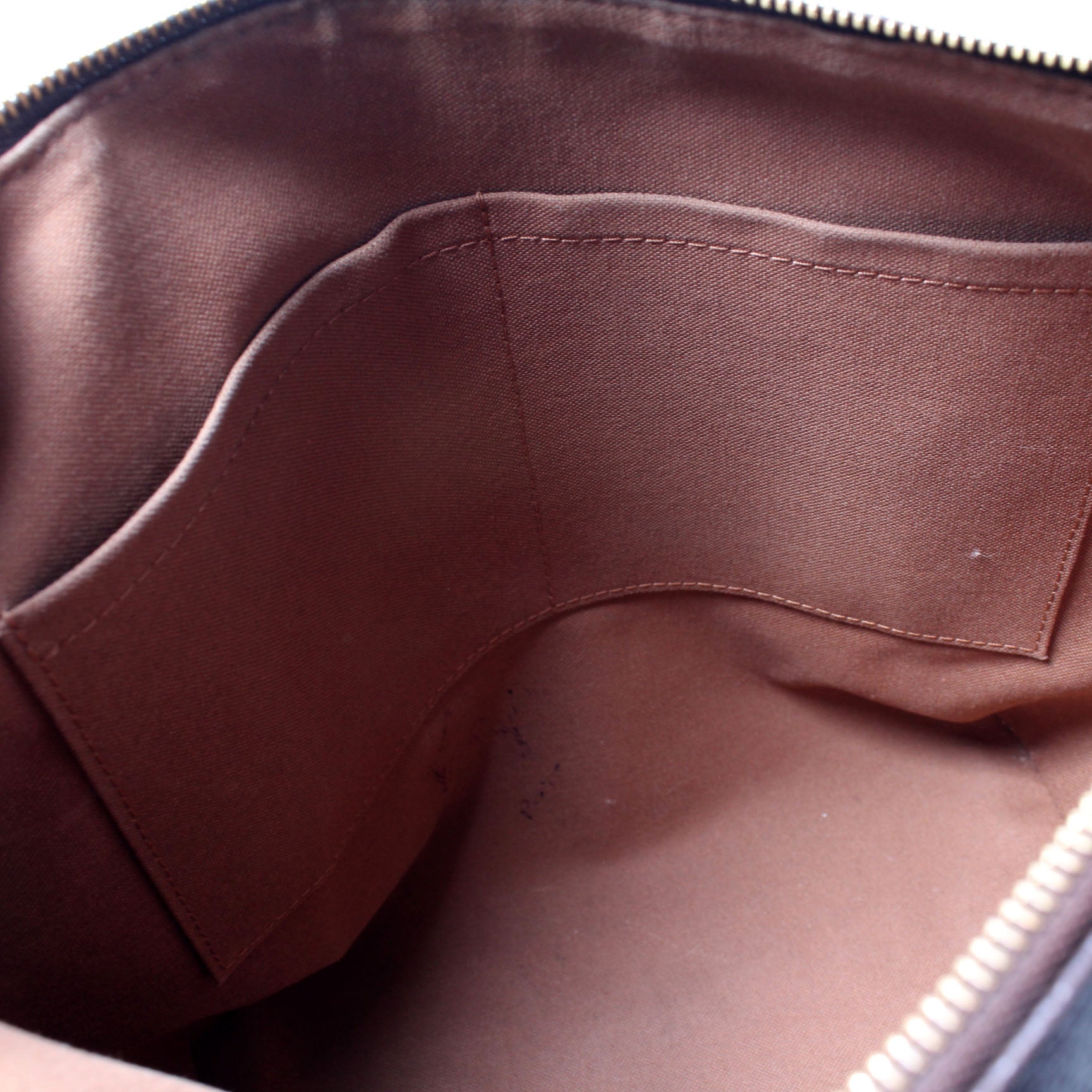 Exterior: The exterior coated canvas is free of any rips or cracks. The corners and leather detail show minor signs of wear as pictured. The exterior features two open pockets.
