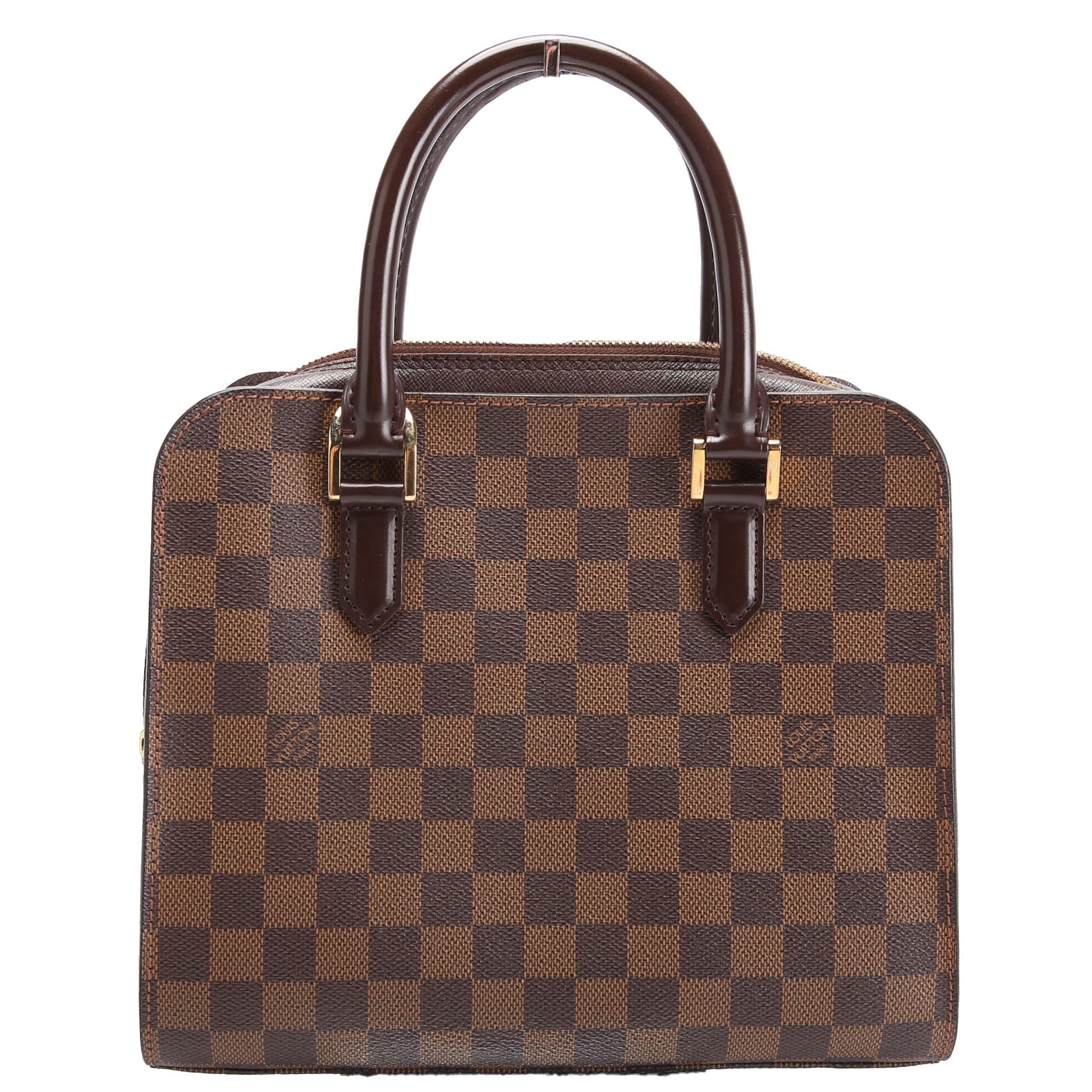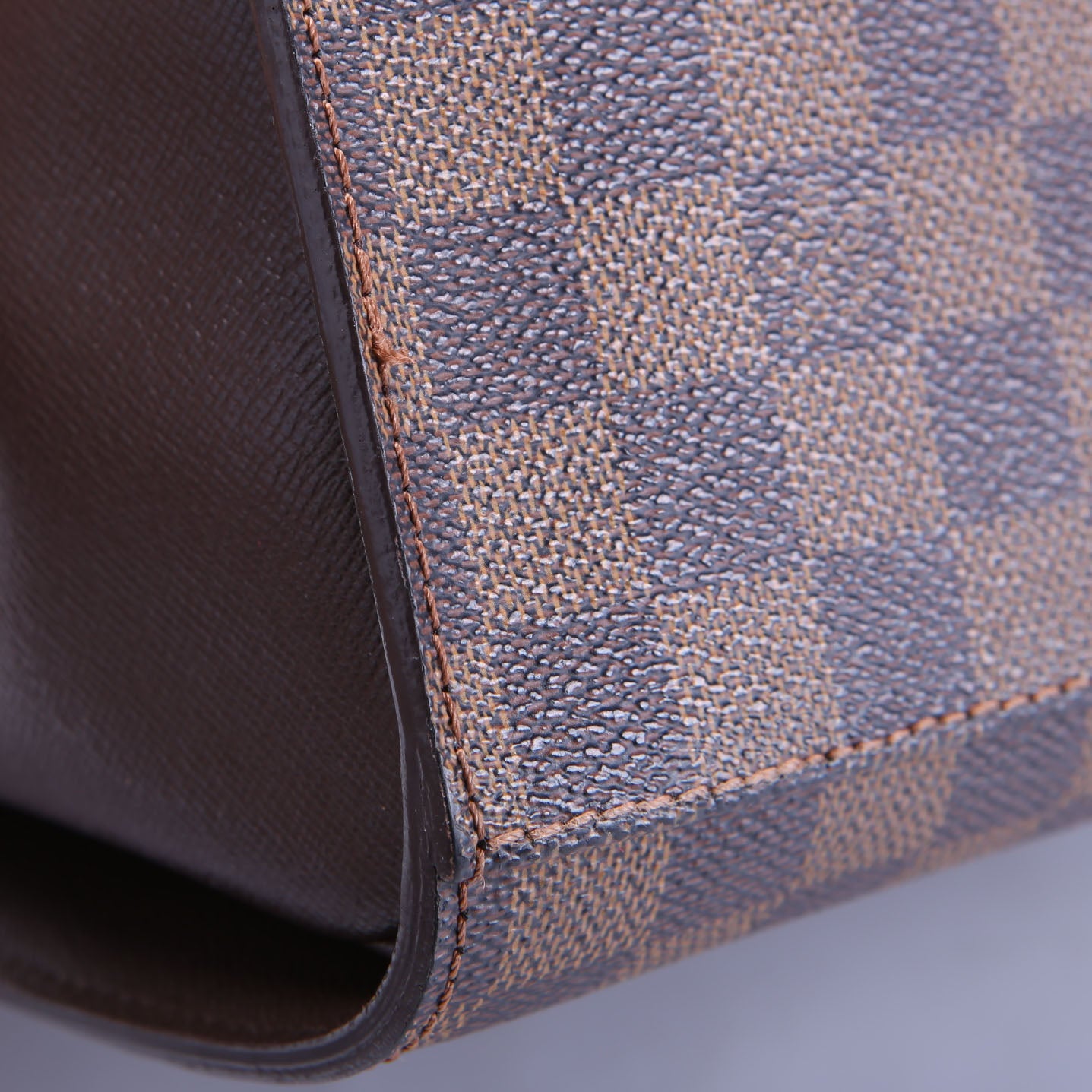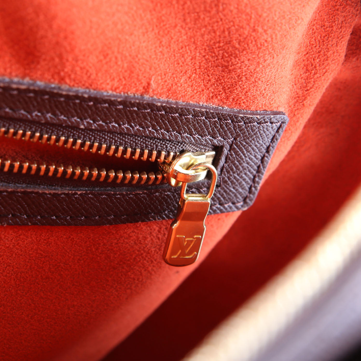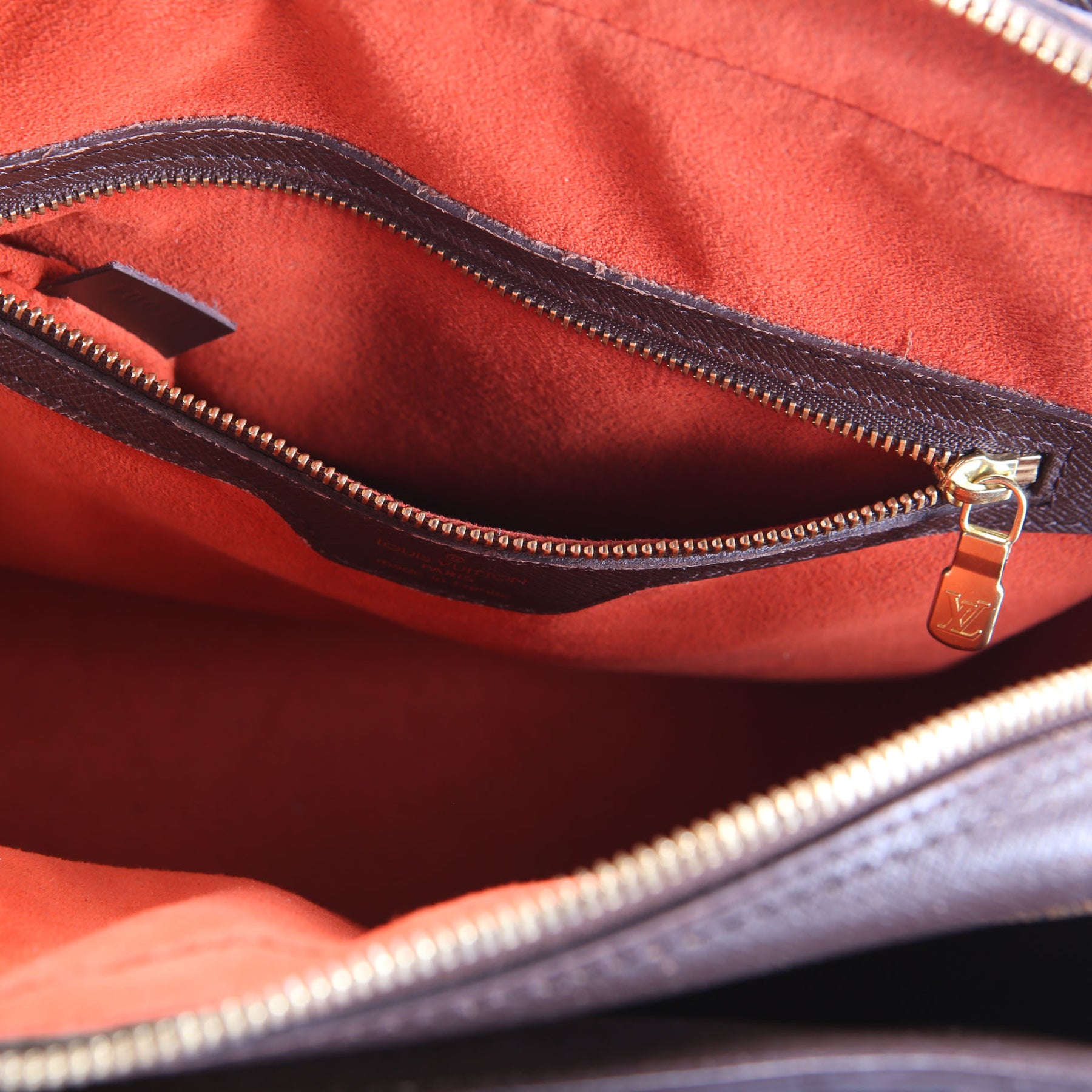 This pre-owned Louis Vuitton Triana is guaranteed 100% authentic. The exterior is in the classic Louis Vuitton Damier Ebene coated canvas.