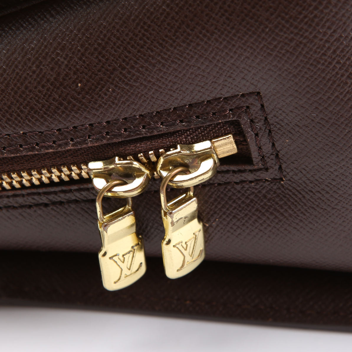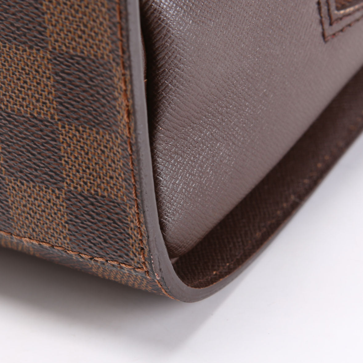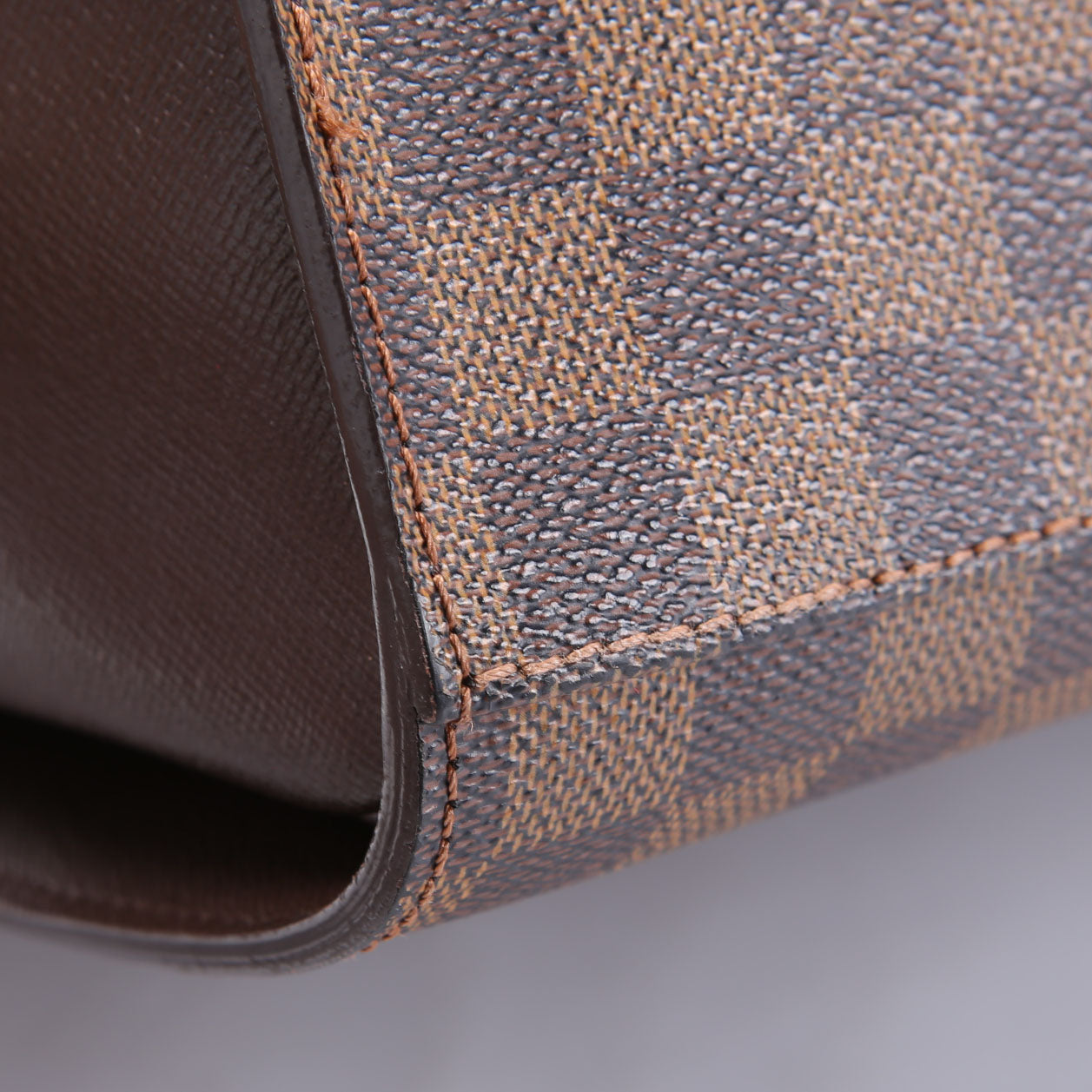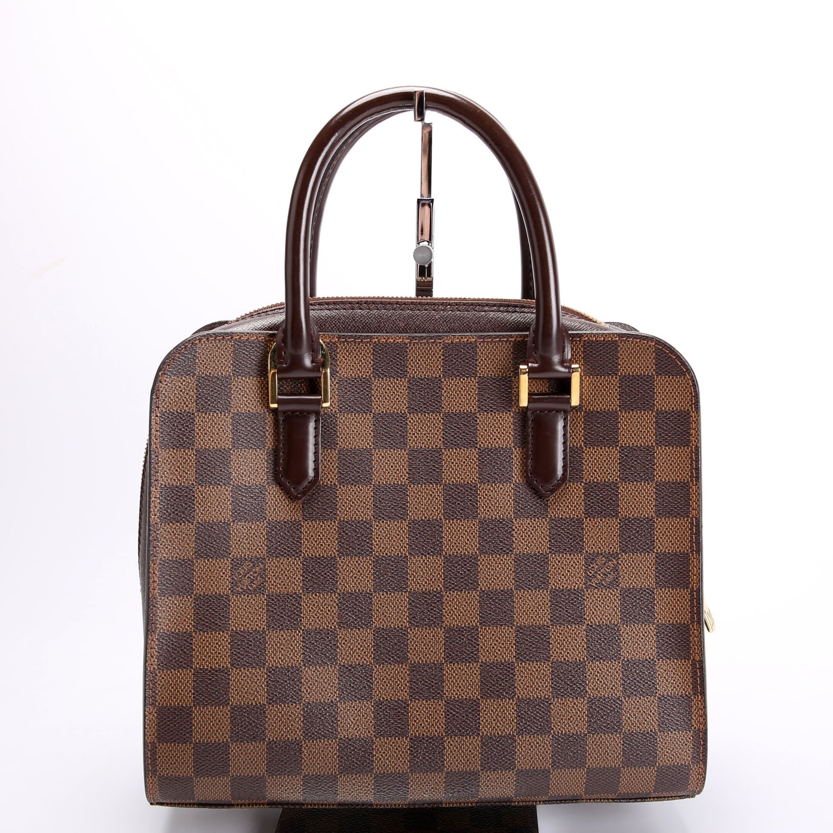 This pre-owned Louis Vuitton Triana is guaranteed 100% authentic. The exterior is in the classic Louis Vuitton Damier Ebene coated canvas.