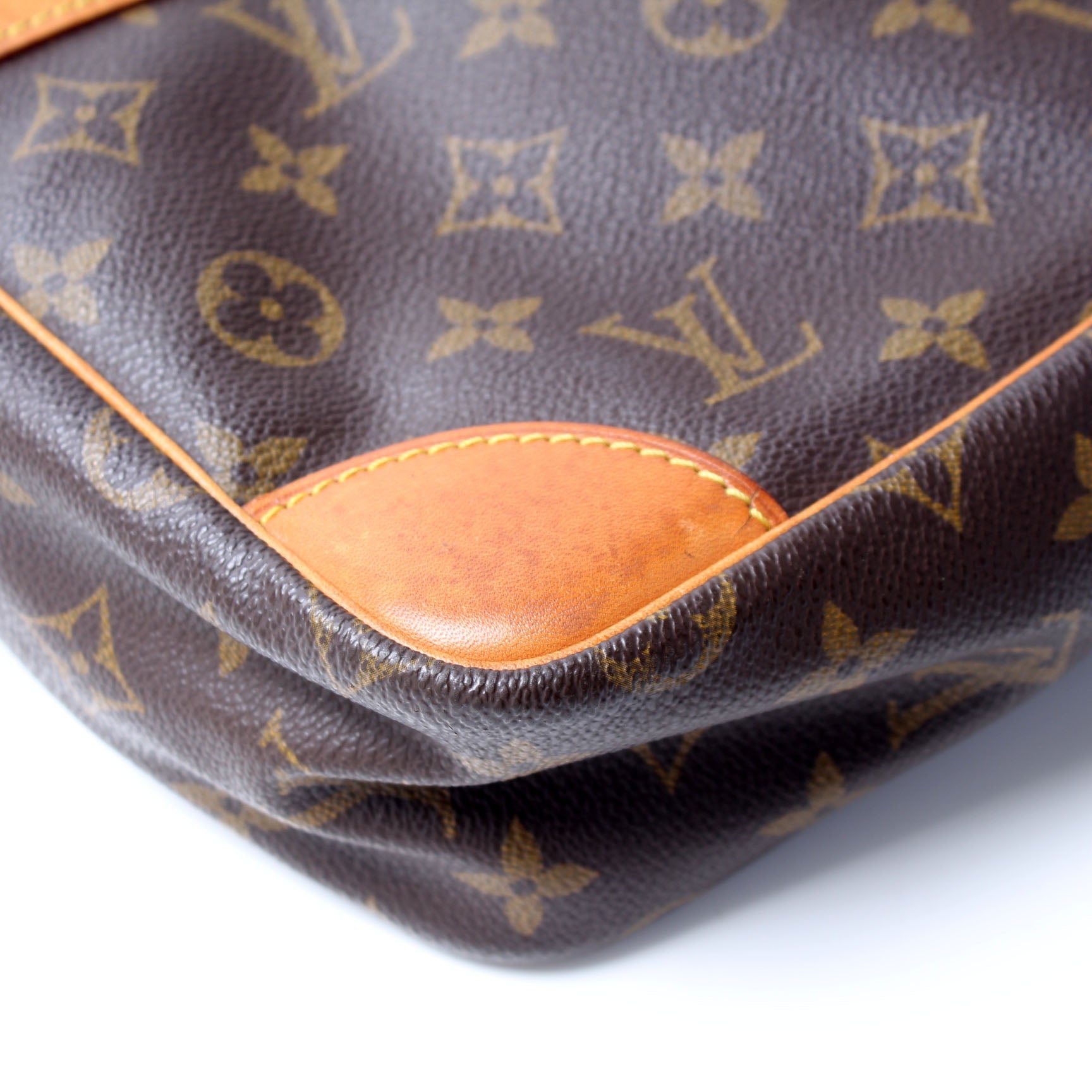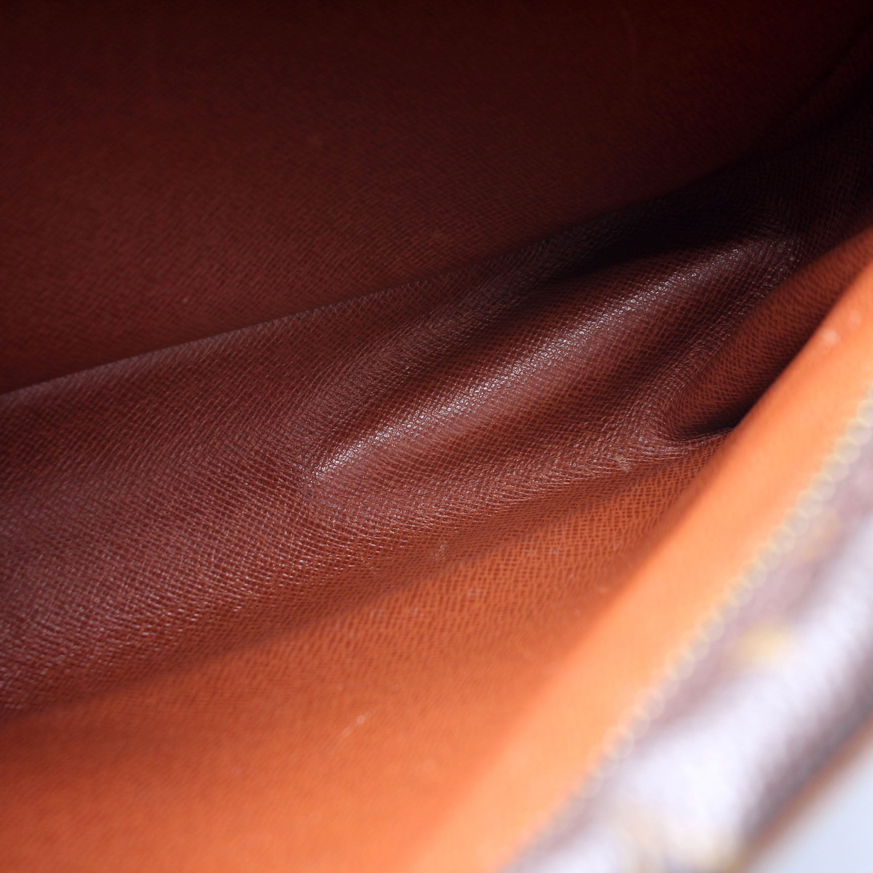 Exterior: The exterior coated canvas is free of any rips or cracks. The leather details show signs of wear.
