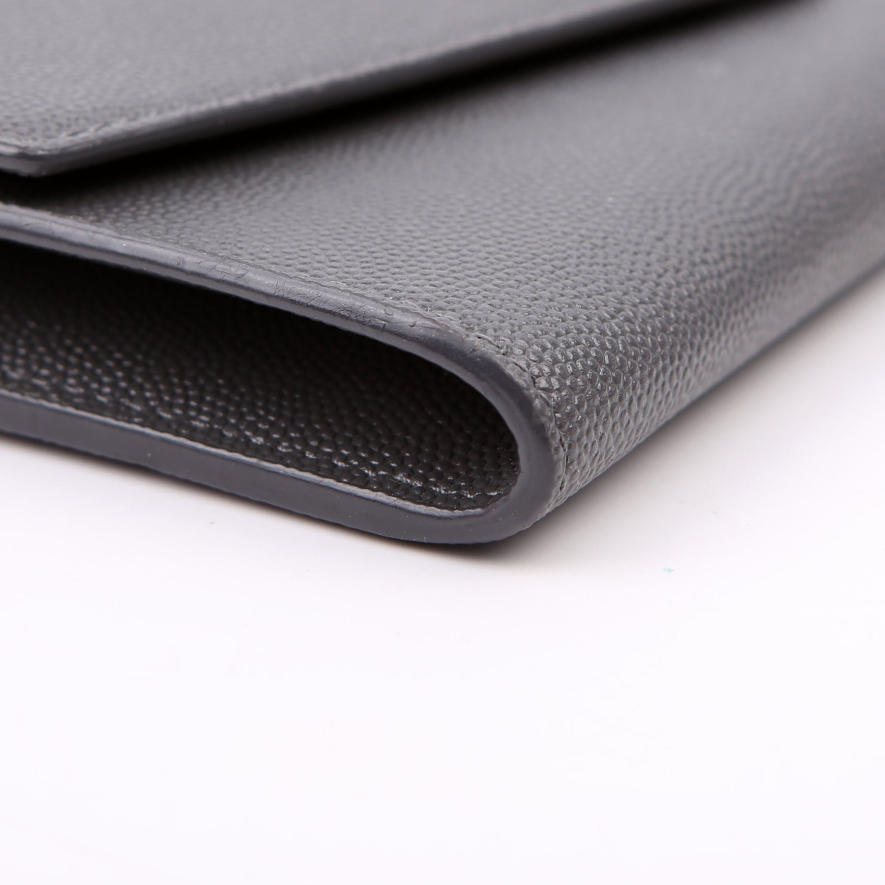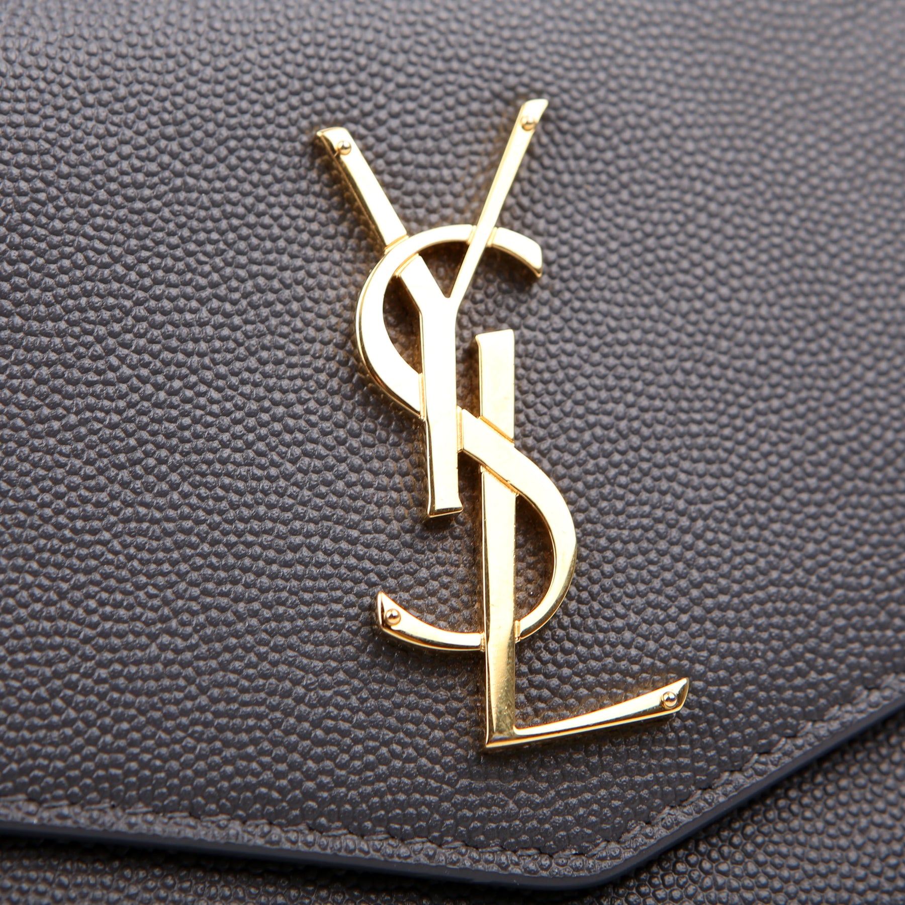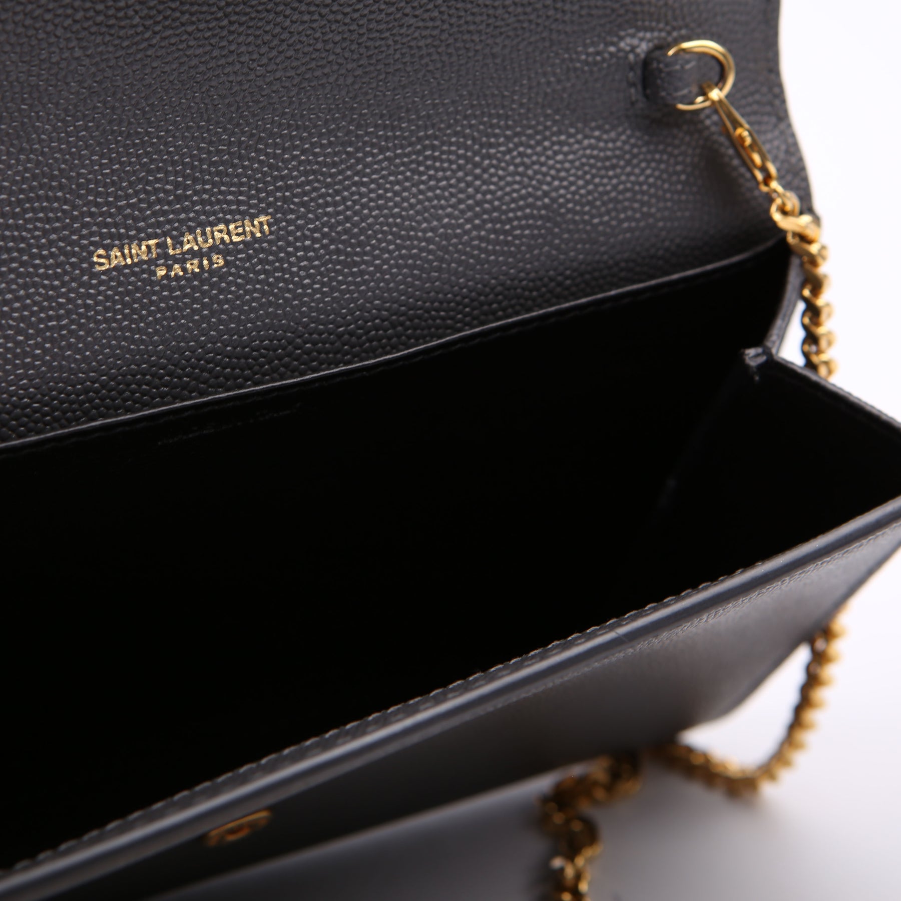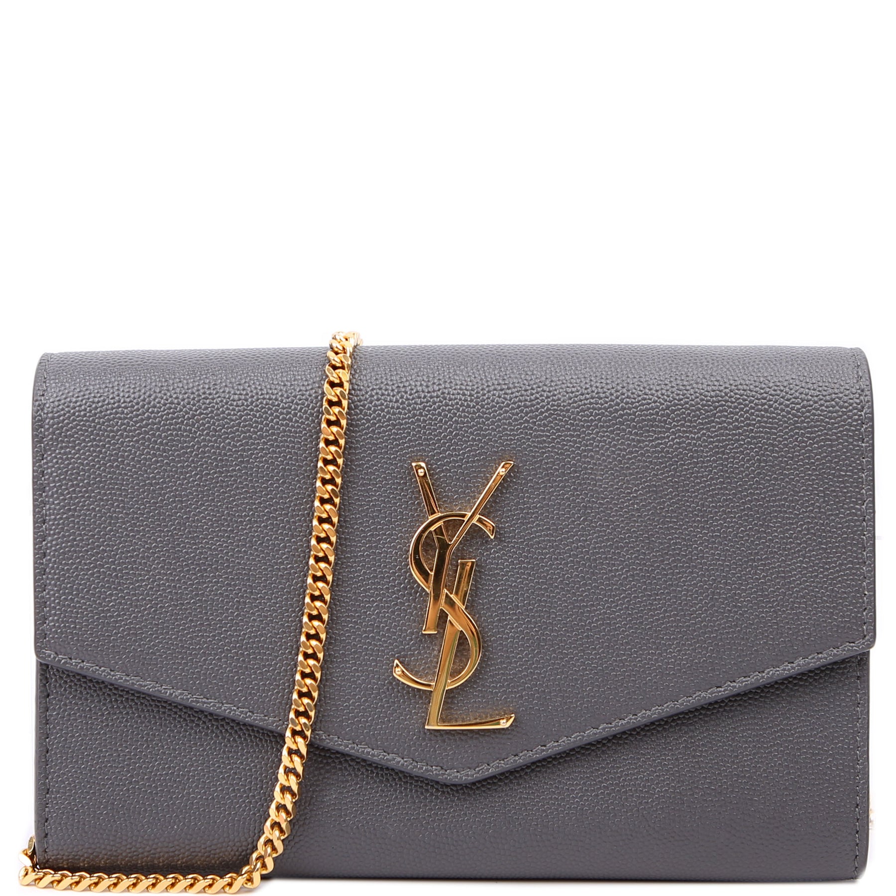 This pre-owned Saint Laurent Uptown Chain Wallet is guaranteed 100% authentic. The exterior is in the classic Saint Laurent Grain De Poudre leather.