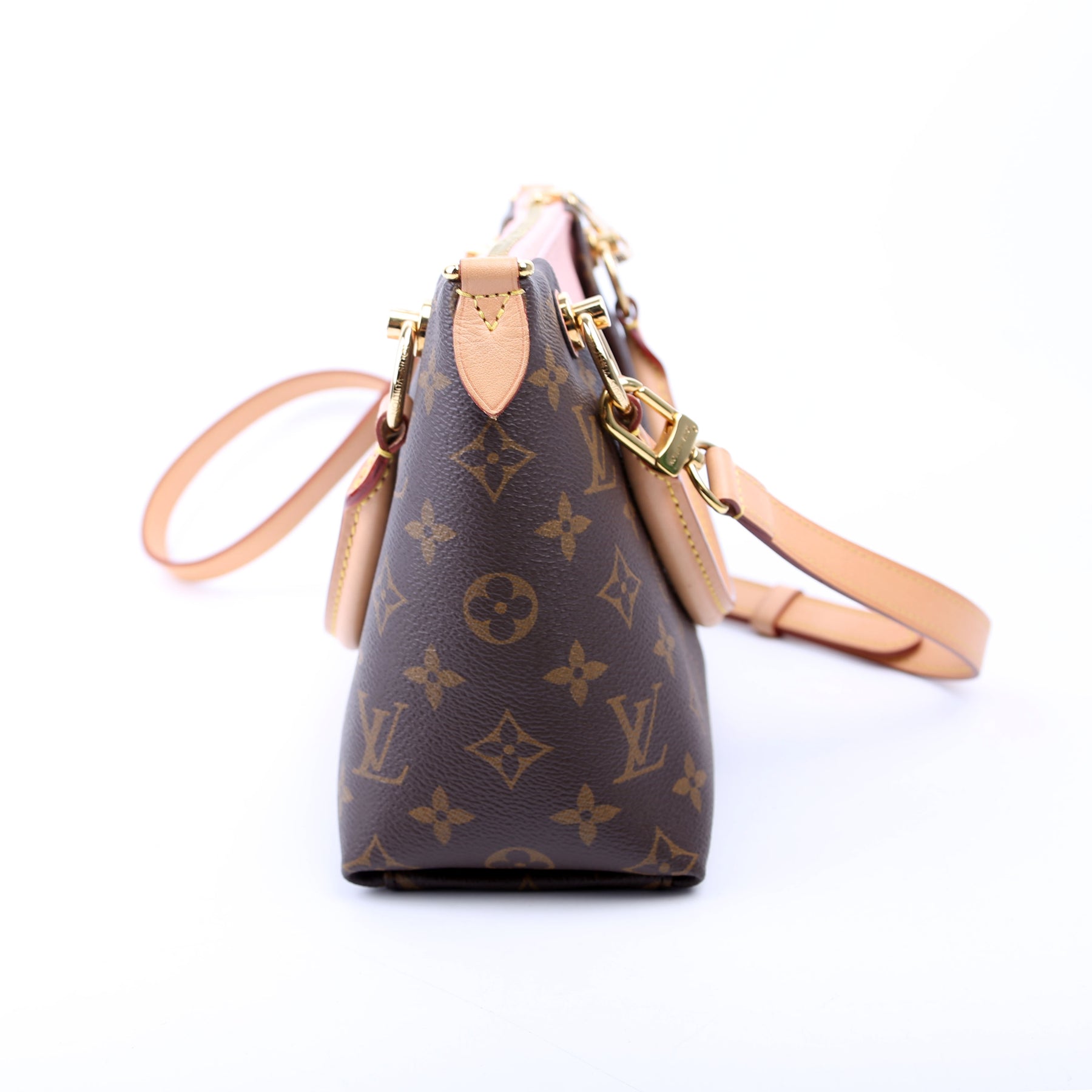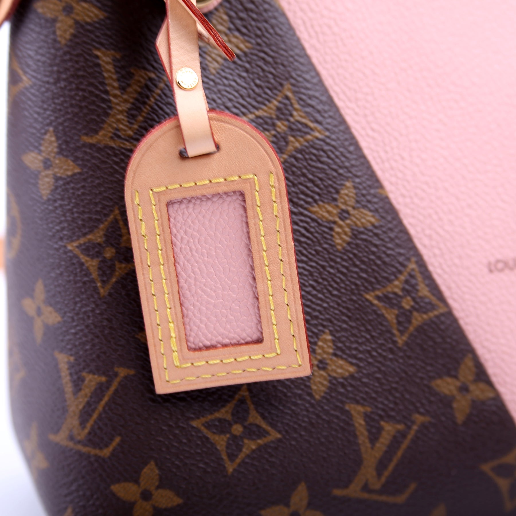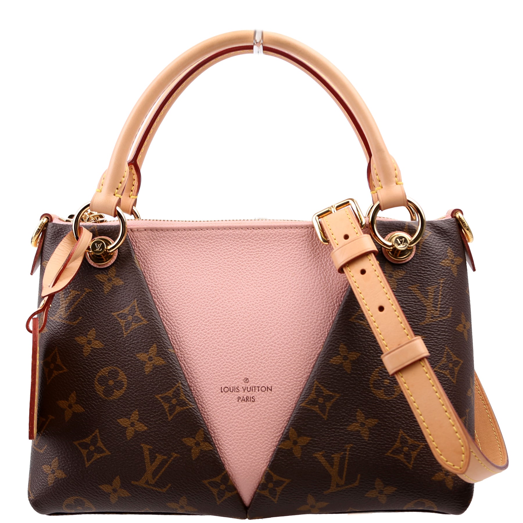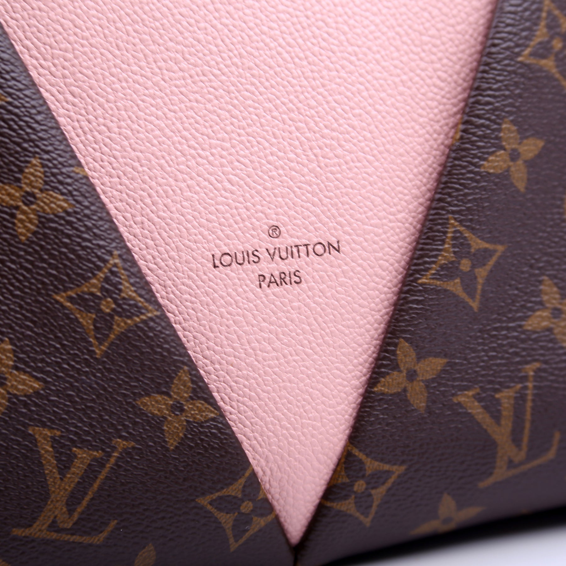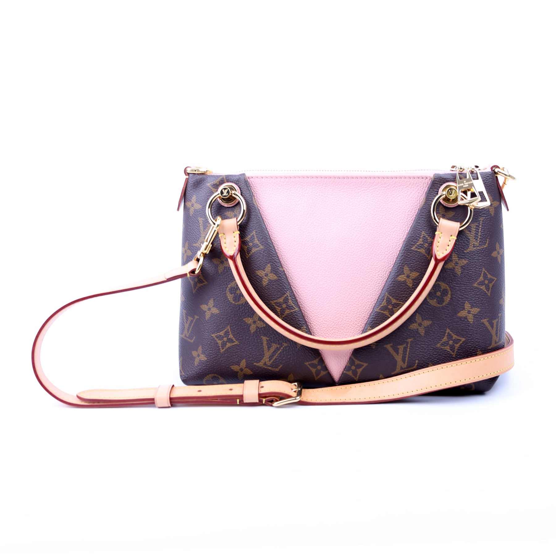 This pre-owned Louis Vuitton V Tote BB is guaranteed 100% authentic. The exterior is in the classic Louis Vuitton Monogram Coated Canvas