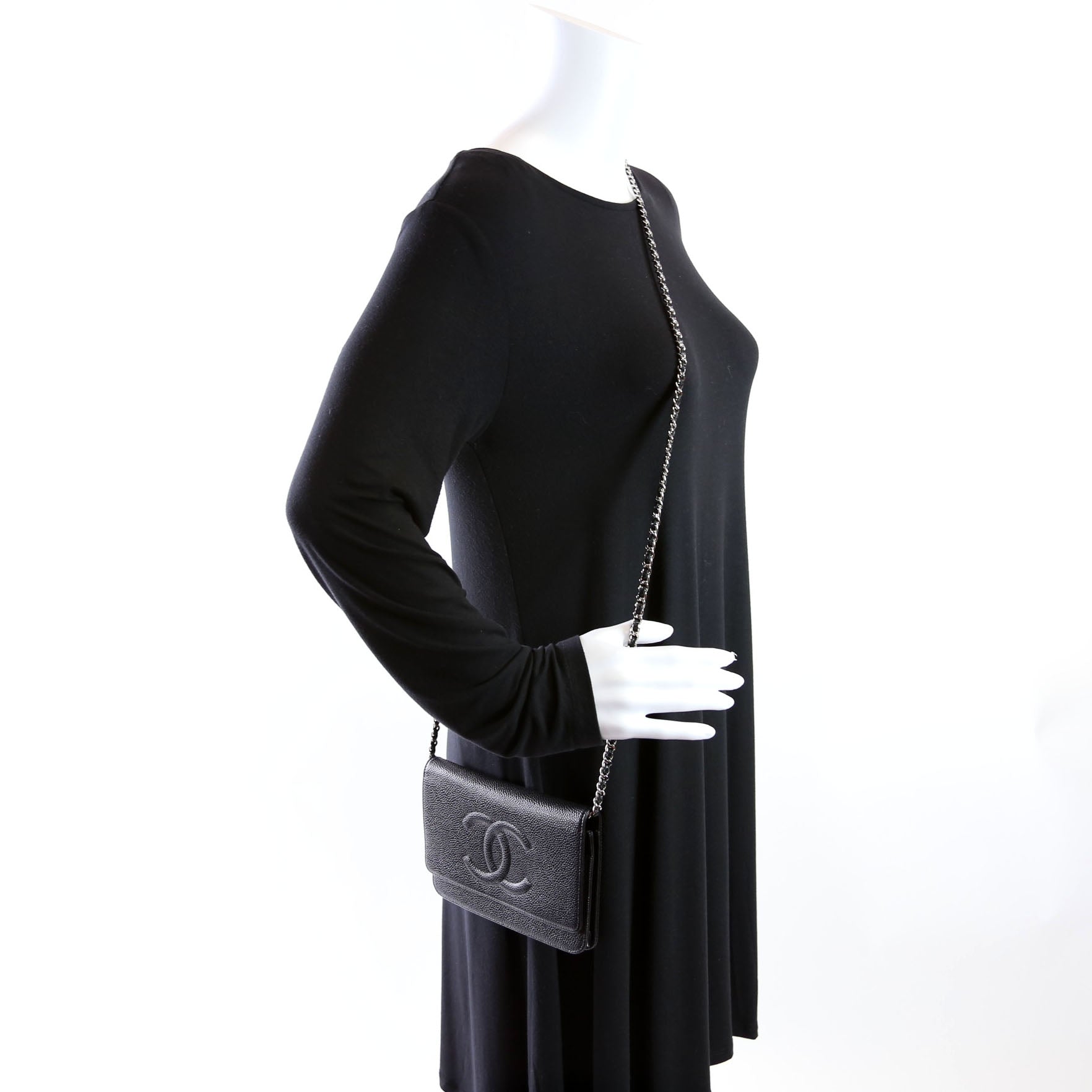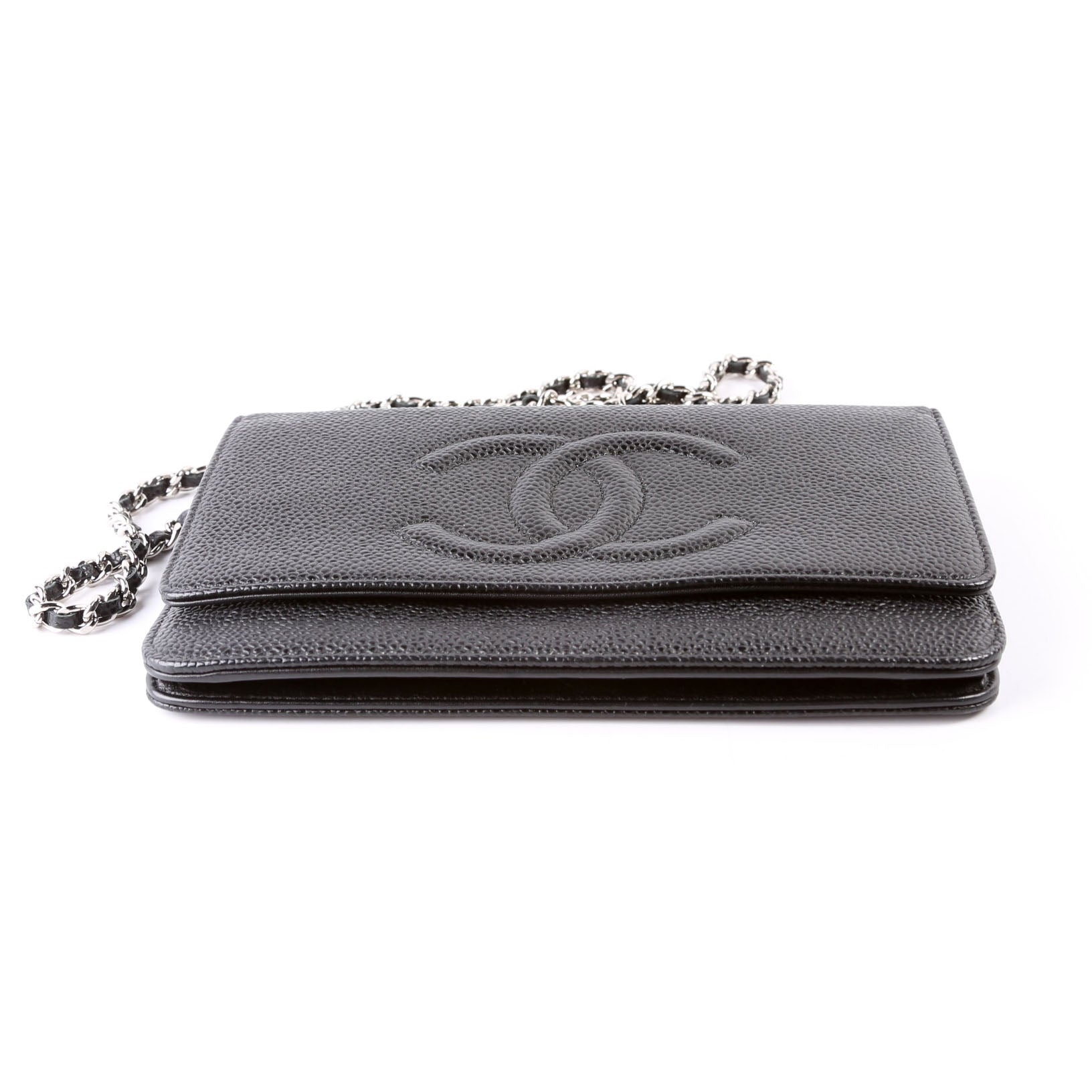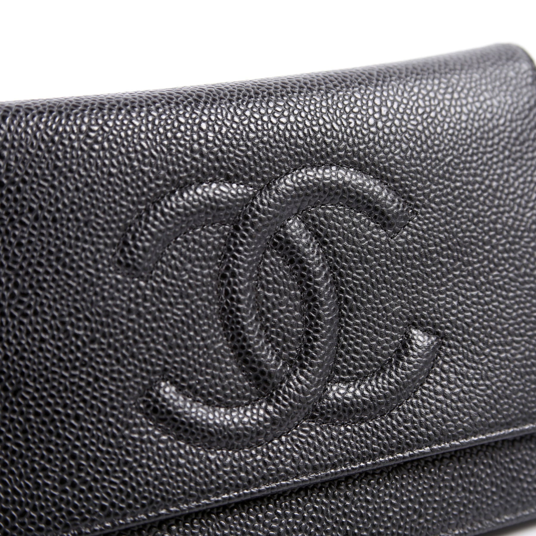 This pre-owned Chanel WOC Timeless CC is guaranteed 100% authentic. The exterior is in the classic Chanel Caviar leather.