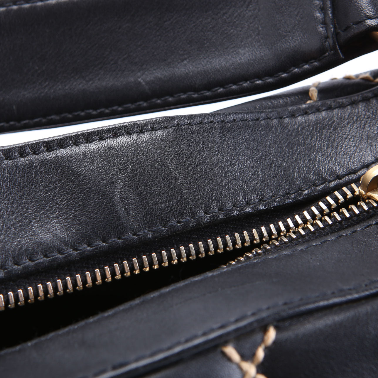 Handle: The leather on the handle shows scuffs and scratches throughout. The hardware shows light scratches.