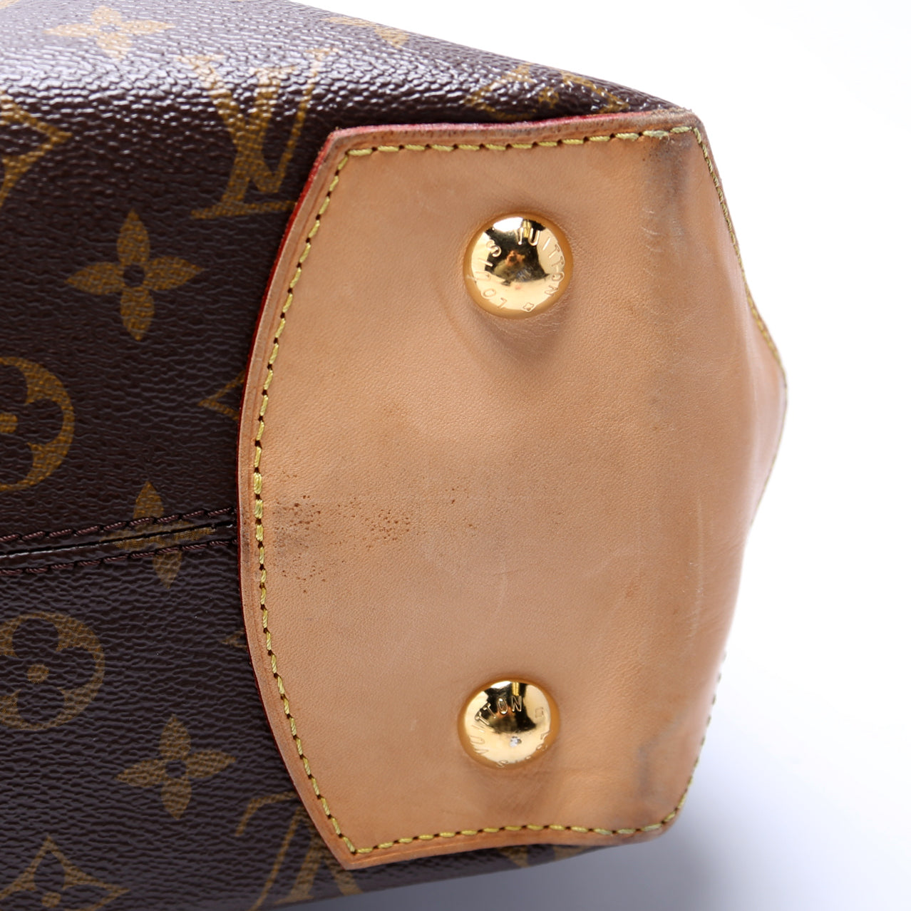 Handle: The leather handles show wear and discoloration.