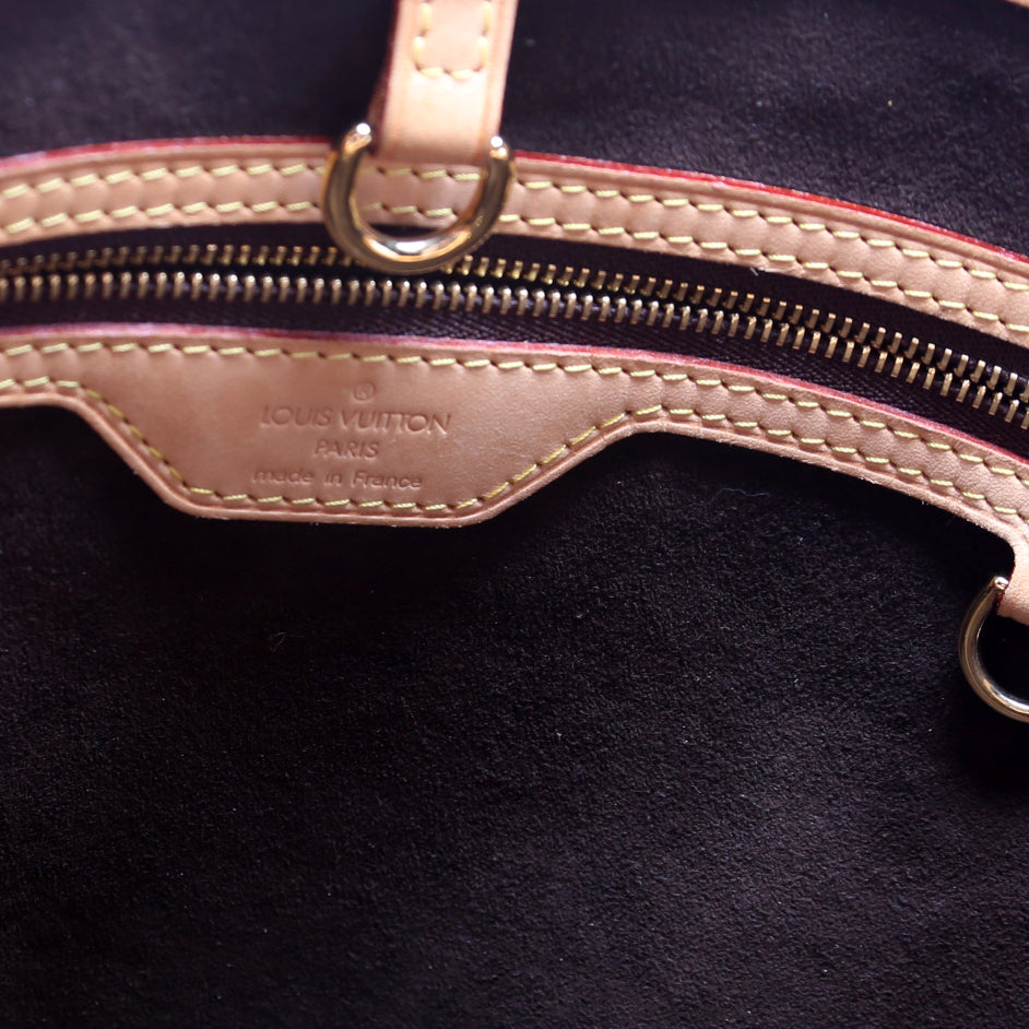 This pre-owned Louis Vuitton Wilshire MM is guaranteed 100% authentic. The exterior is in the classic Louis Vuitton Monogram coated canvas.