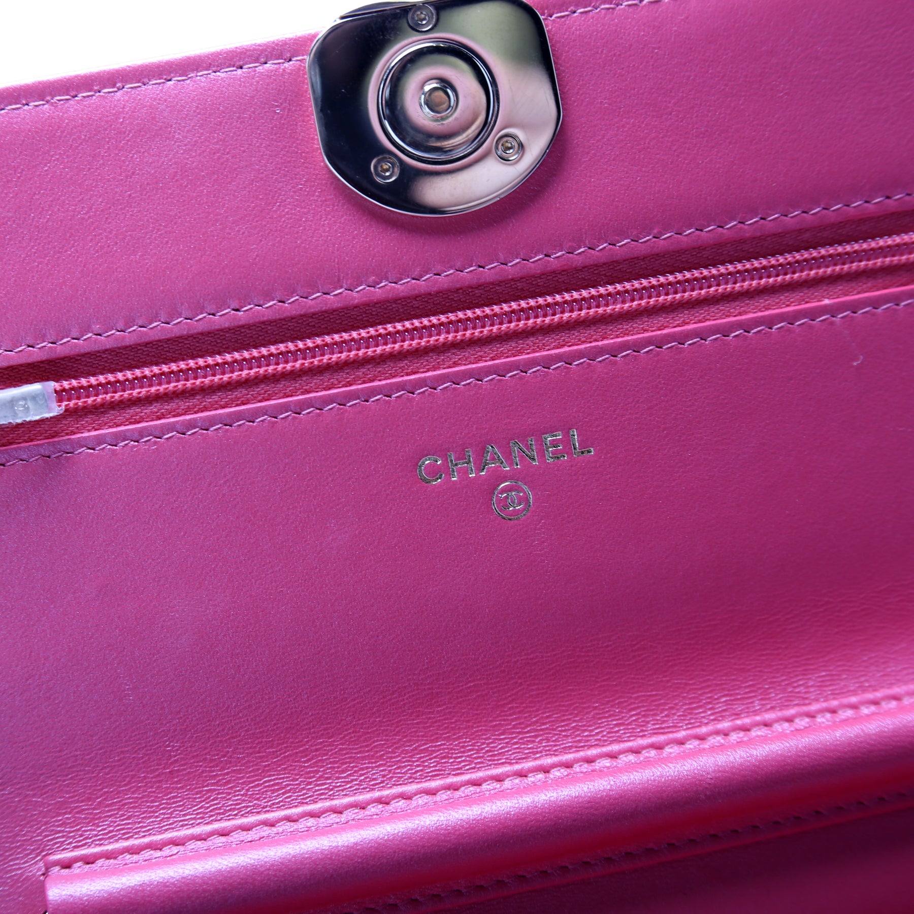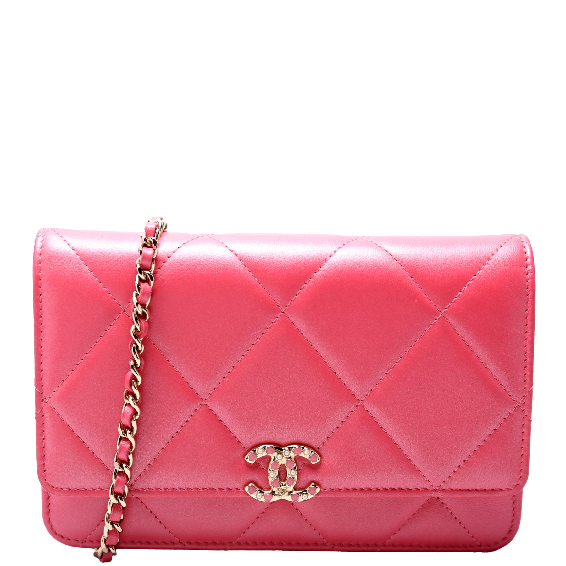 This pre-owned Chanel WOC Pearl CC is guaranteed 100% authentic. The exterior is in the classic Chanel Lambskin leather.