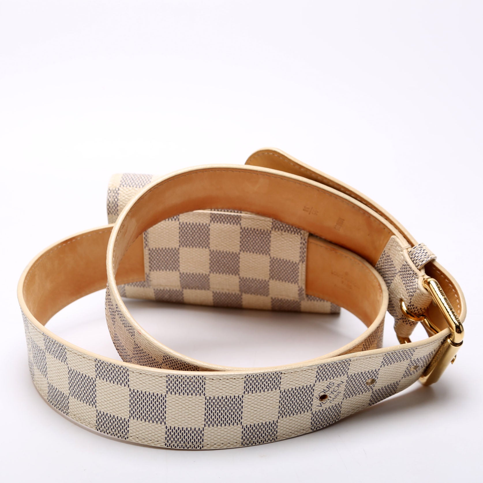 This pre-owned Louis Vuitton Ceinture Solo Belt Bag is guaranteed 100% authentic. The exterior is in the classic Louis Vuitton Damier Azur coated canvas.