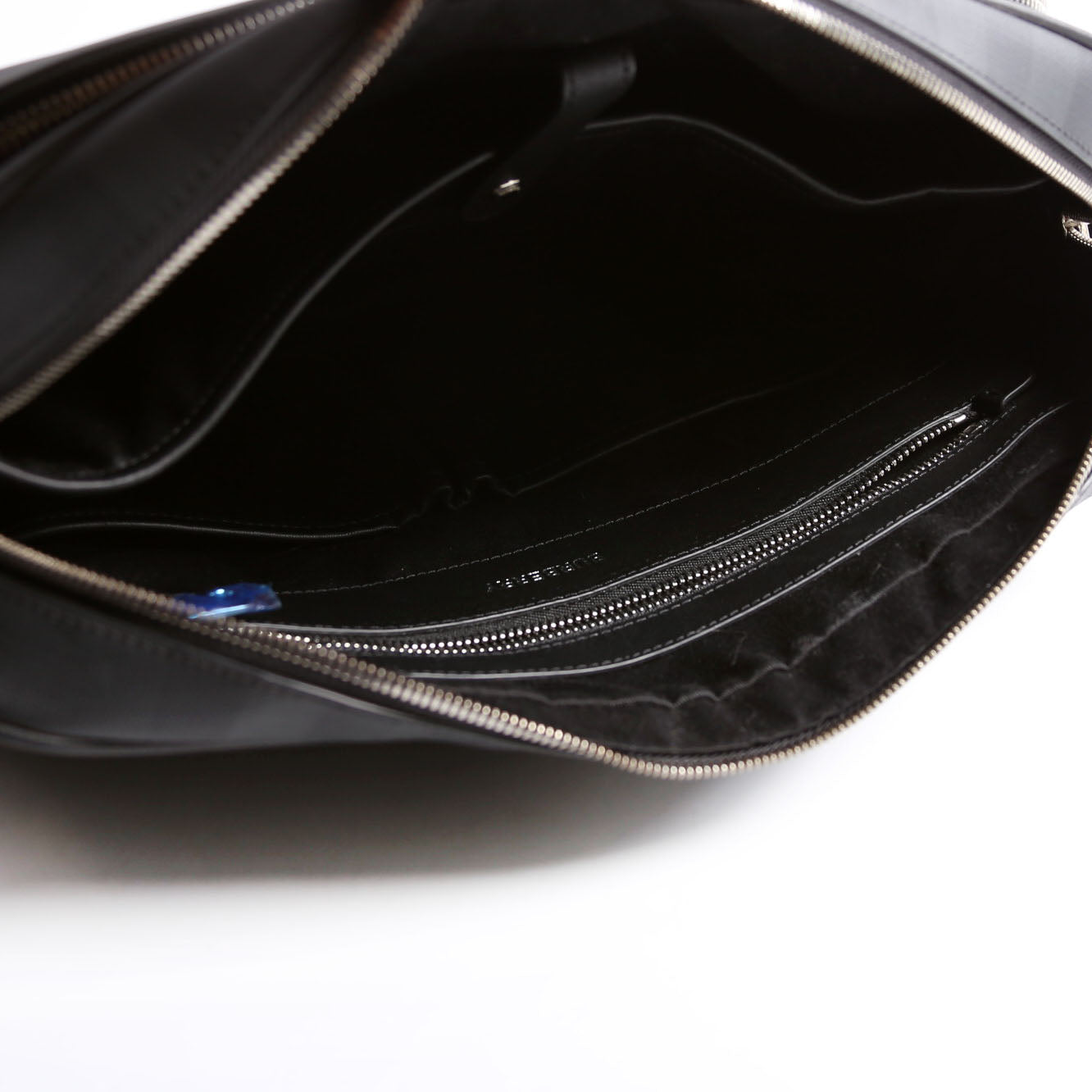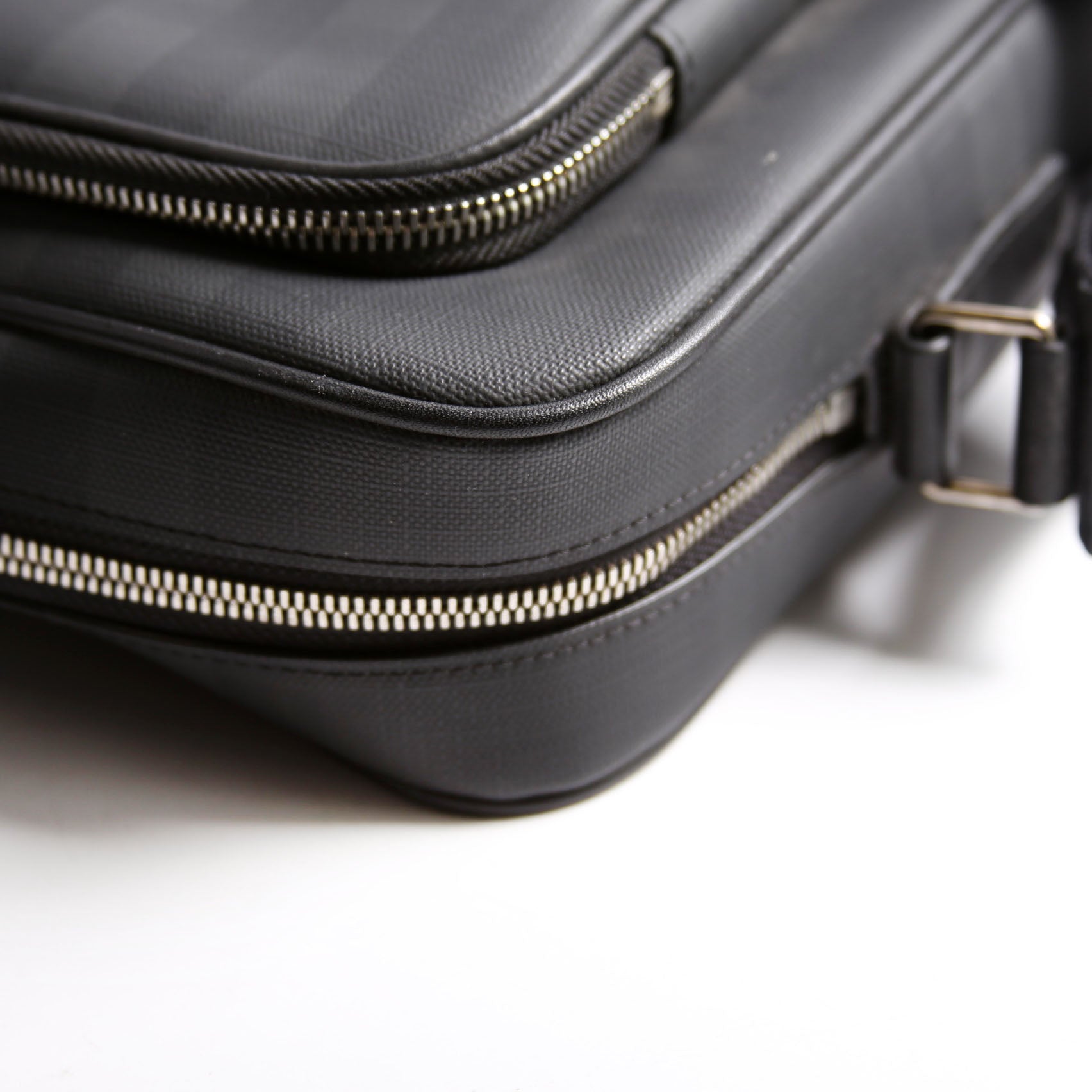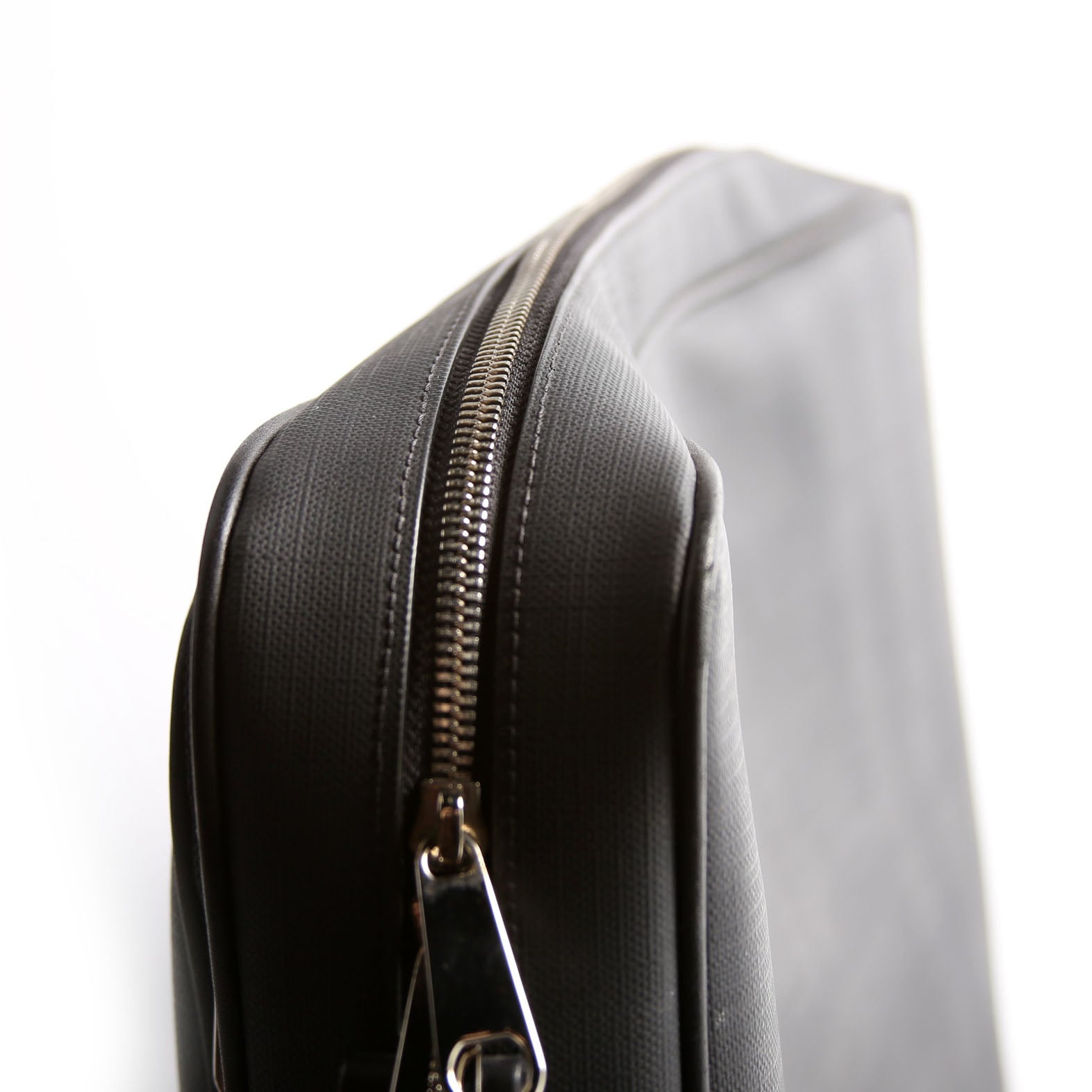 Exterior: The exterior coated canvas shows light wear to the coating throughout. The corners show wear and rubbing. The top is slightly misshapen from storage and wear. It features one zip closure pocket.