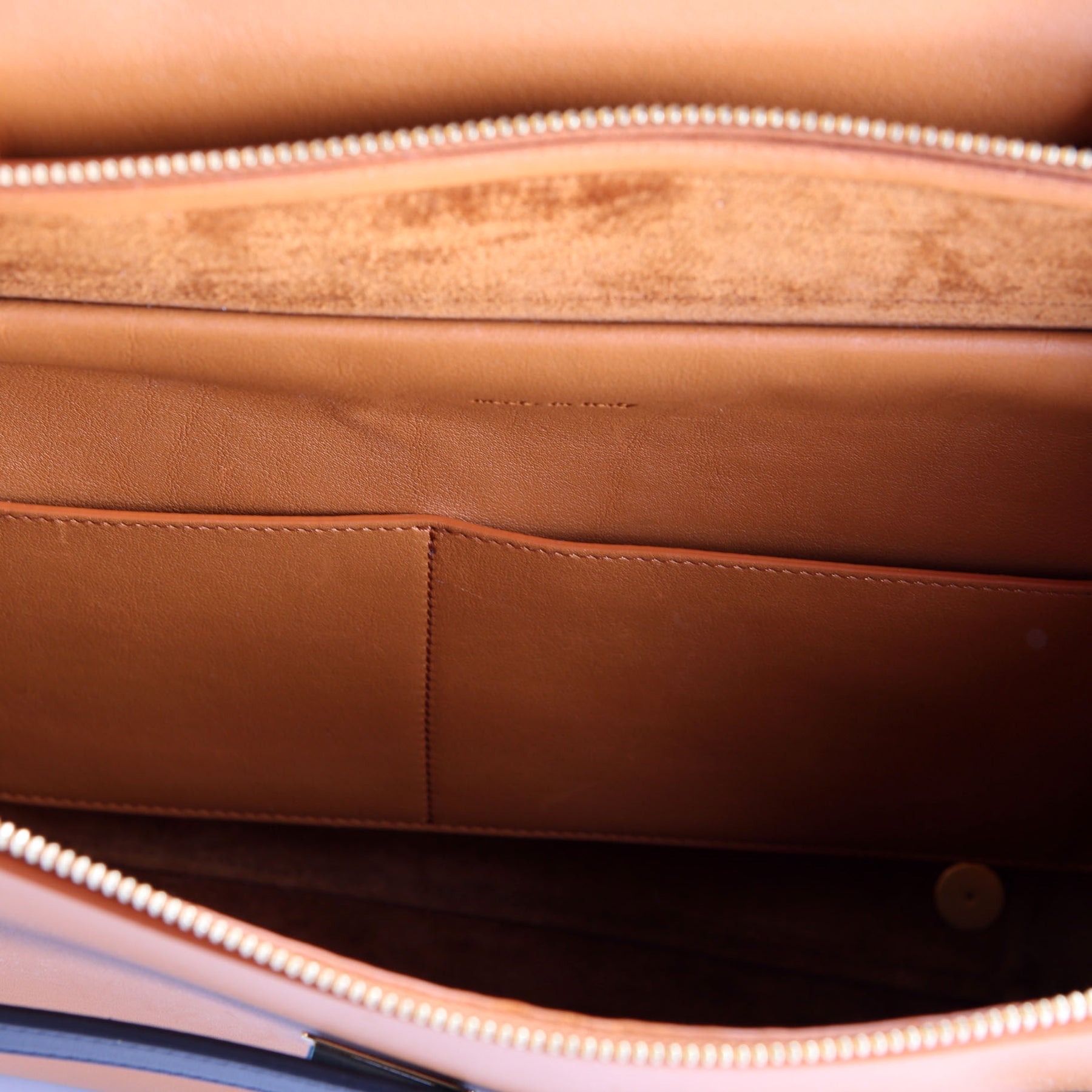 Exterior: The exterior leather shows light scuffs throughout. The corners shows light wear. The exterior features one zip back pocket.