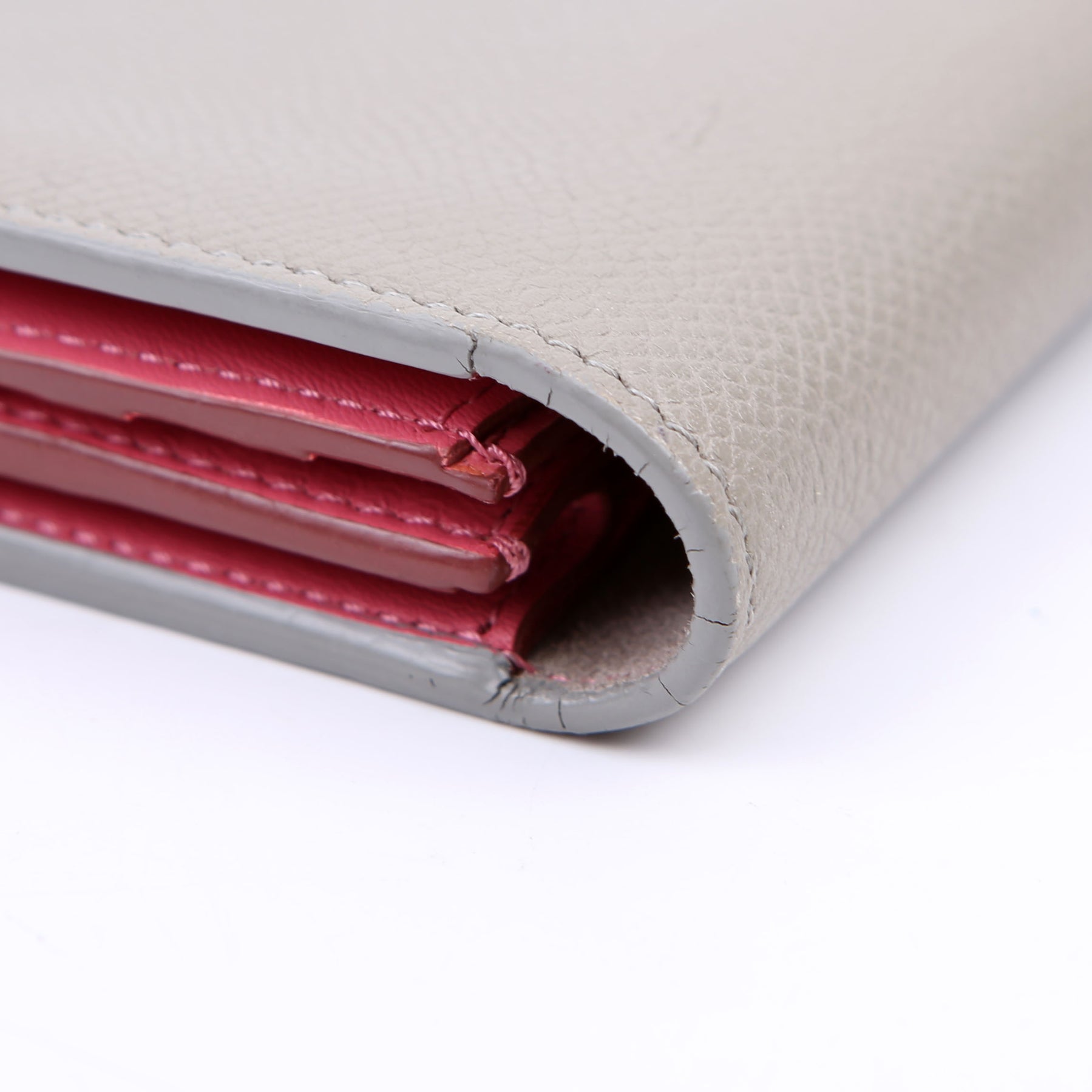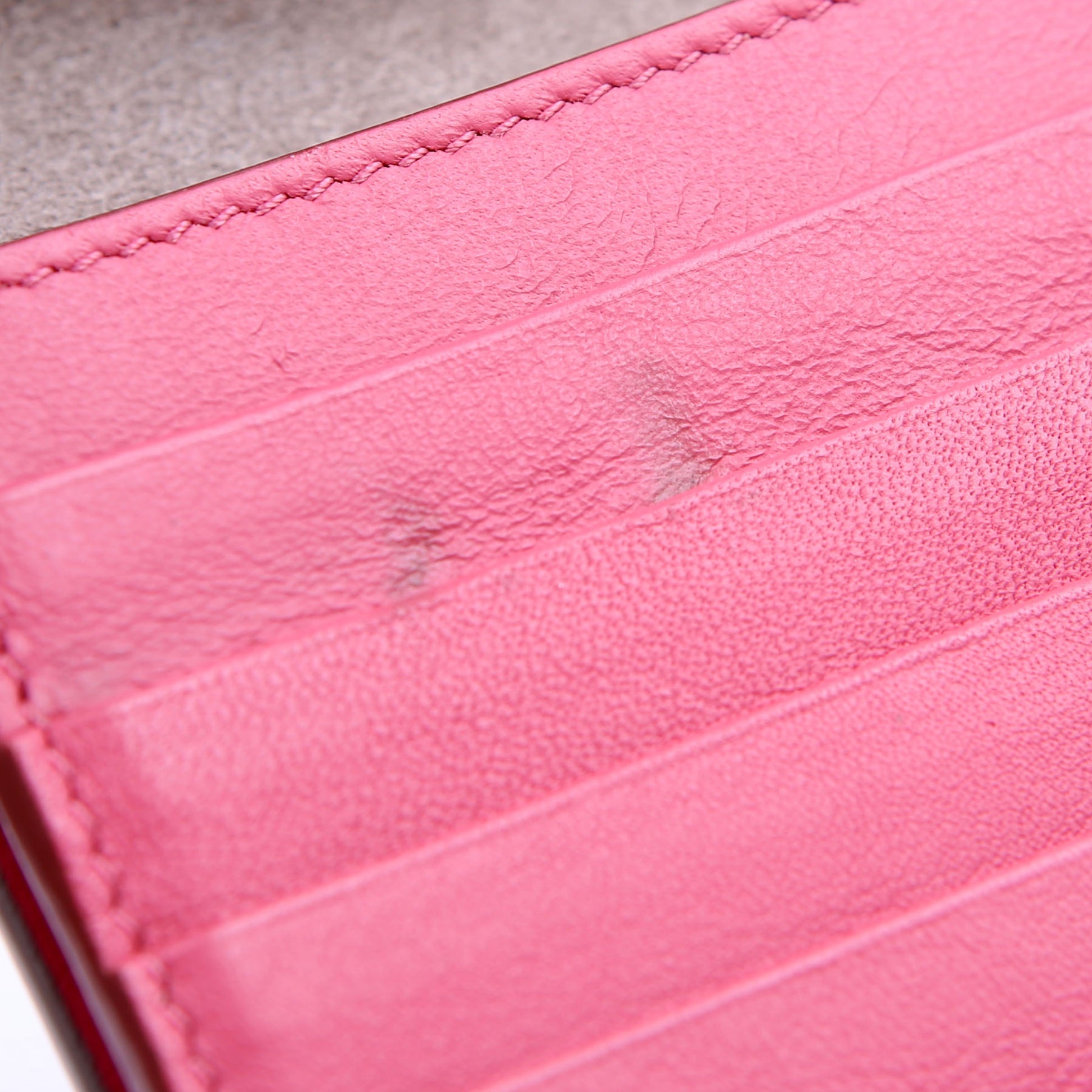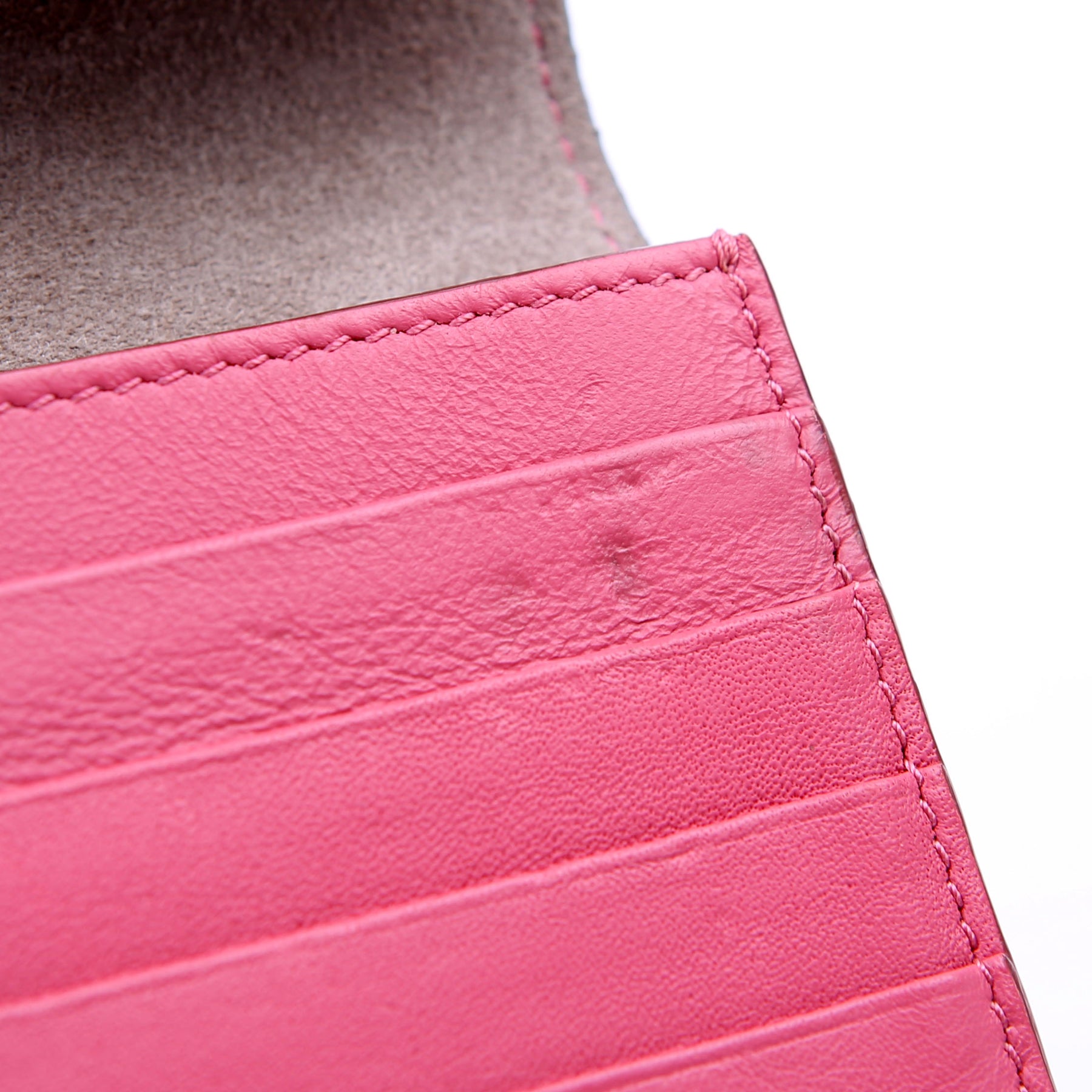 Interior: The interior has minor indents and stains throughout. The suede shows minor wear. The interior features ten card slots, one zip coin pouch, and three bill slots.