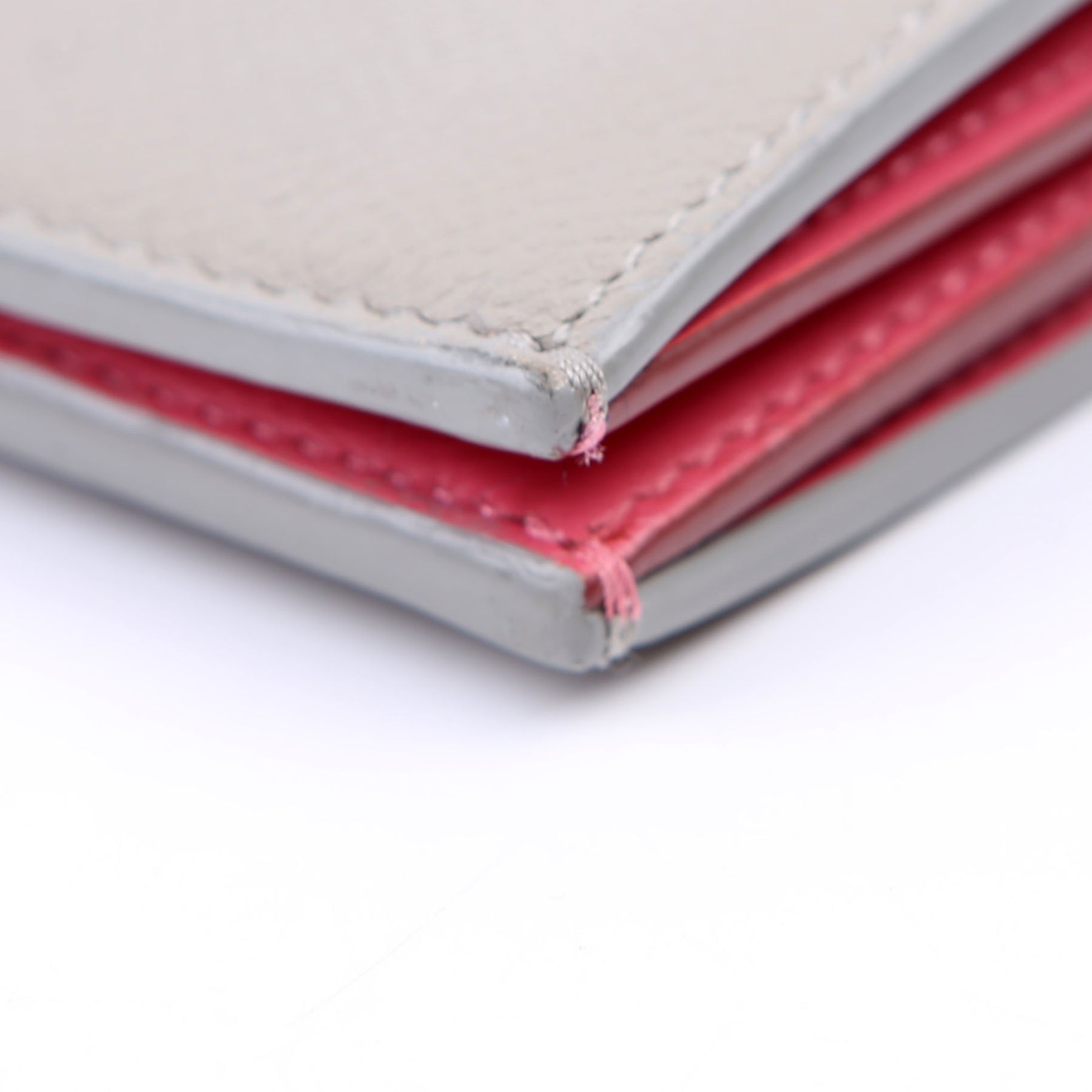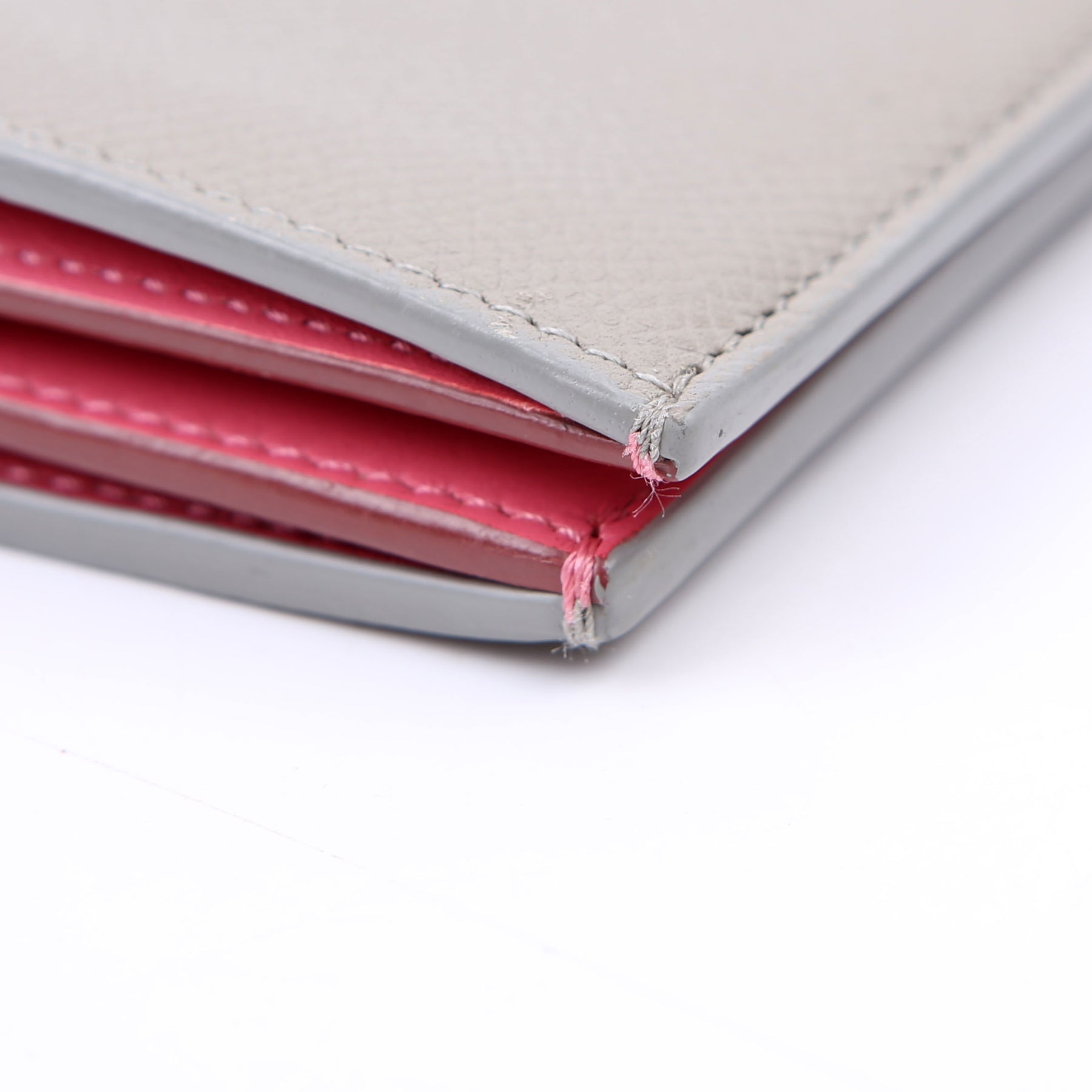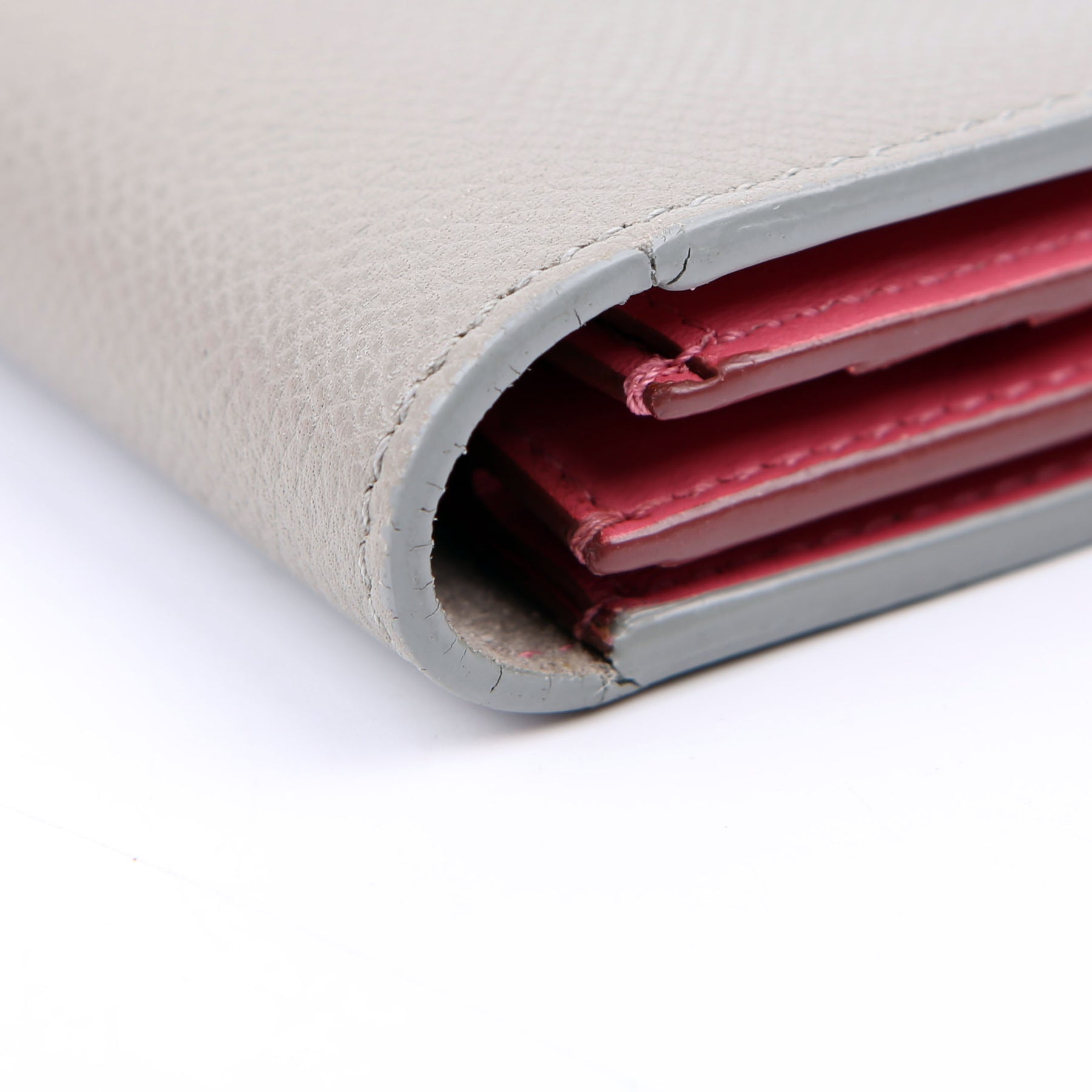 Interior: The interior has minor indents and stains throughout. The suede shows minor wear. The interior features ten card slots, one zip coin pouch, and three bill slots.