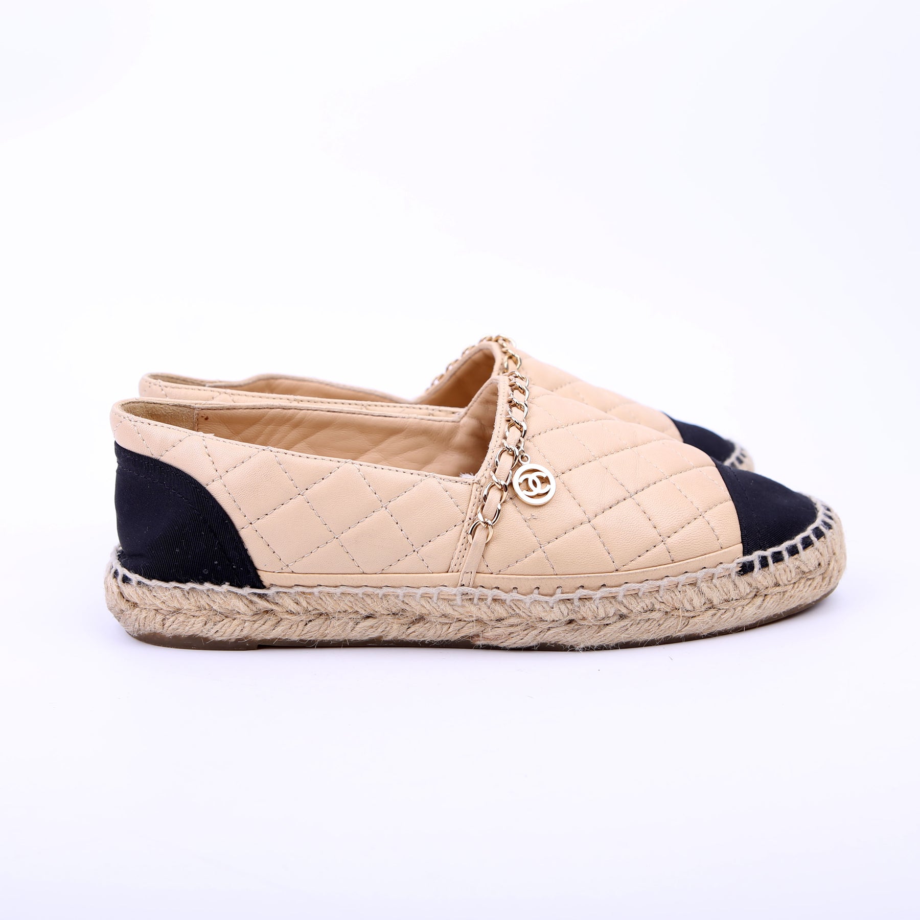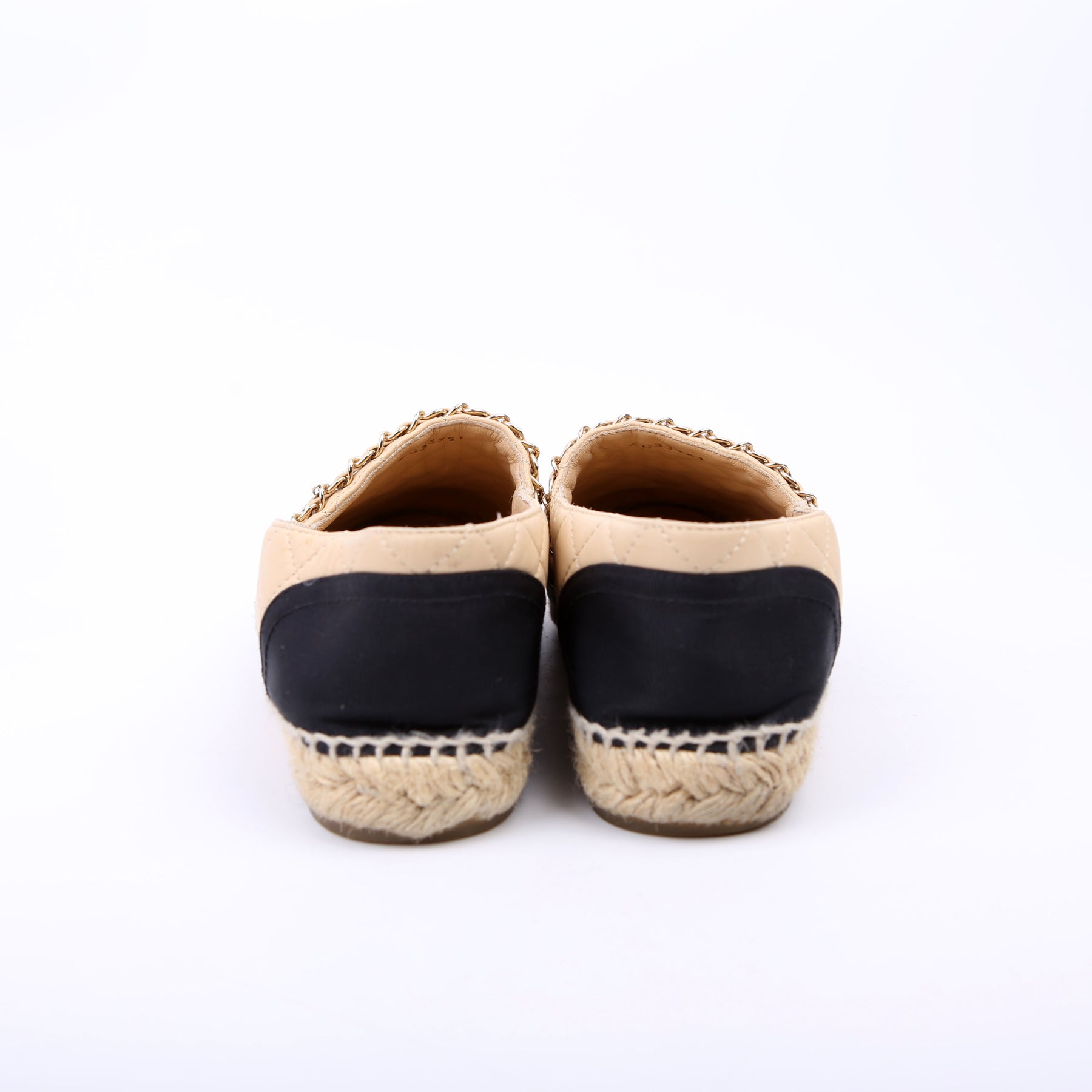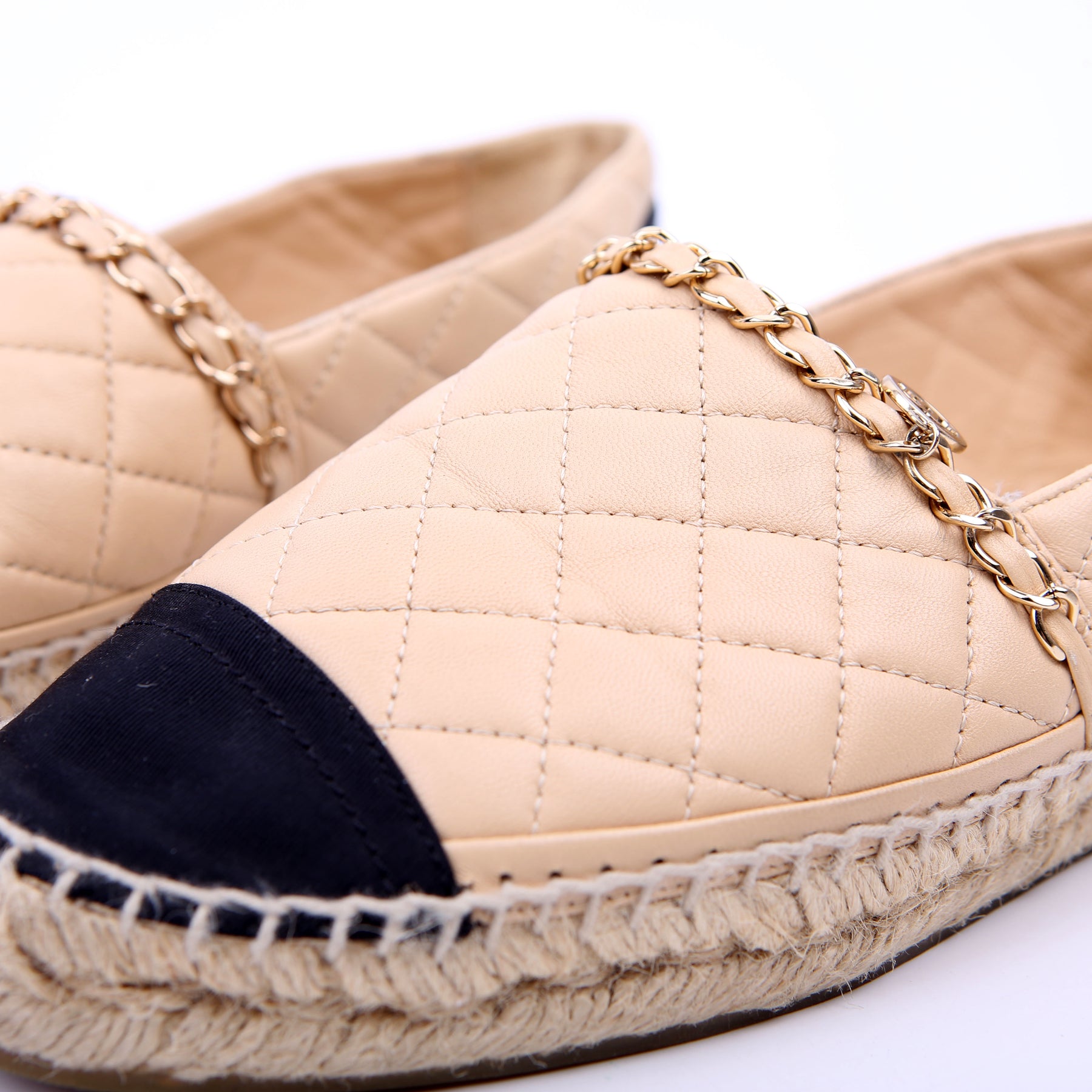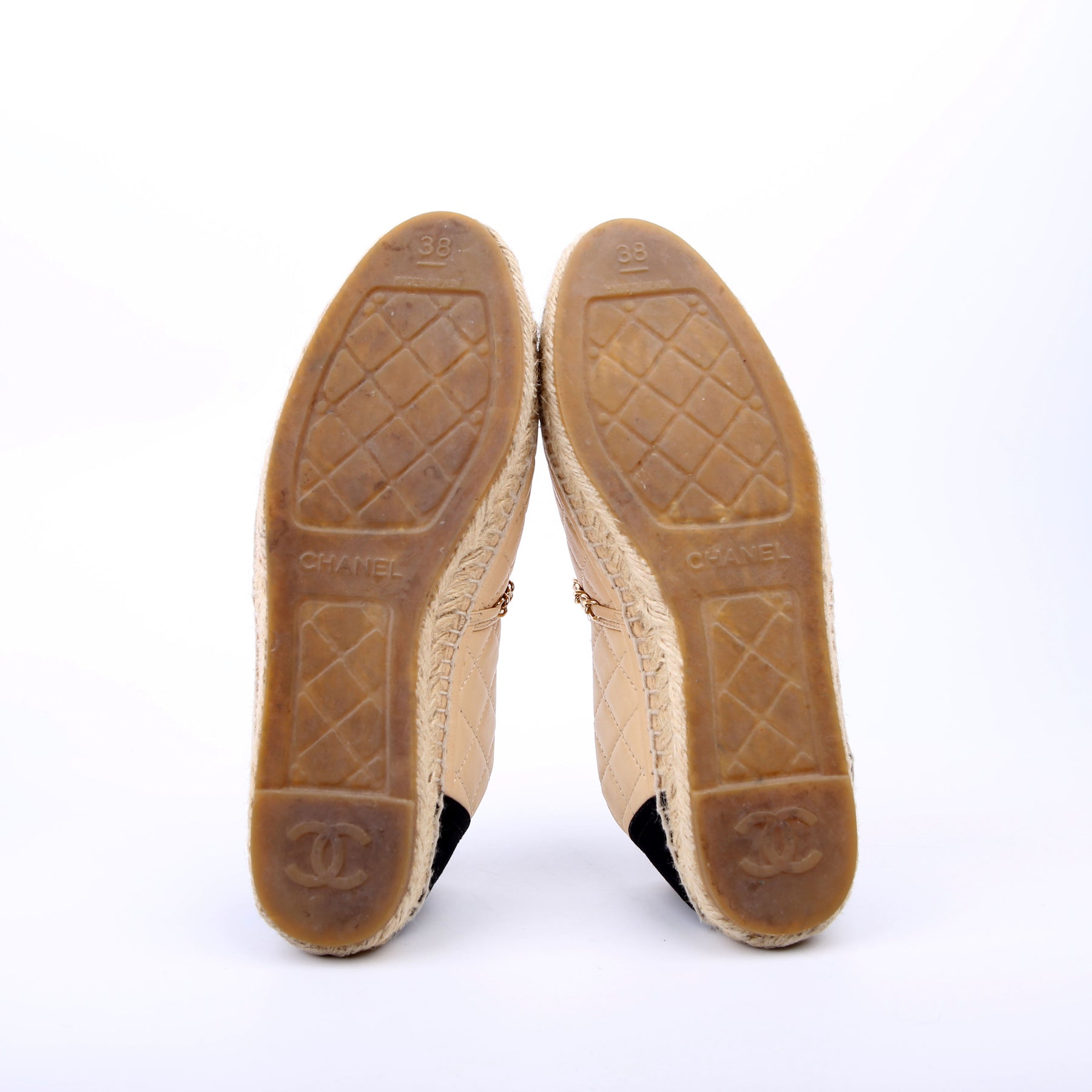 These pre-owned Chanel CC Cap Toe Quilted Espadrilles are guaranteed 100% authentic.