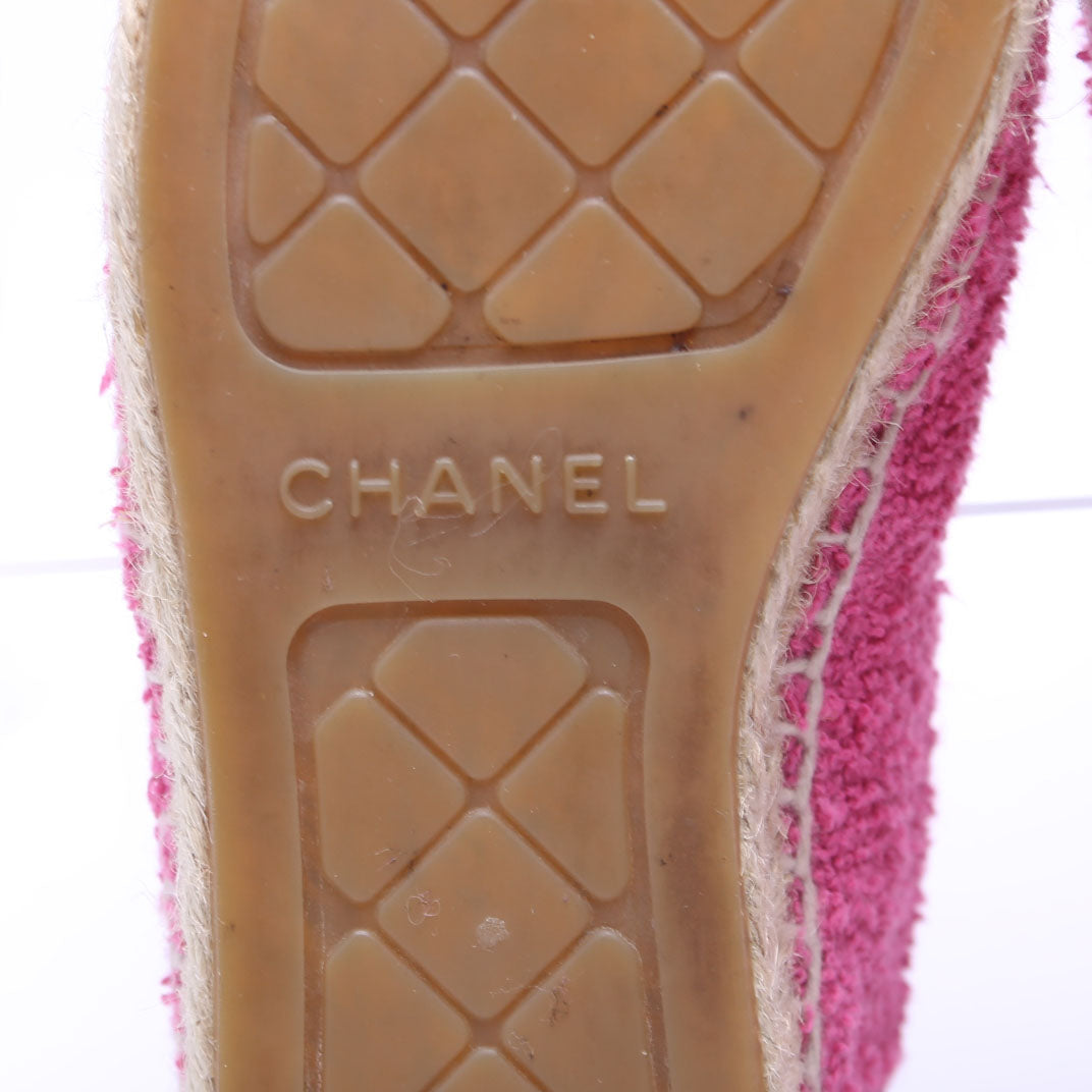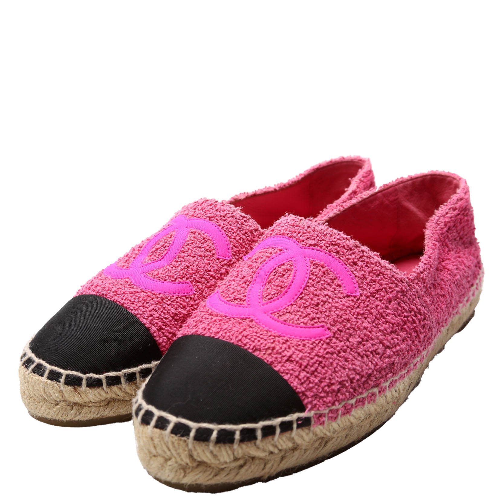 These pre-owned Chanel CC Cap Toe Espadrilles Terry Cloth are guaranteed 100% authentic.