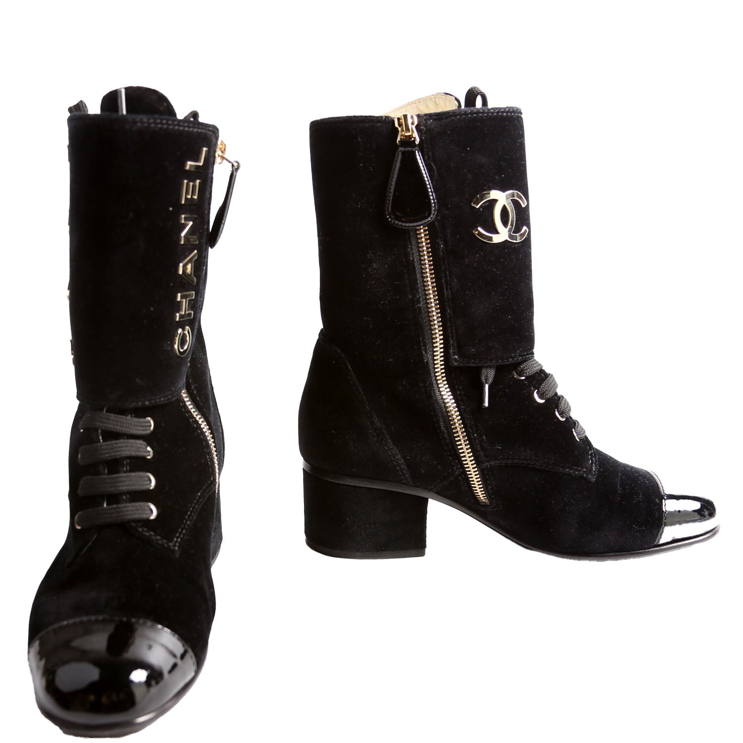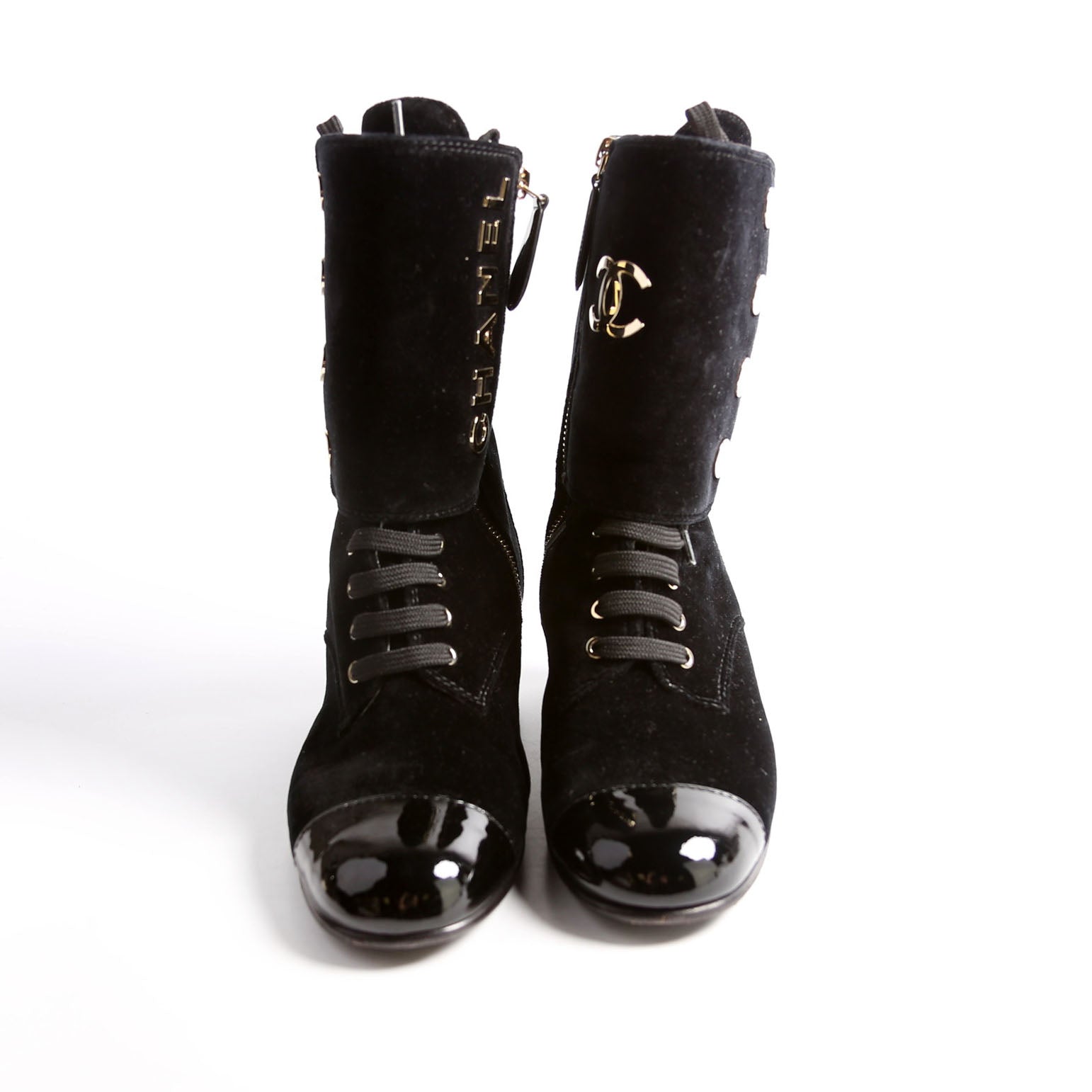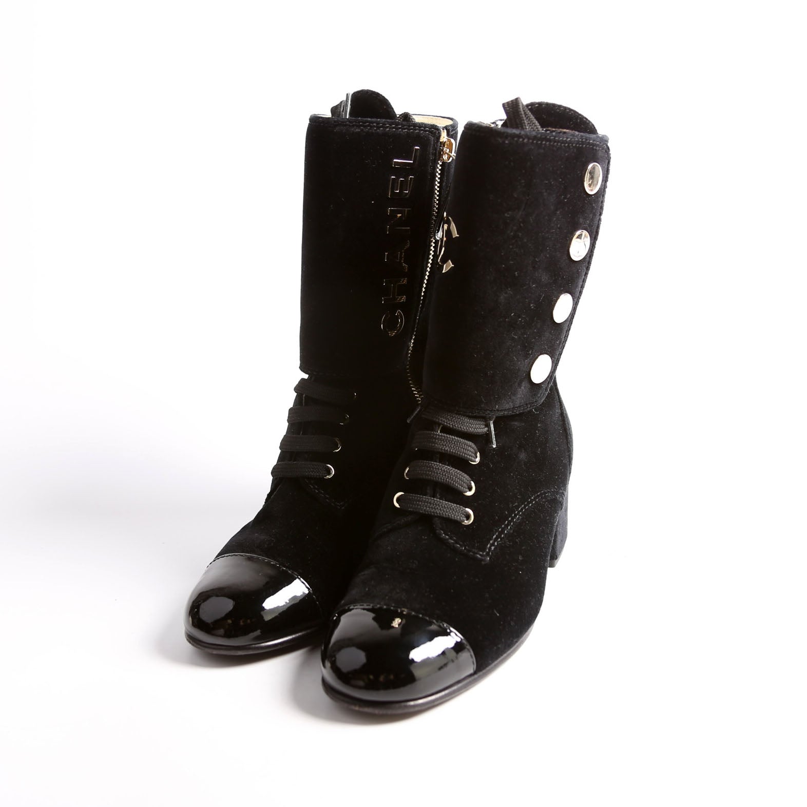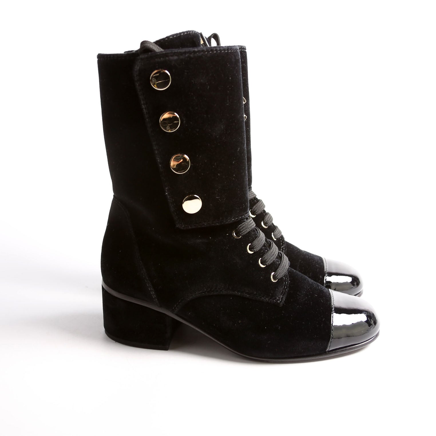 These pre-owned Chanel CC Cap Toe Velvet Lace-Up Boots are guaranteed 100% authentic.