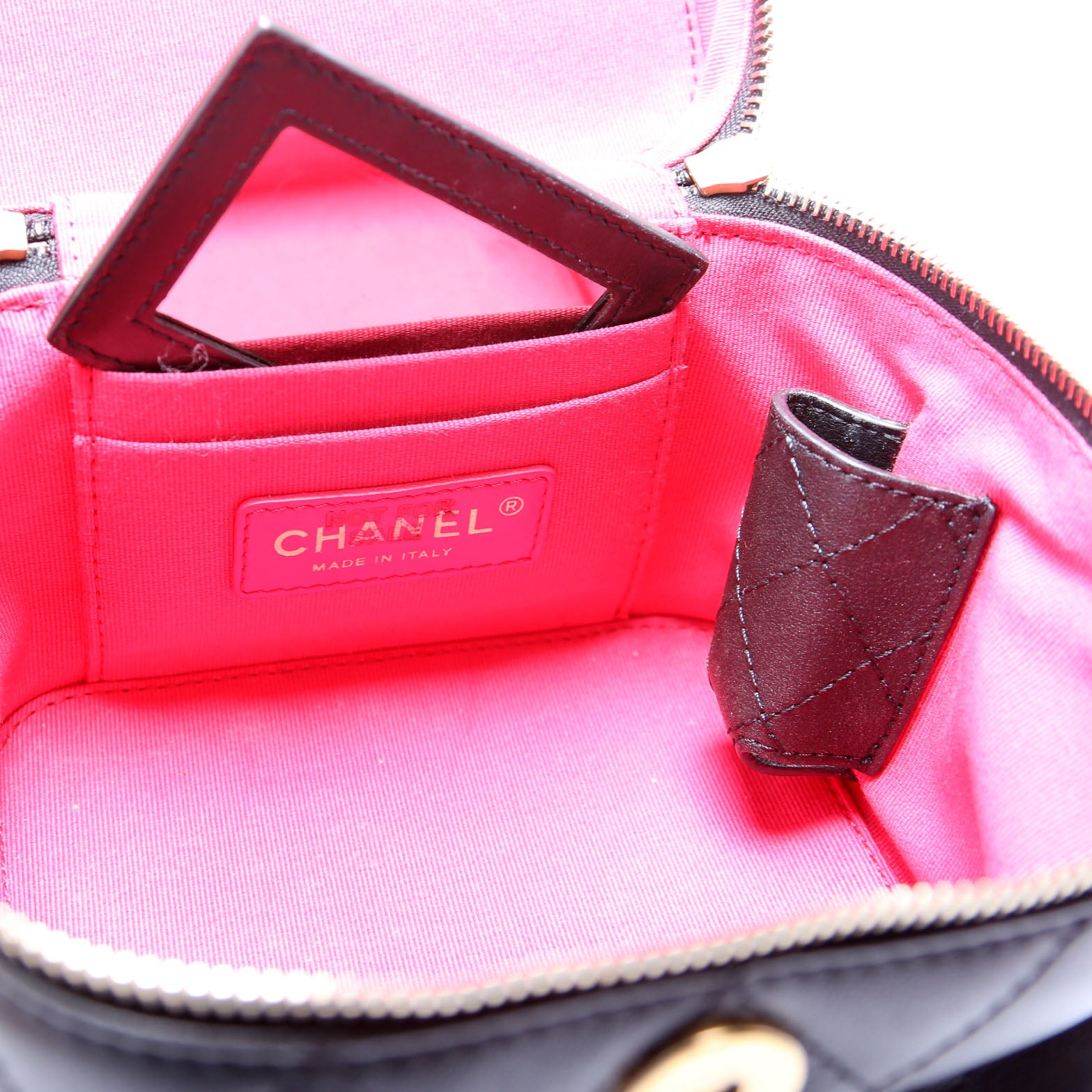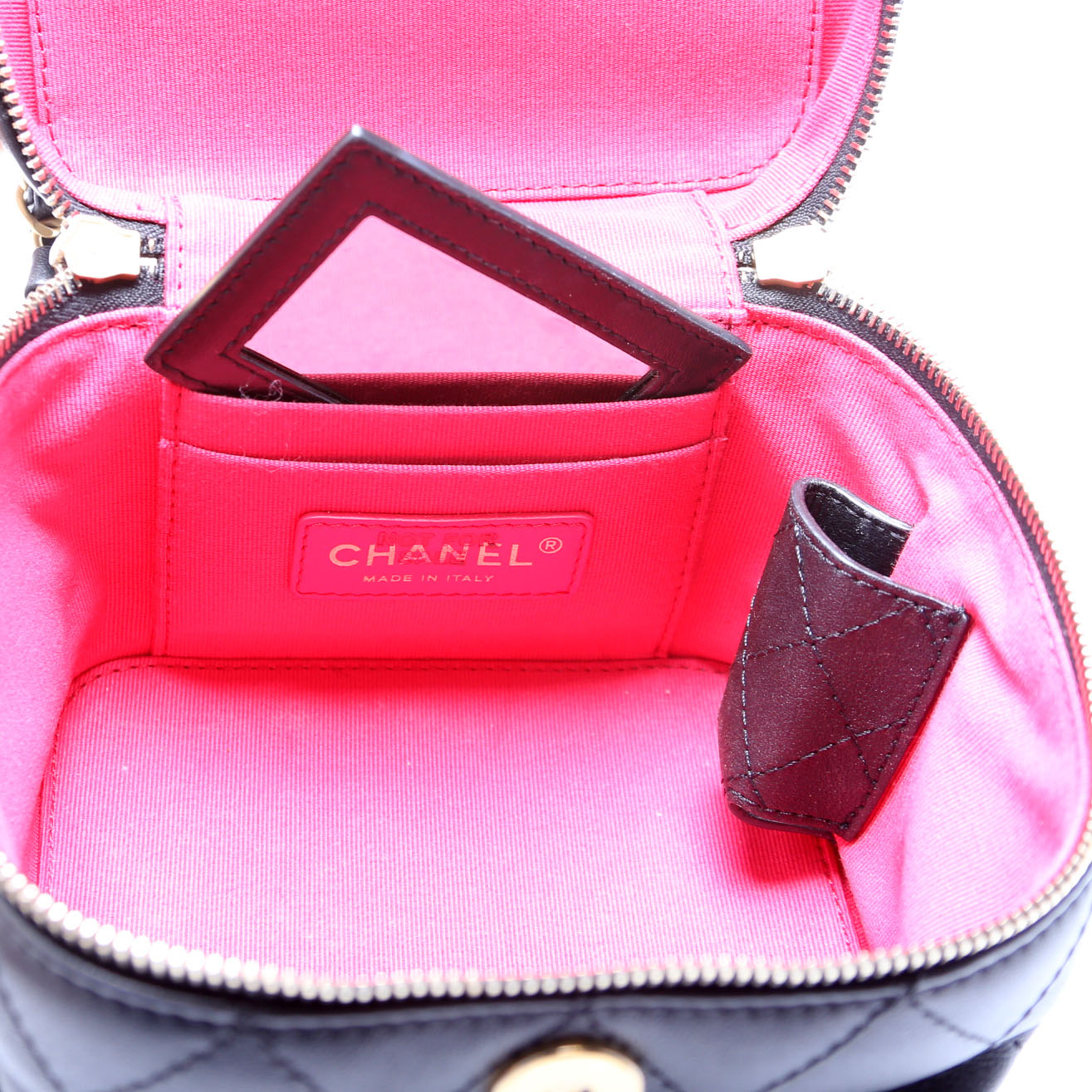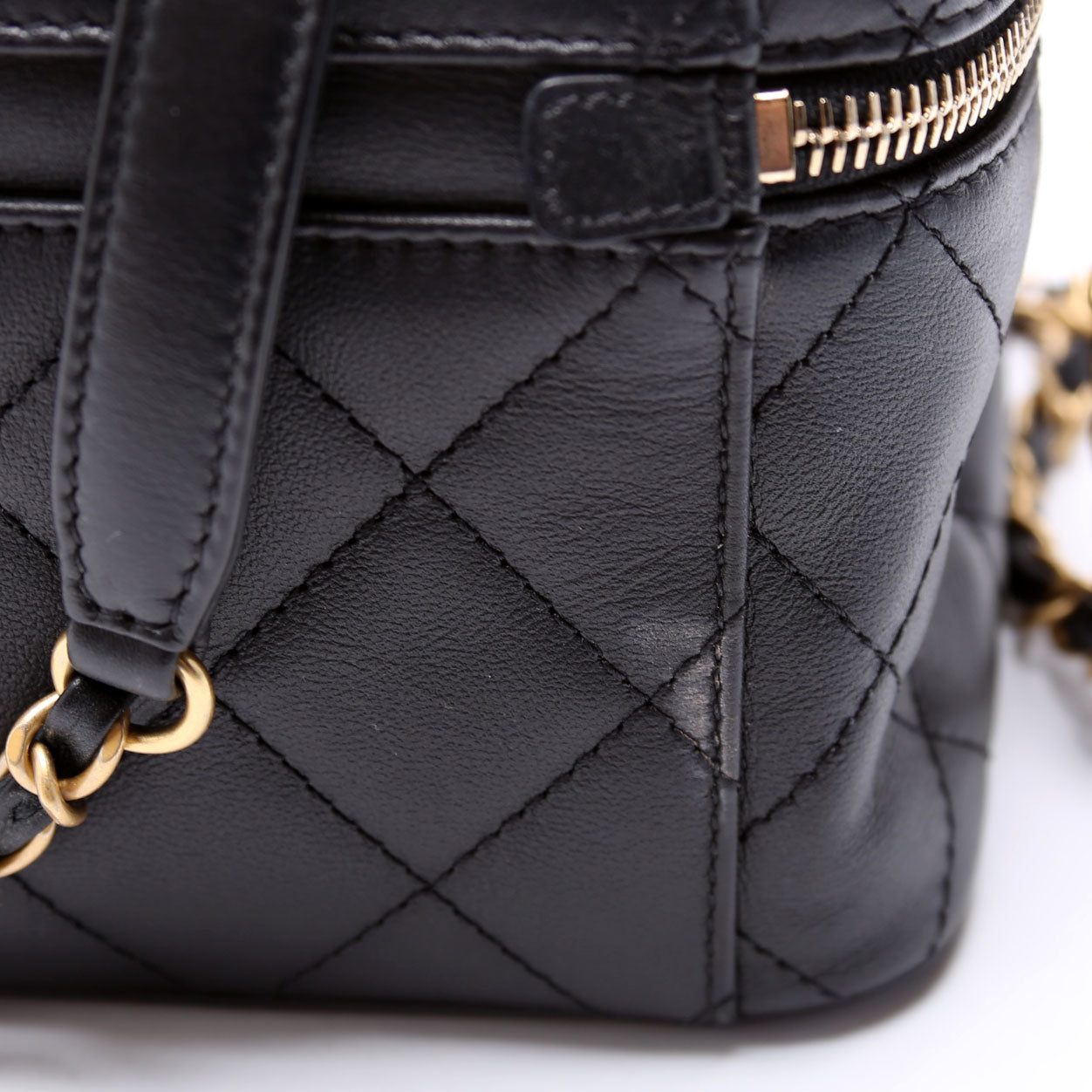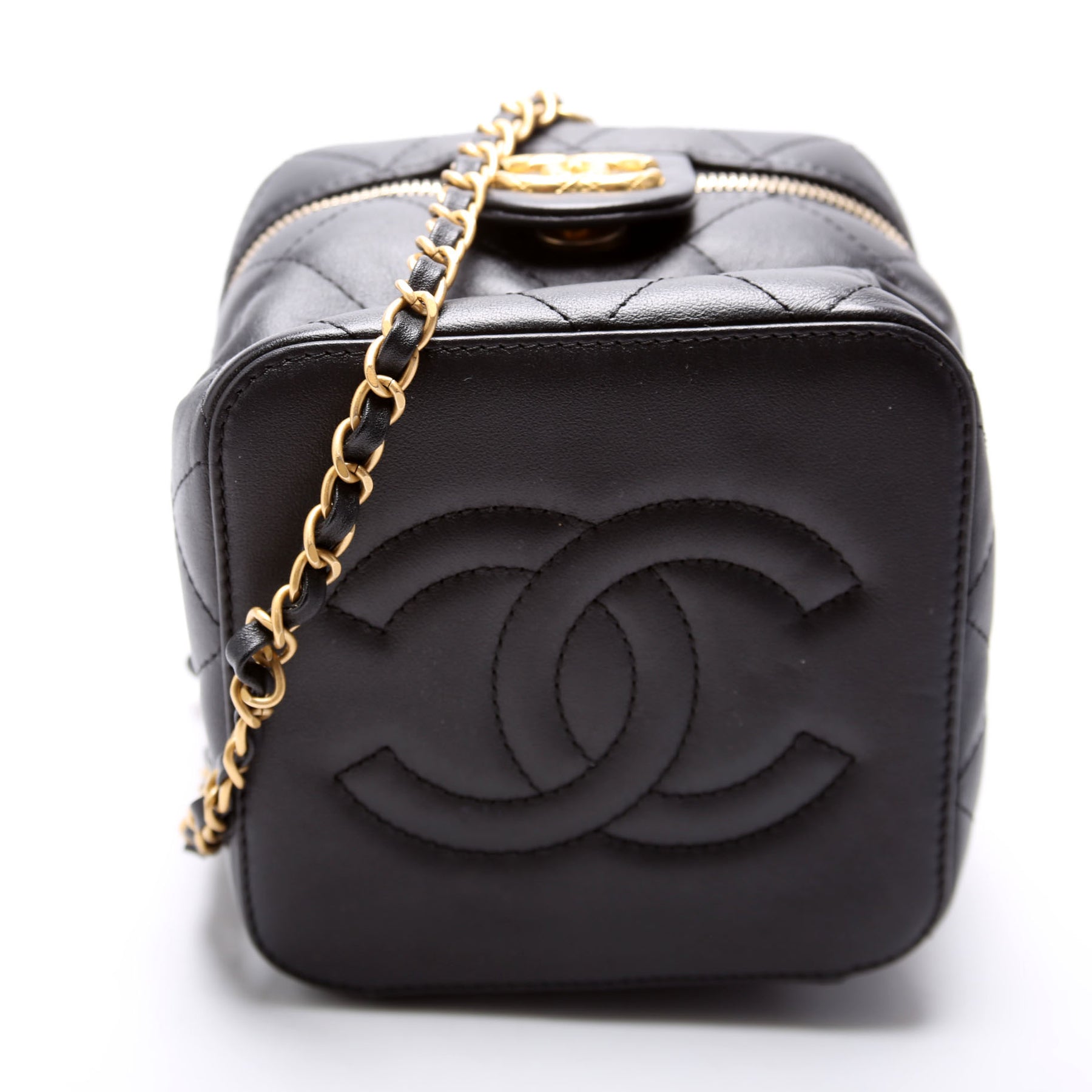 This pre-owned Chanel CC Vanity Case With Chain Small is guaranteed 100% authentic.