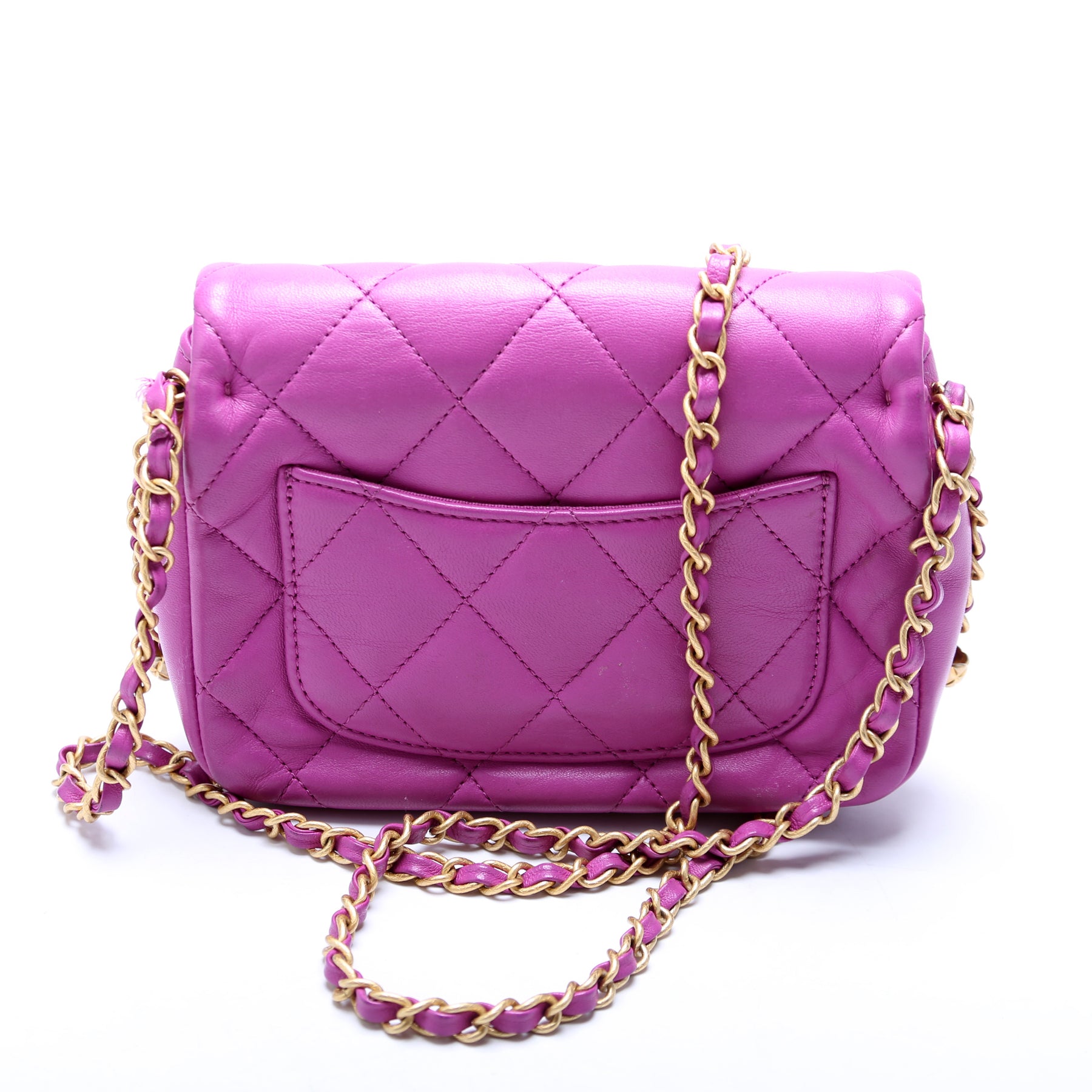 This pre-owned Chanel Chain Around Mini Square Flap Bag is guaranteed 100% authentic. The exterior is in the classic Chanel lambskin leather.