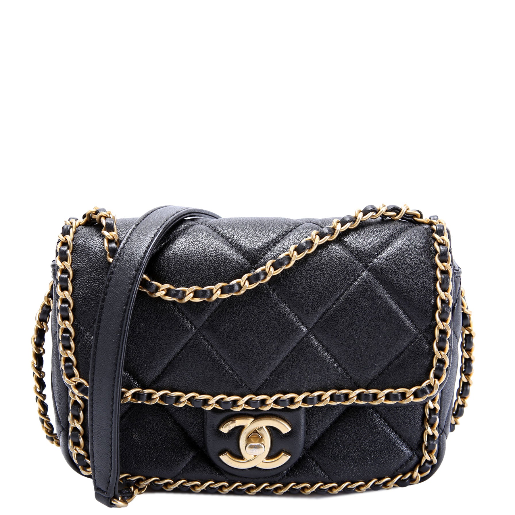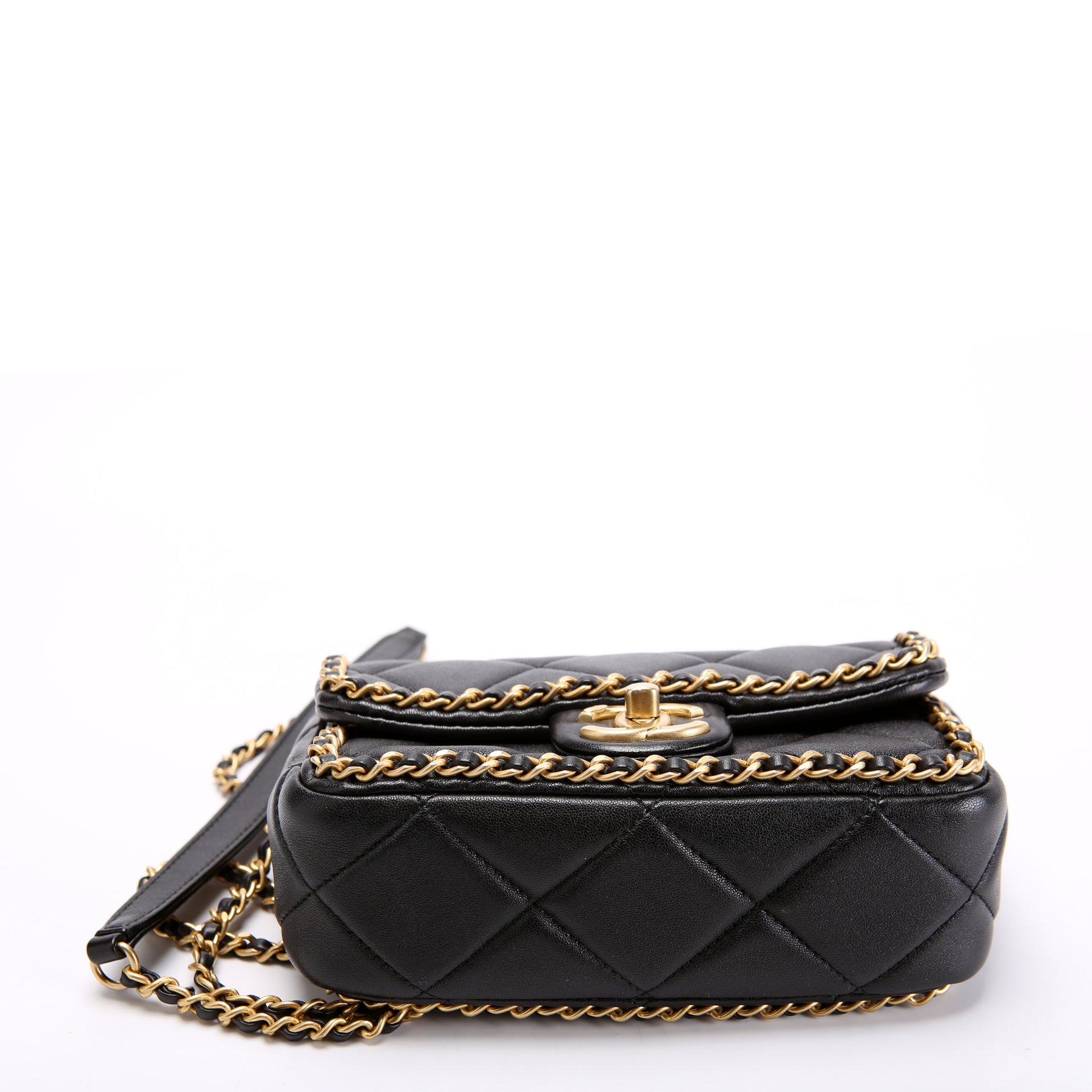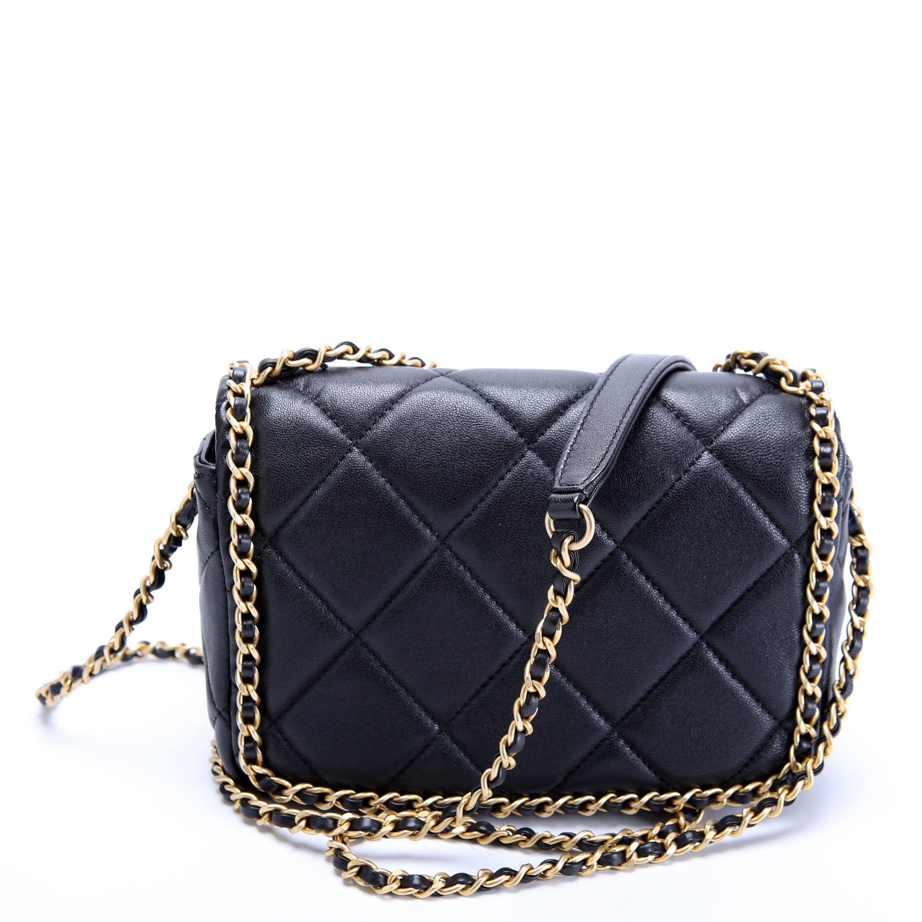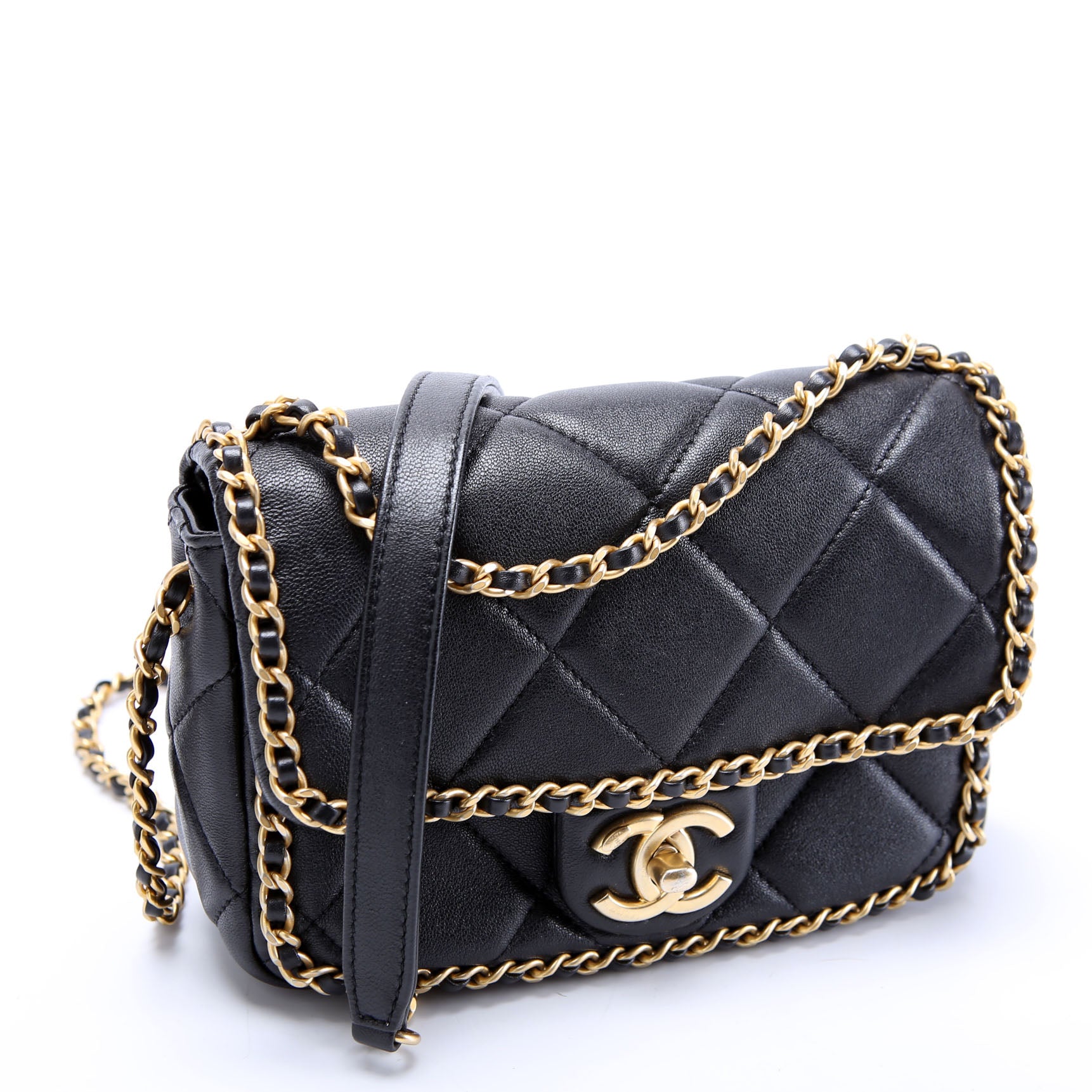 This pre-owned Chanel Chain Me Flap Small is guaranteed 100% authentic. The exterior is in the classic Chanel Lambskin Leather