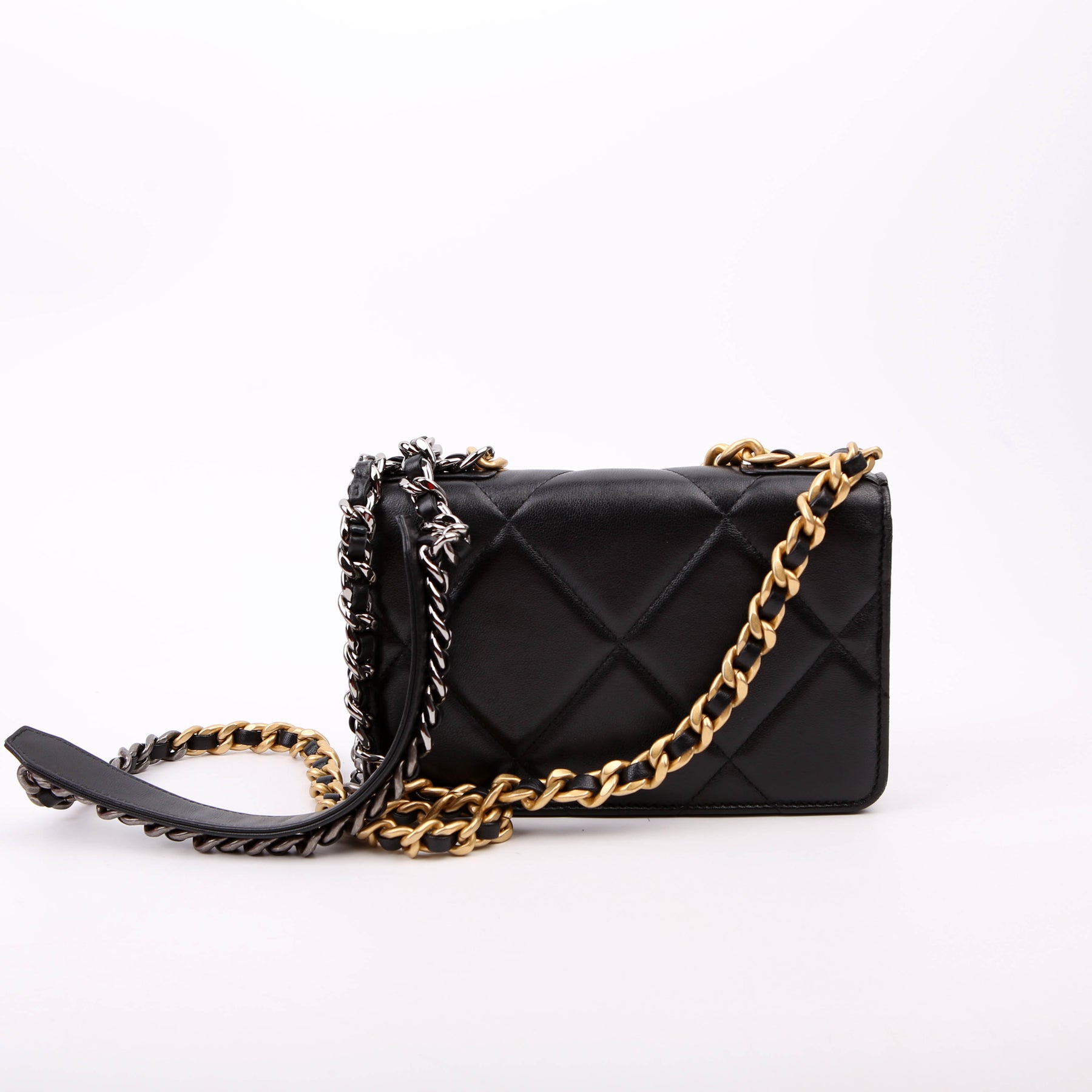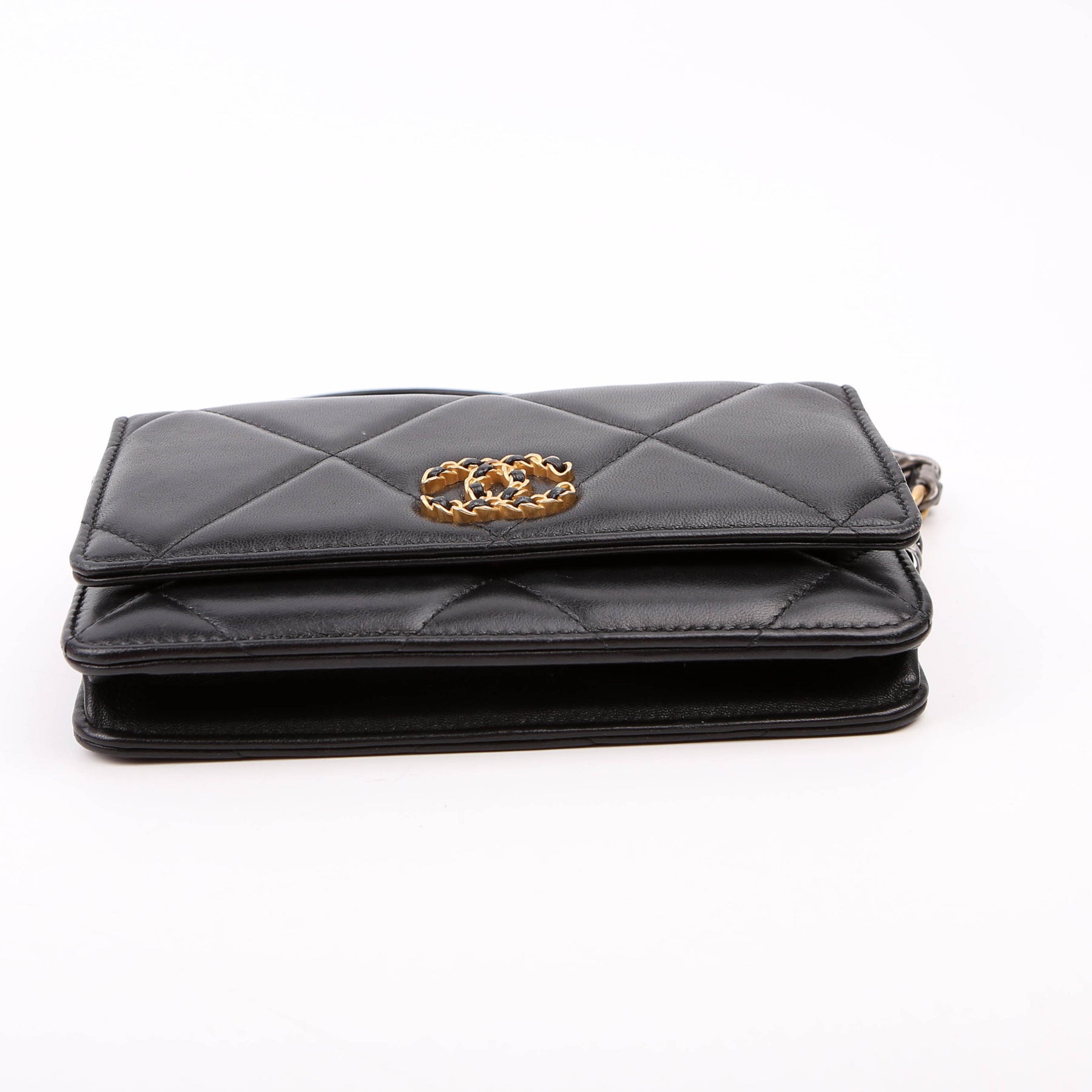 This pre-owned Chanel 19 WOC is guaranteed 100% authentic. The exterior is in the classic Chanel Quilted Lambskin.