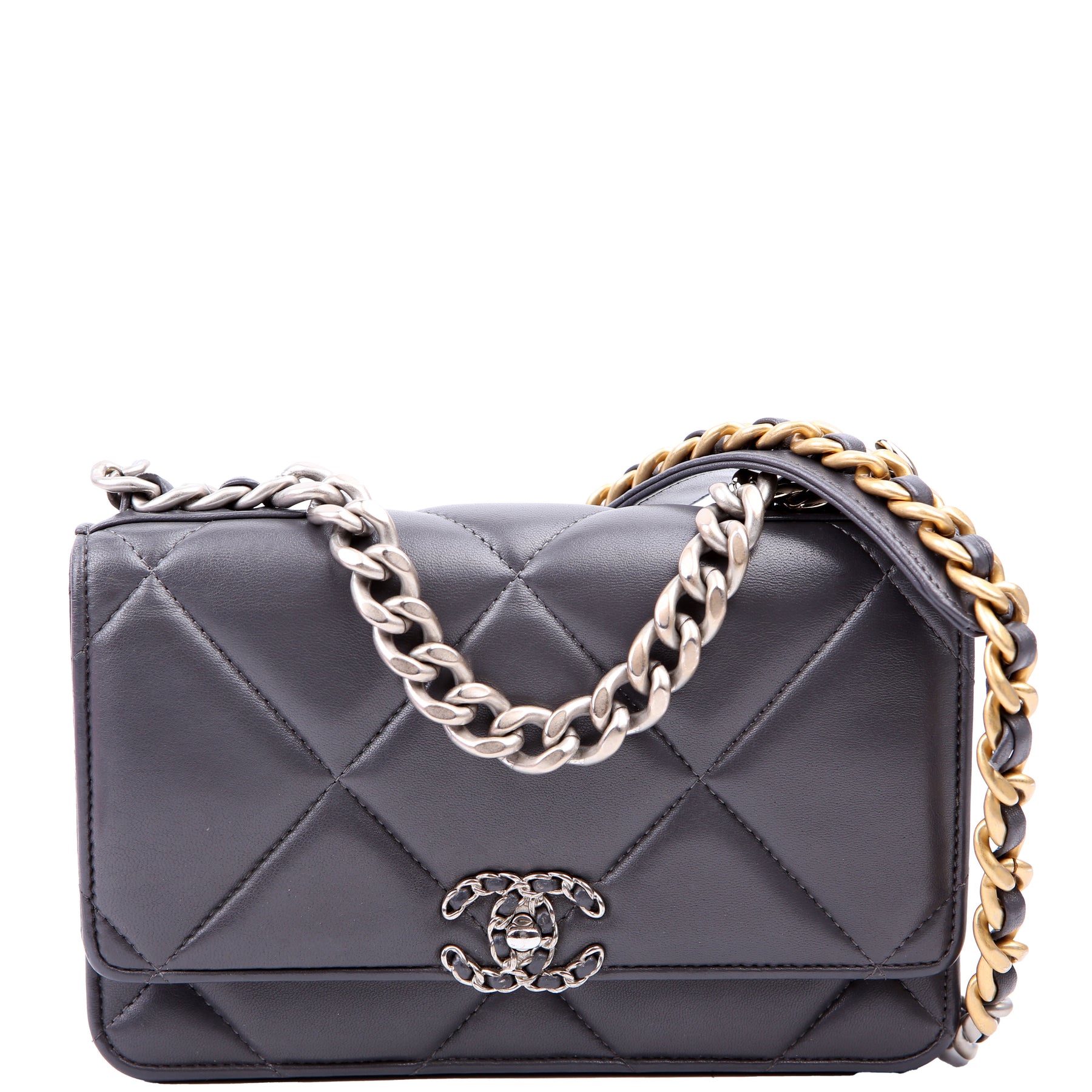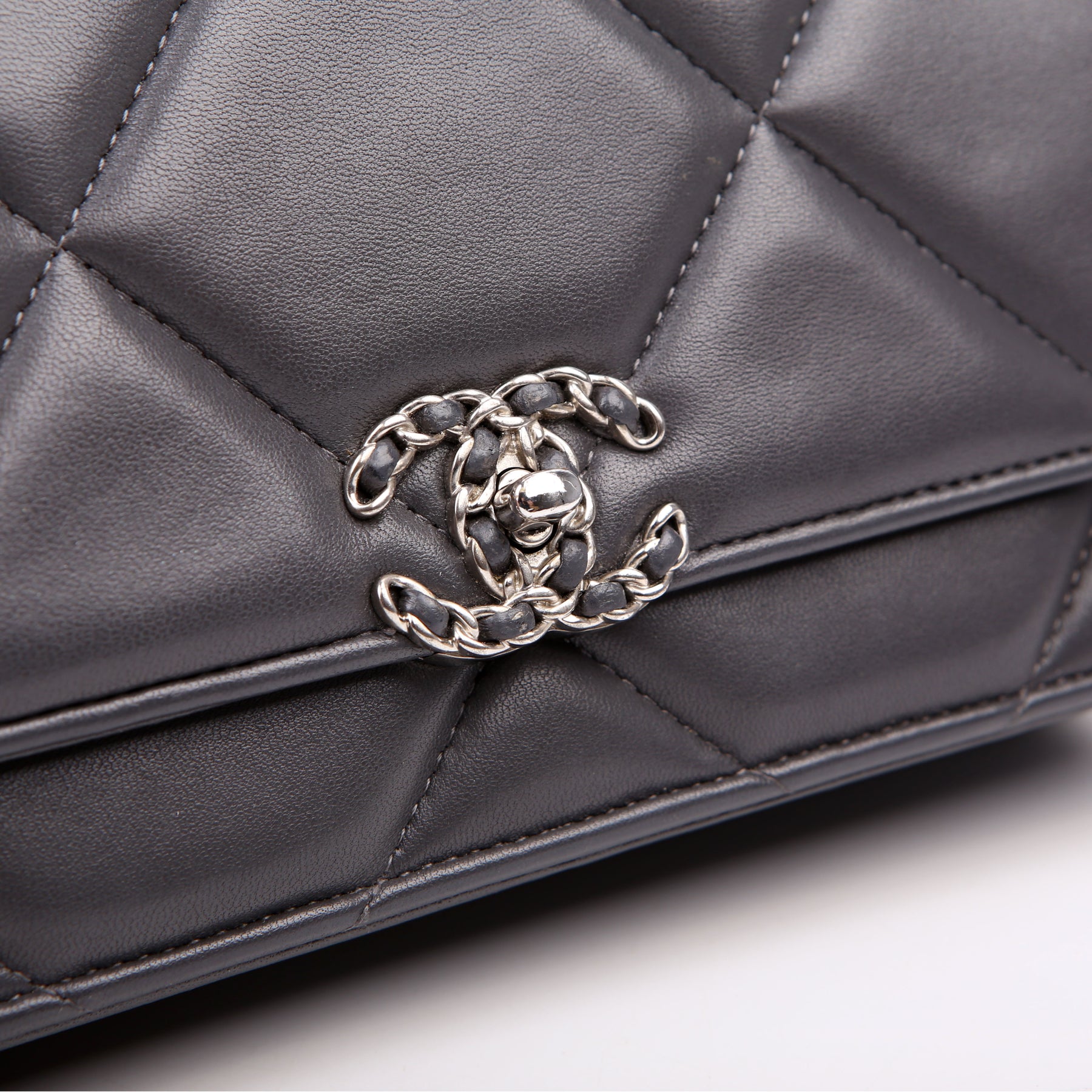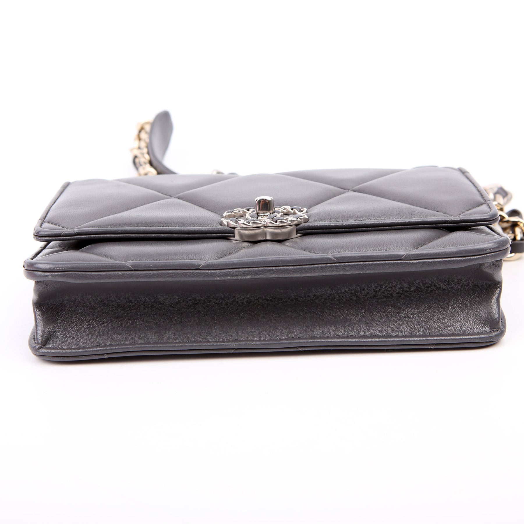 This pre-owned Chanel 19 WOC is guaranteed 100% authentic. The exterior is in the classic Chanel Quilted Lambskin.