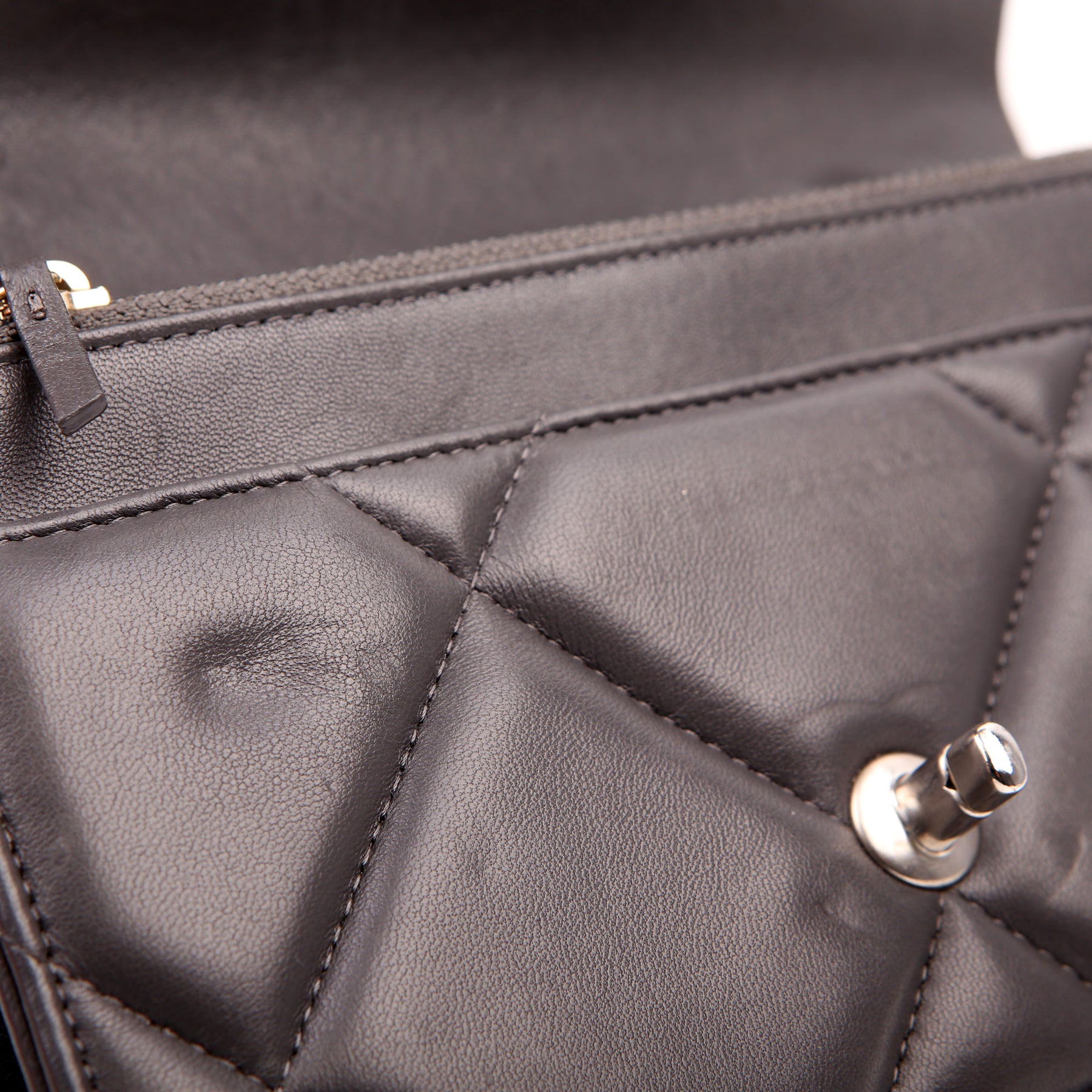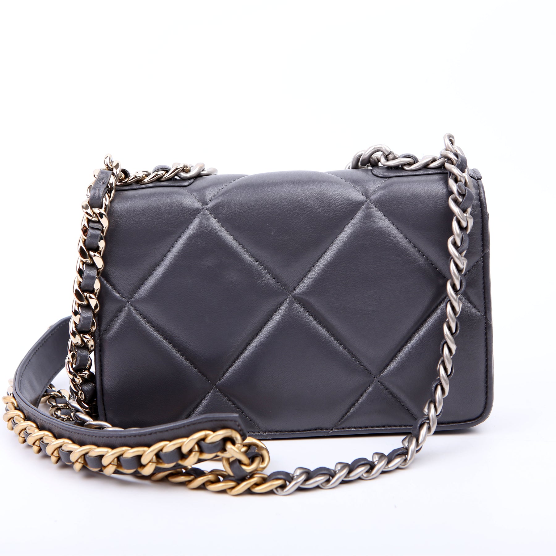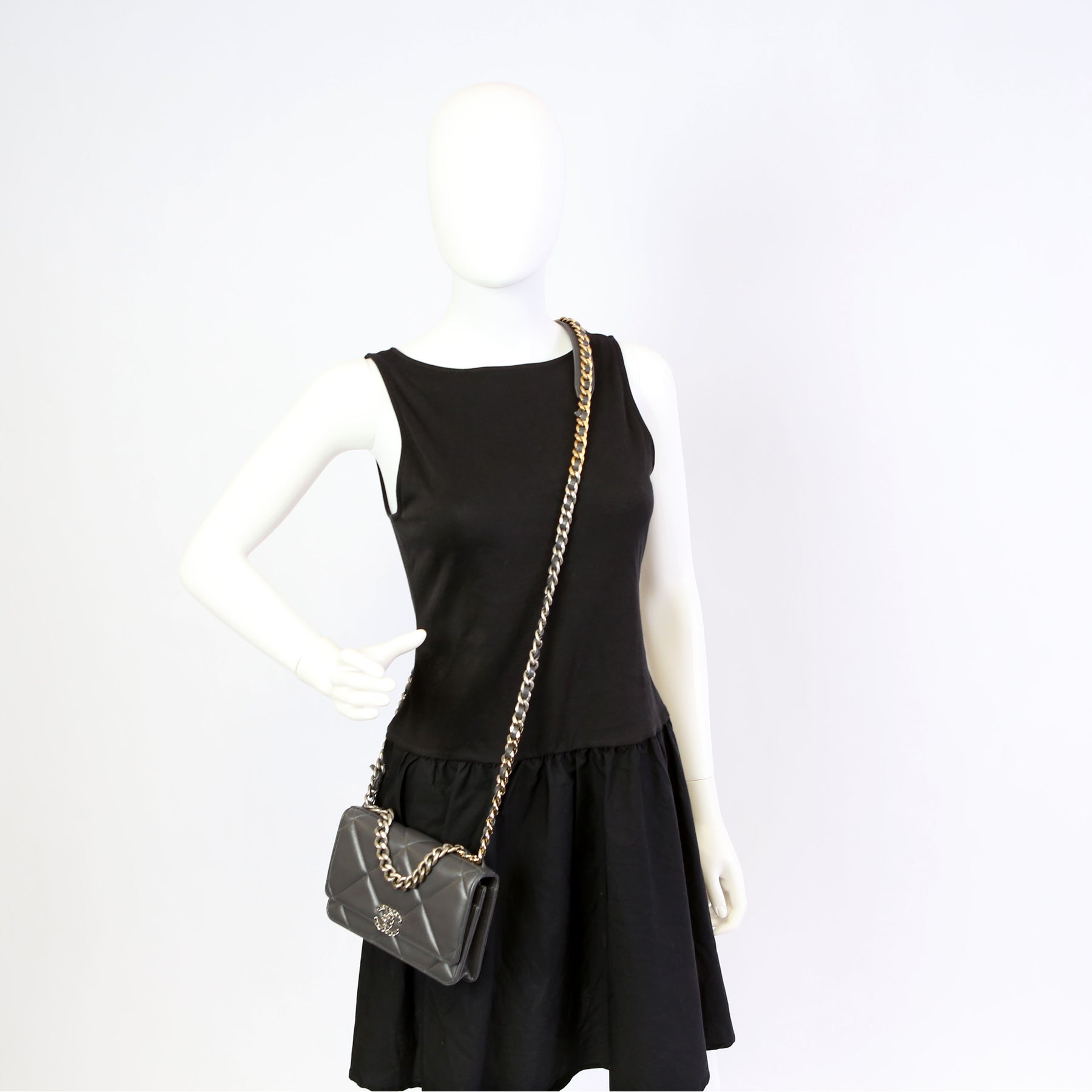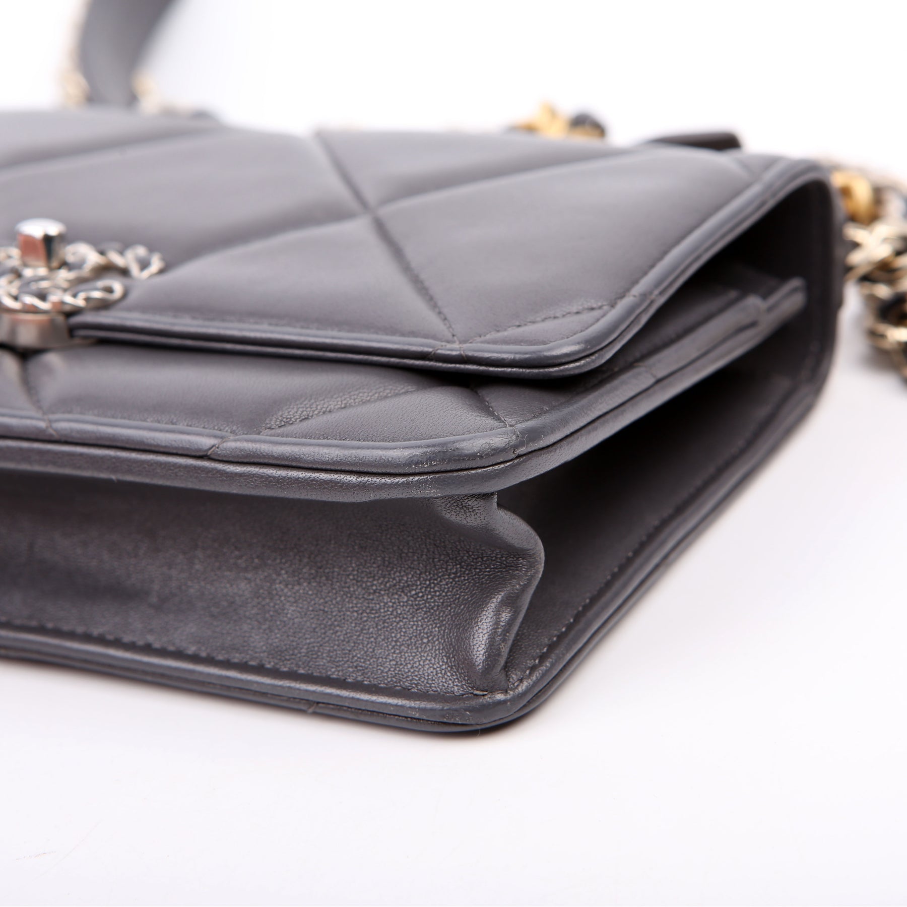 This pre-owned Chanel 19 WOC is guaranteed 100% authentic. The exterior is in the classic Chanel Quilted Lambskin.