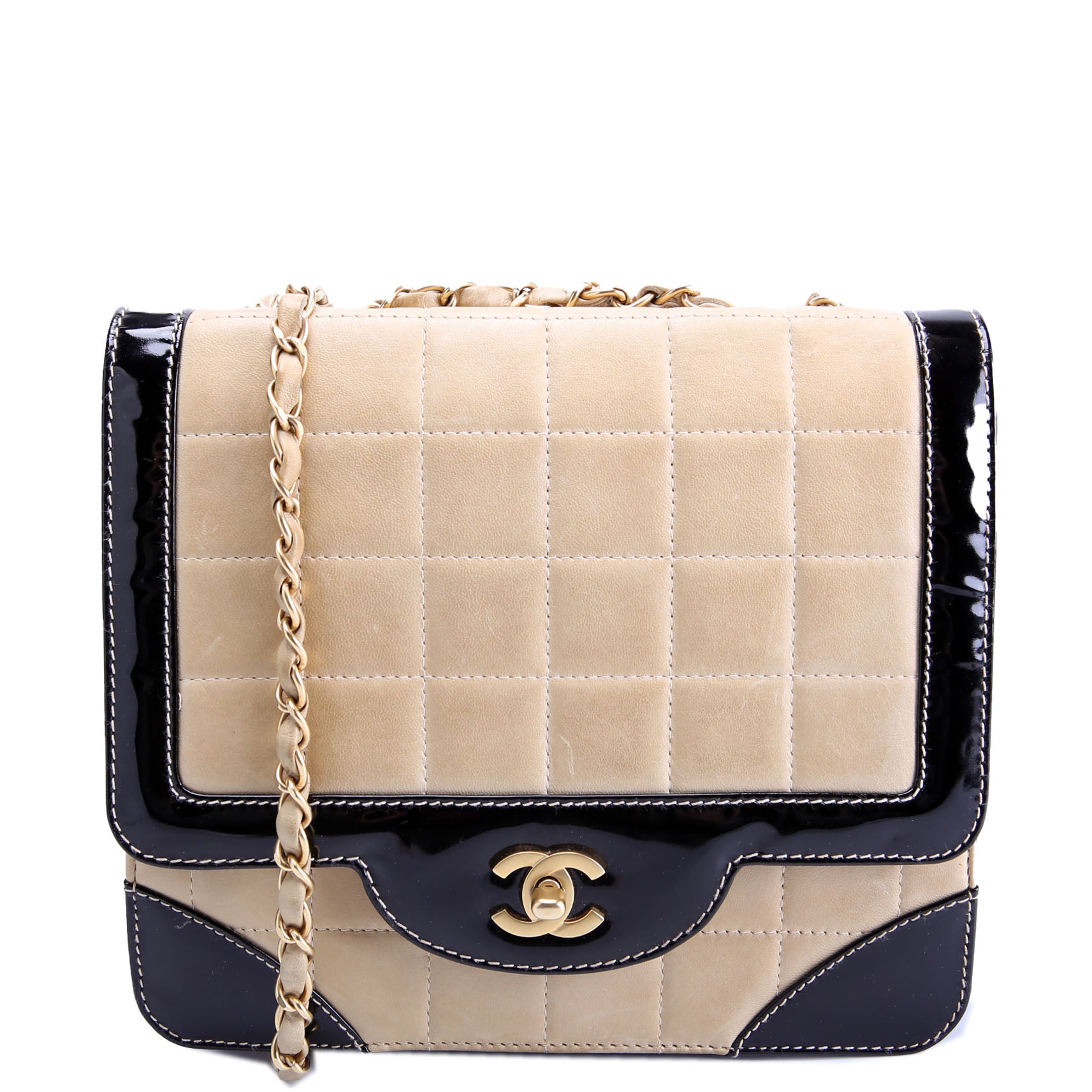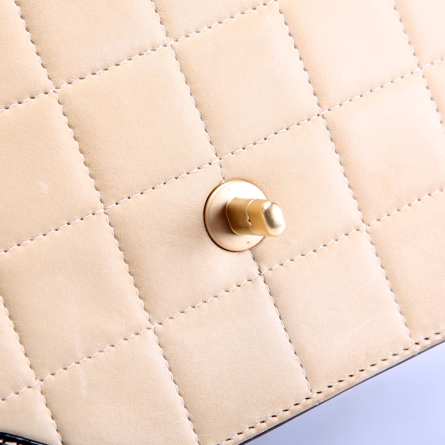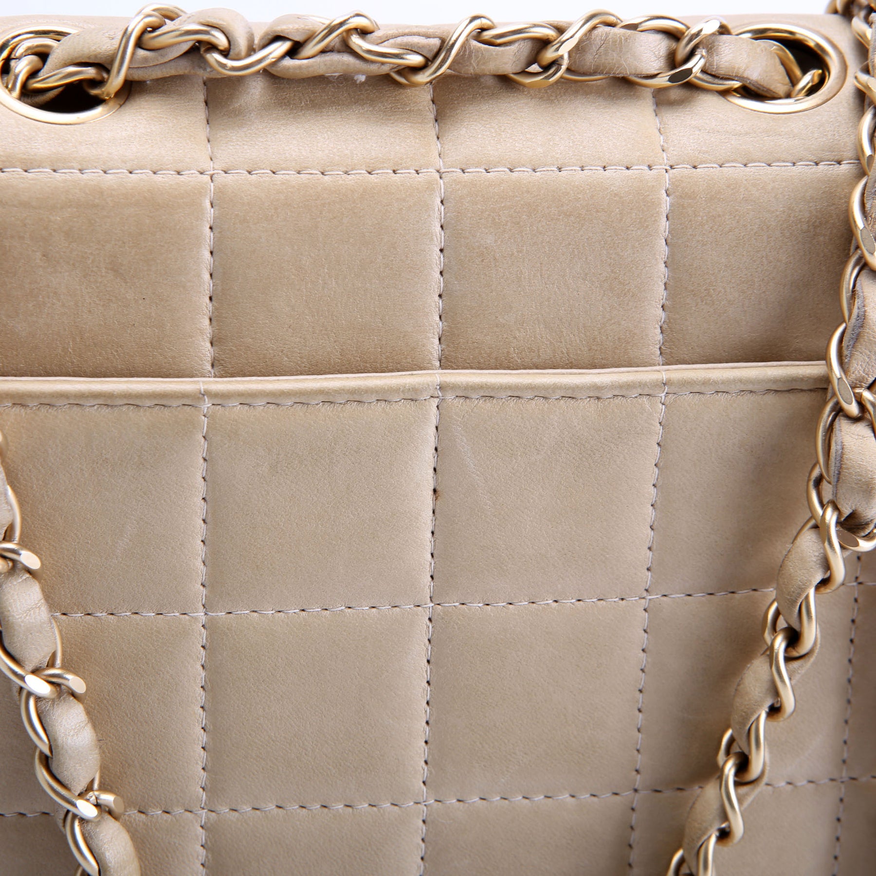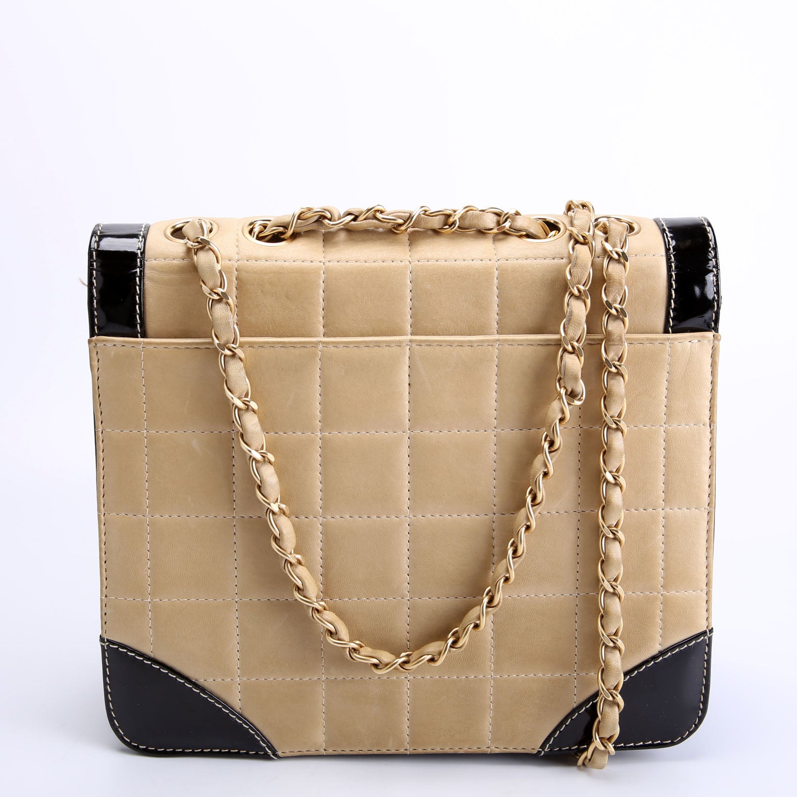 This pre-owned Chanel Chocolate Bar Square Flap is guaranteed 100% authentic. The exterior is in the classic Chanel Calfskin Leather.