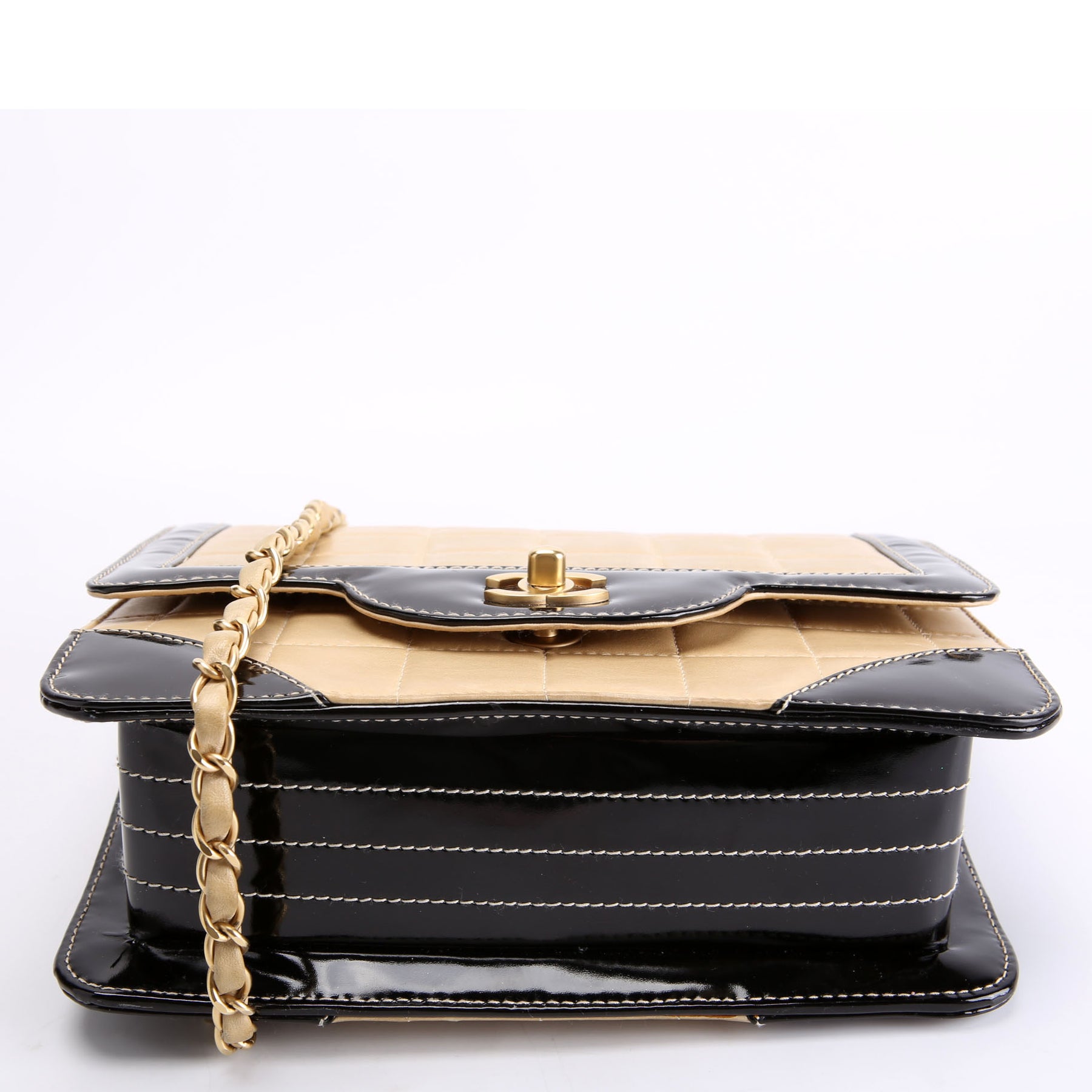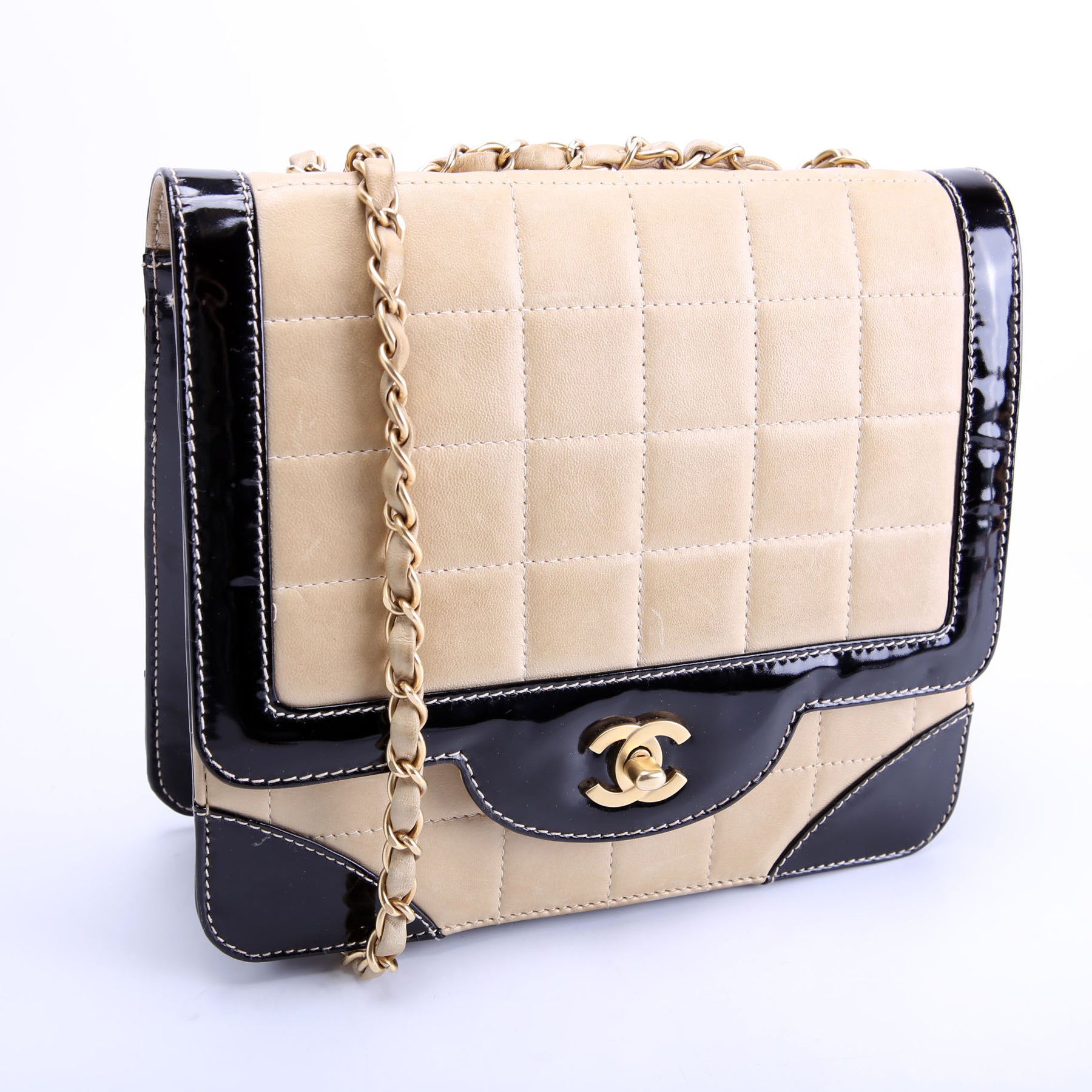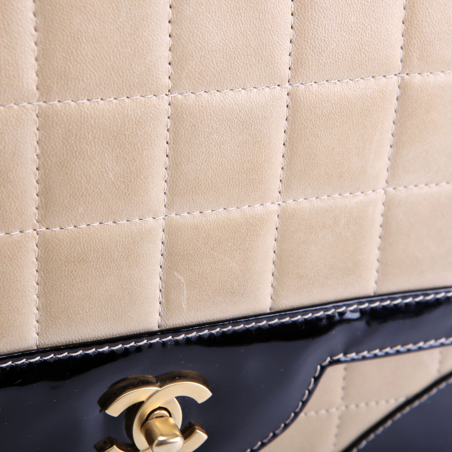 This pre-owned Chanel Chocolate Bar Square Flap is guaranteed 100% authentic. The exterior is in the classic Chanel Calfskin Leather.