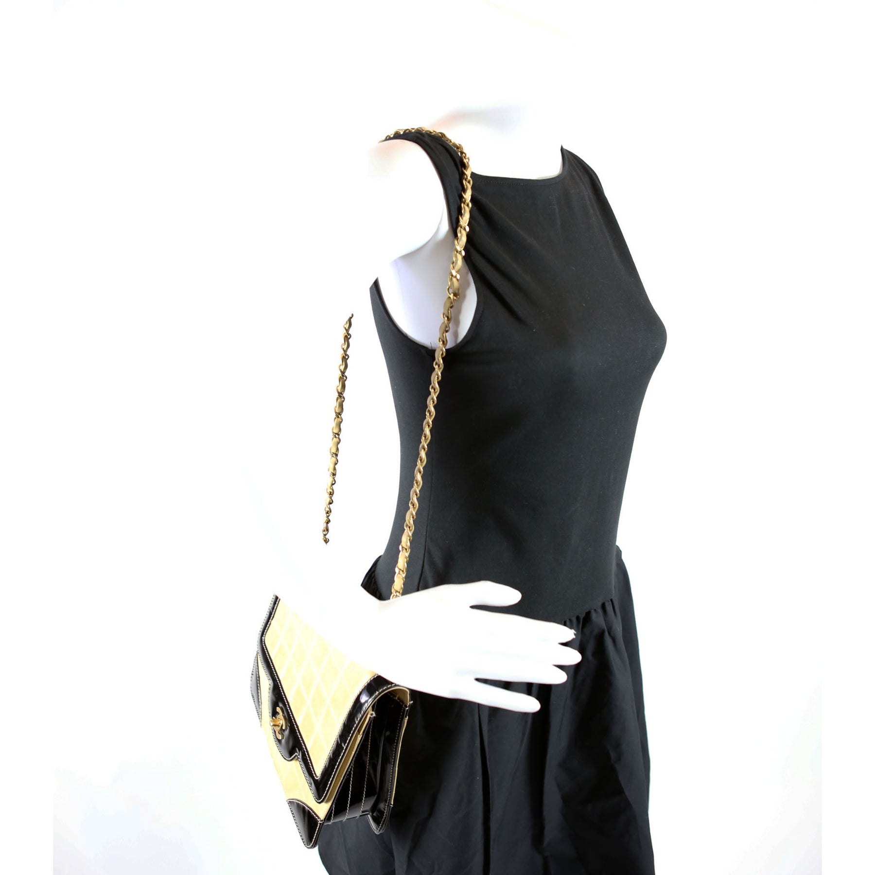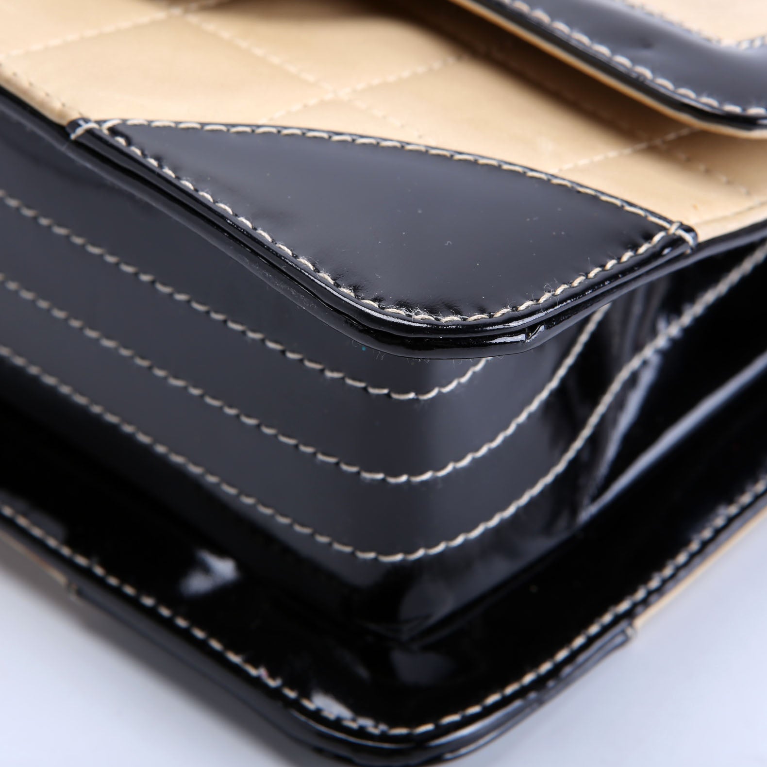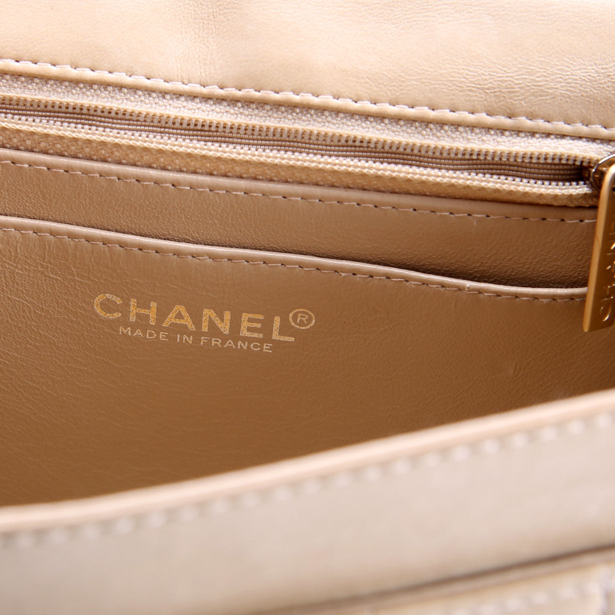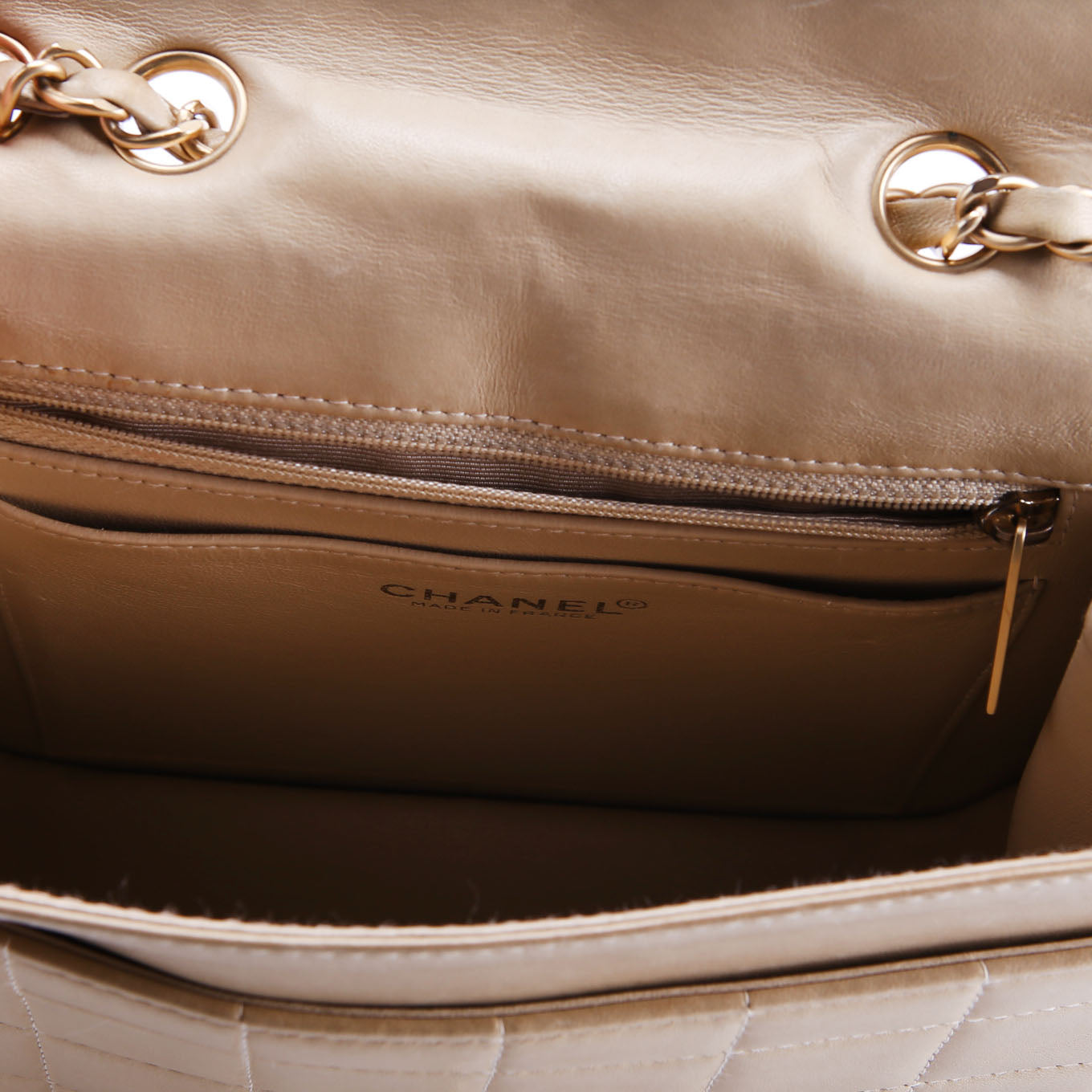 This pre-owned Chanel Chocolate Bar Square Flap is guaranteed 100% authentic. The exterior is in the classic Chanel Calfskin Leather.