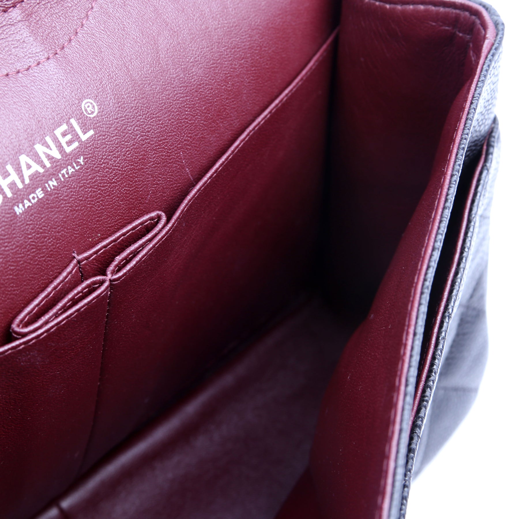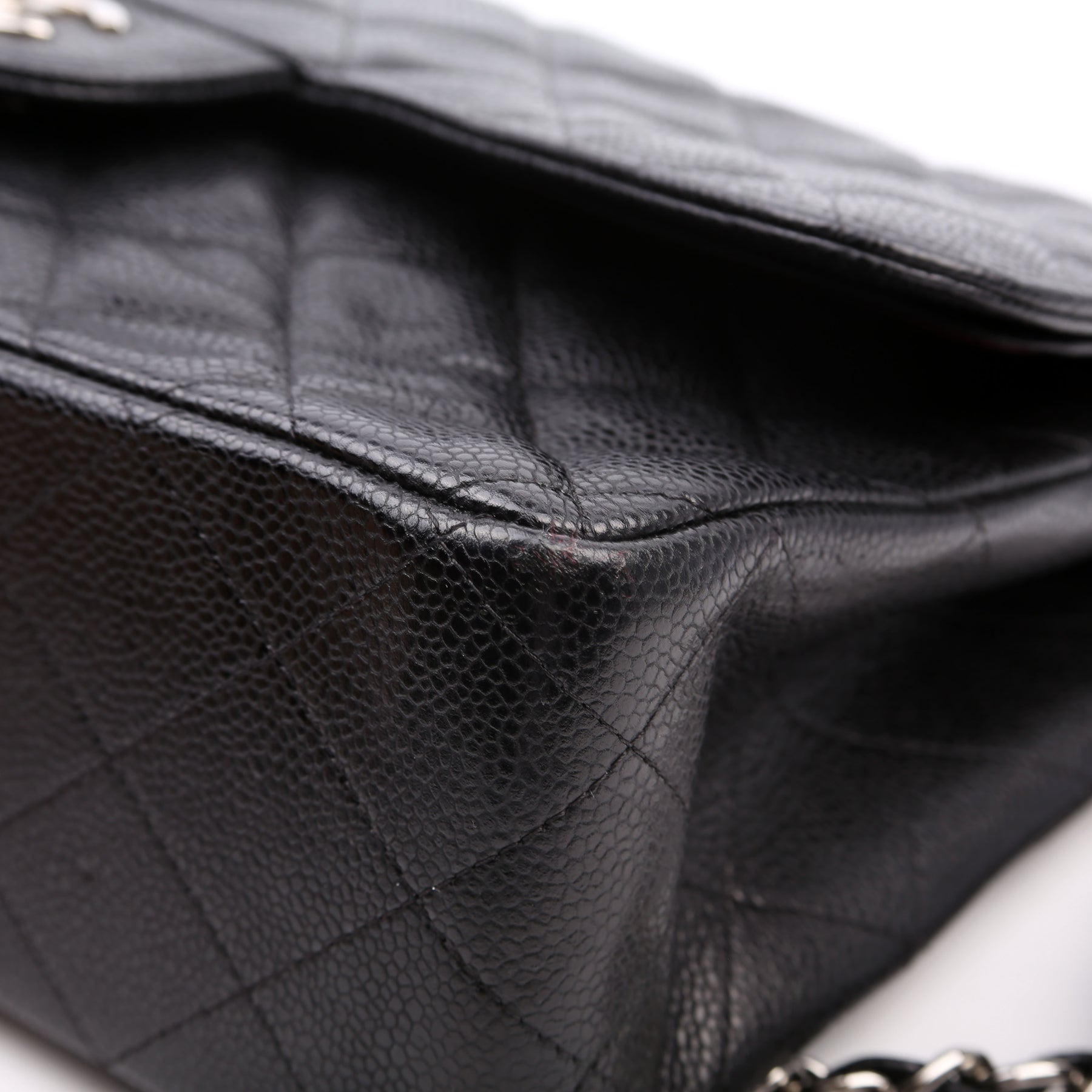 This pre-owned Chanel Classic Flap Jumbo is guaranteed 100% authentic. The exterior is in the classic Chanel Caviar leather.