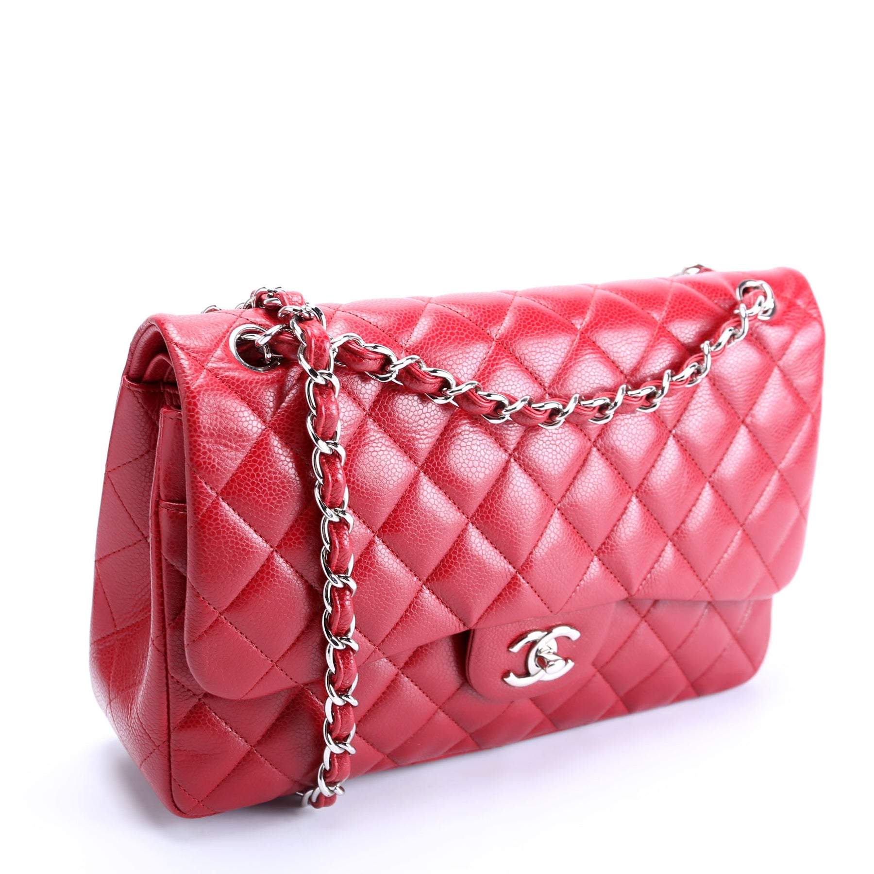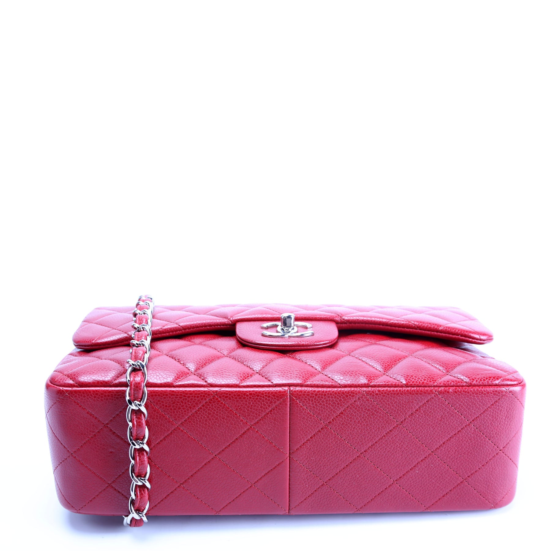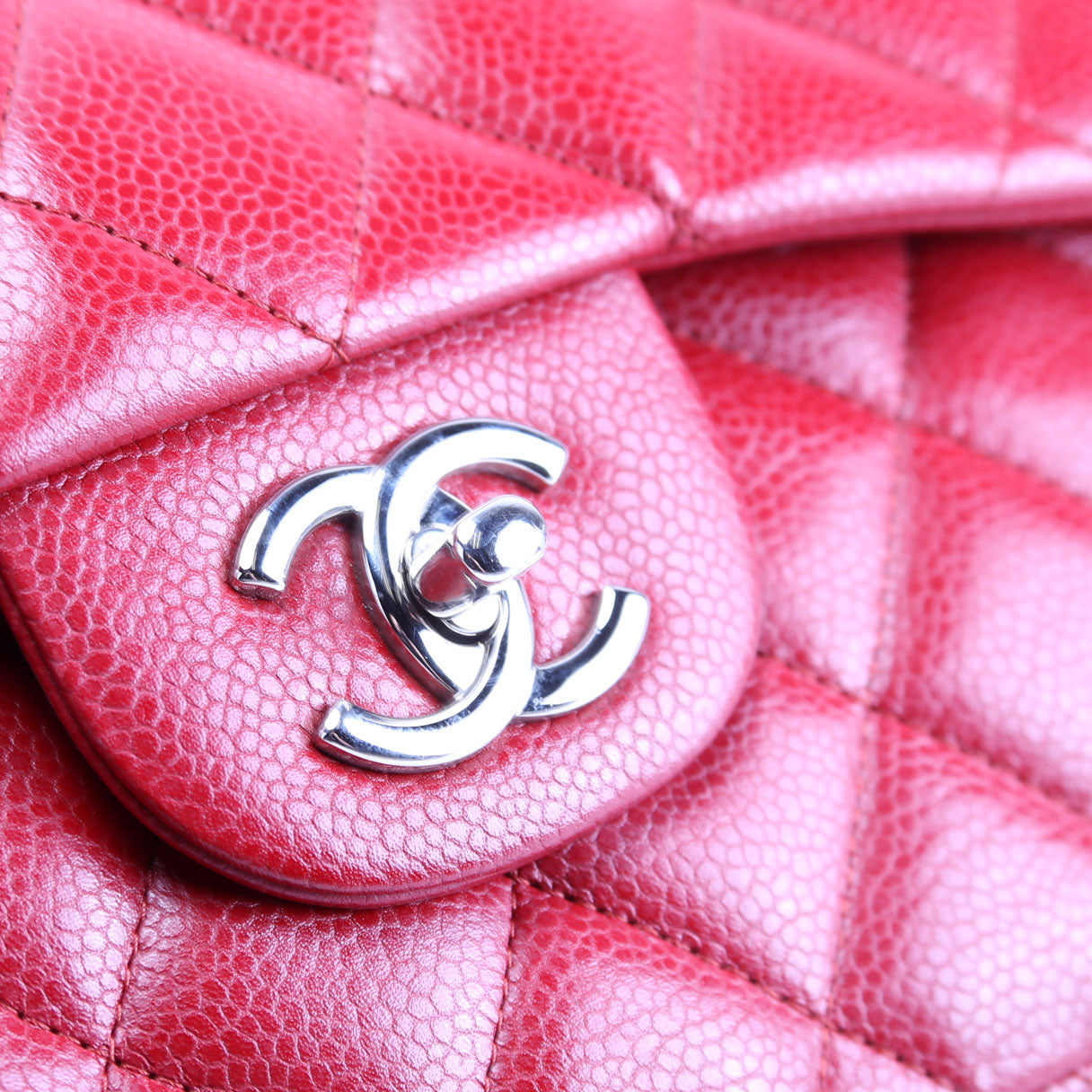 This pre-owned Chanel Classic Flap Jumbo is guaranteed 100% authentic. The exterior is in the classic Chanel Caviar leather.