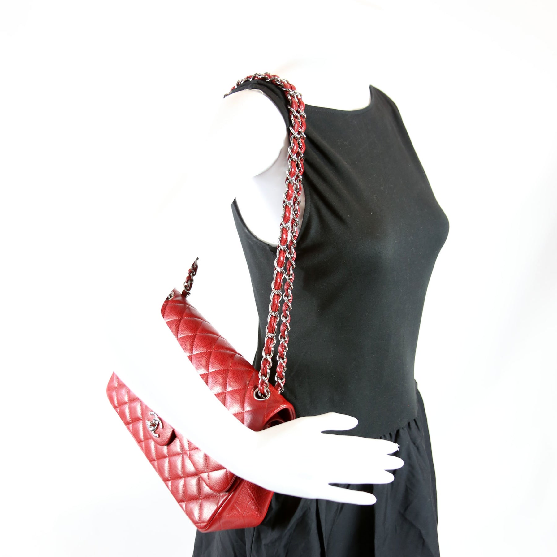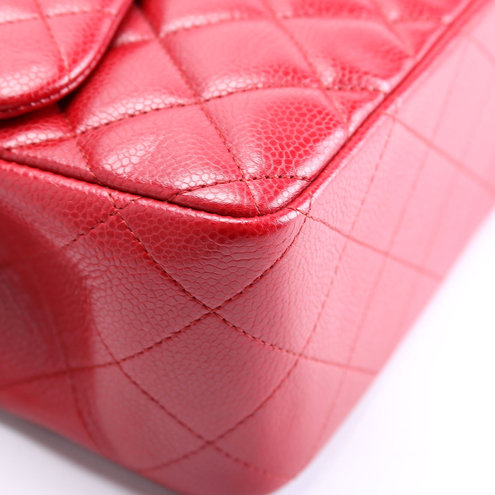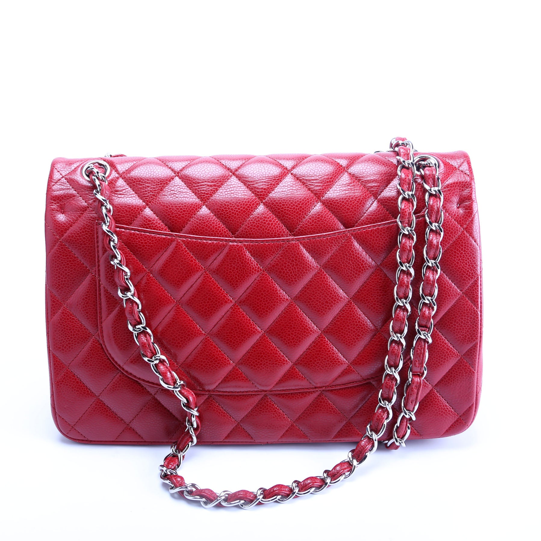 This pre-owned Chanel Classic Flap Jumbo is guaranteed 100% authentic. The exterior is in the classic Chanel Caviar leather.