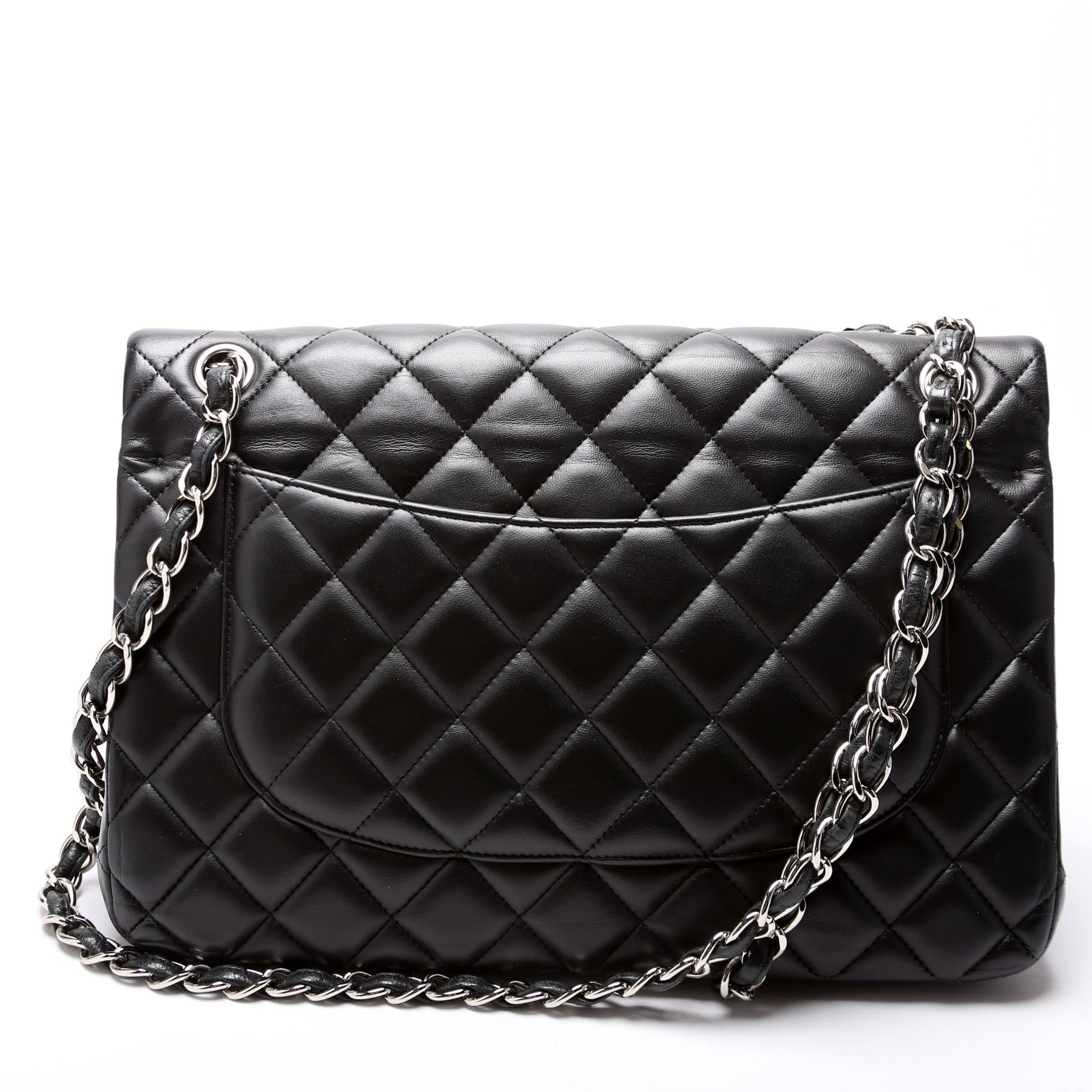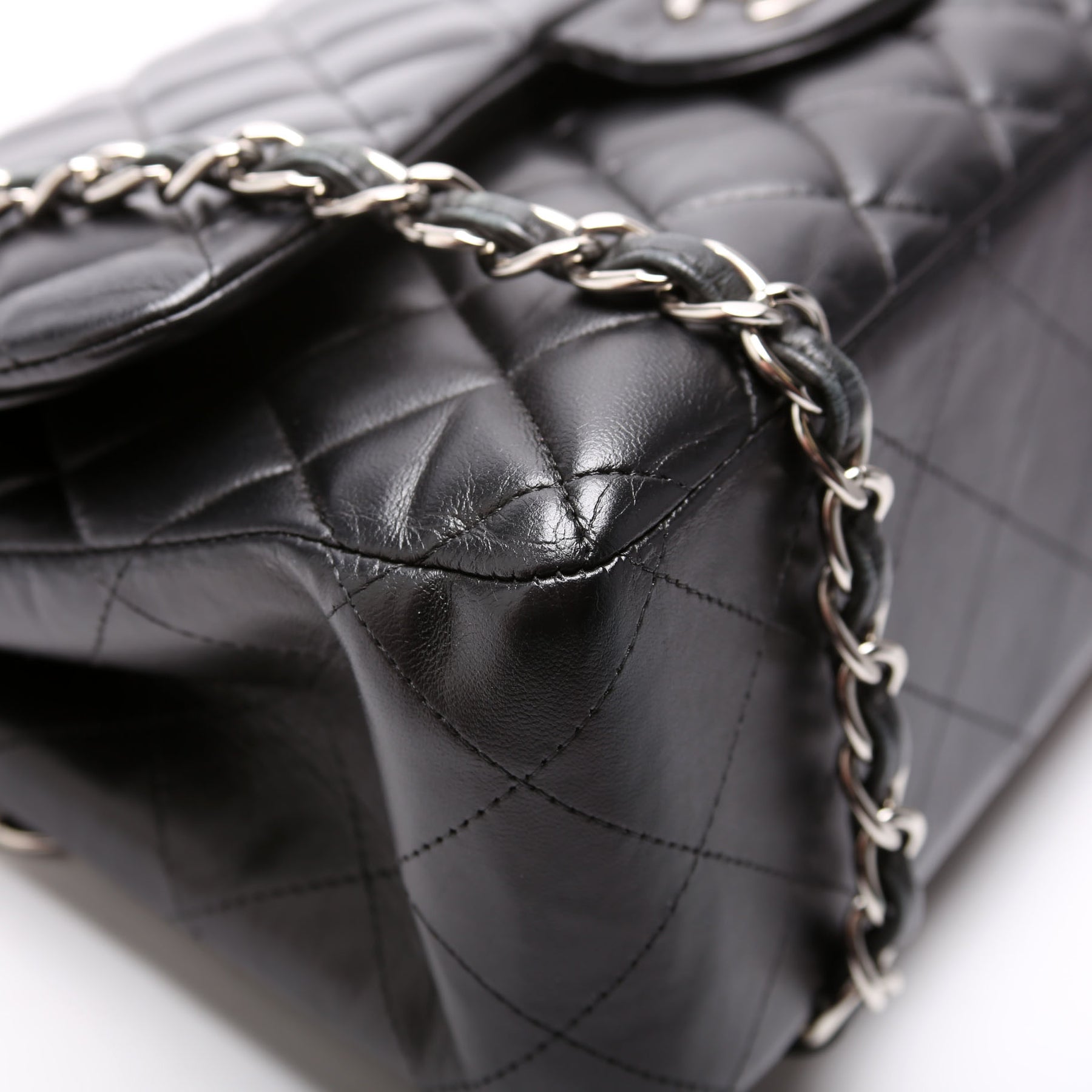 This pre-owned Chanel Classic Flap Jumbo is guaranteed 100% authentic. The exterior is in the classic Chanel Lambskin Leather.