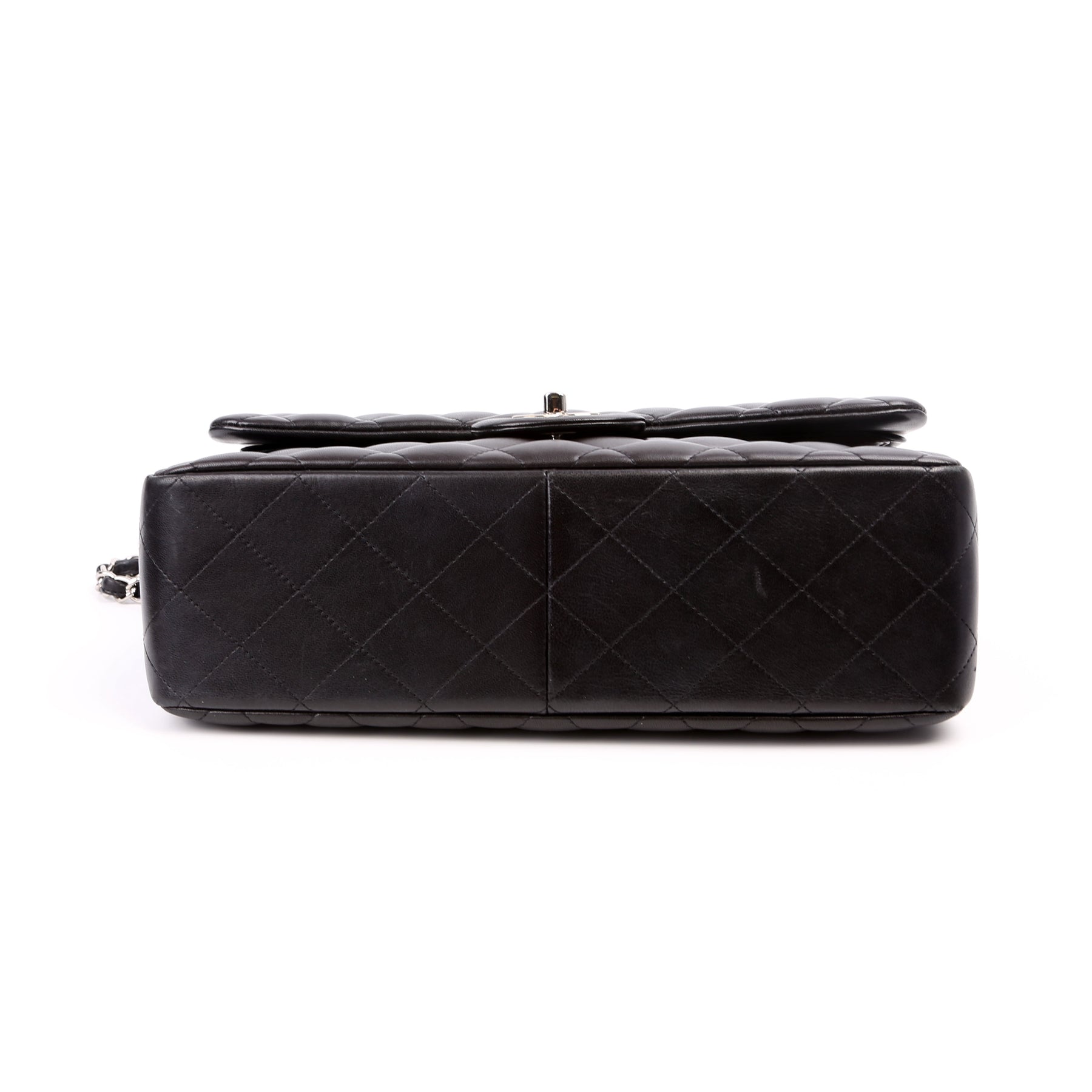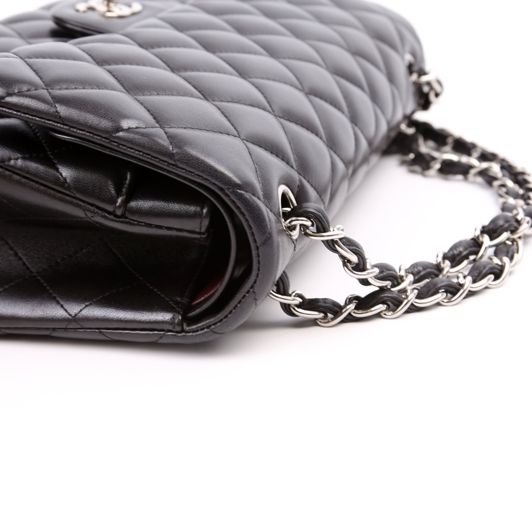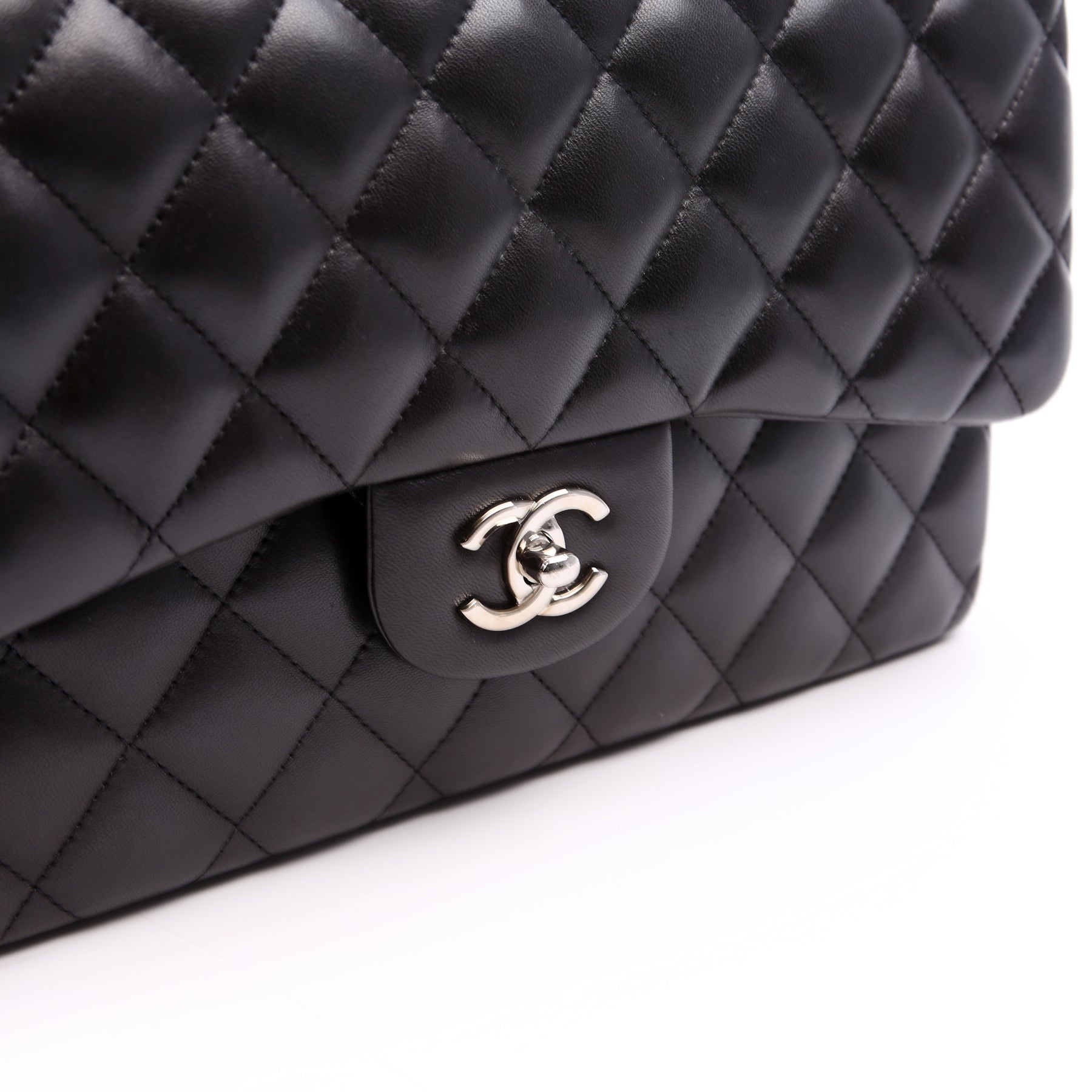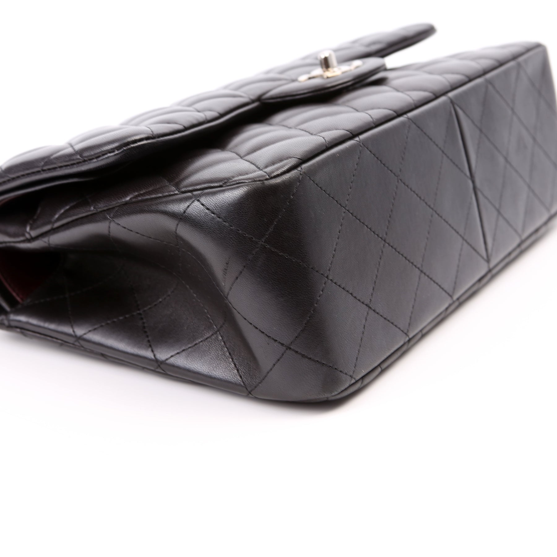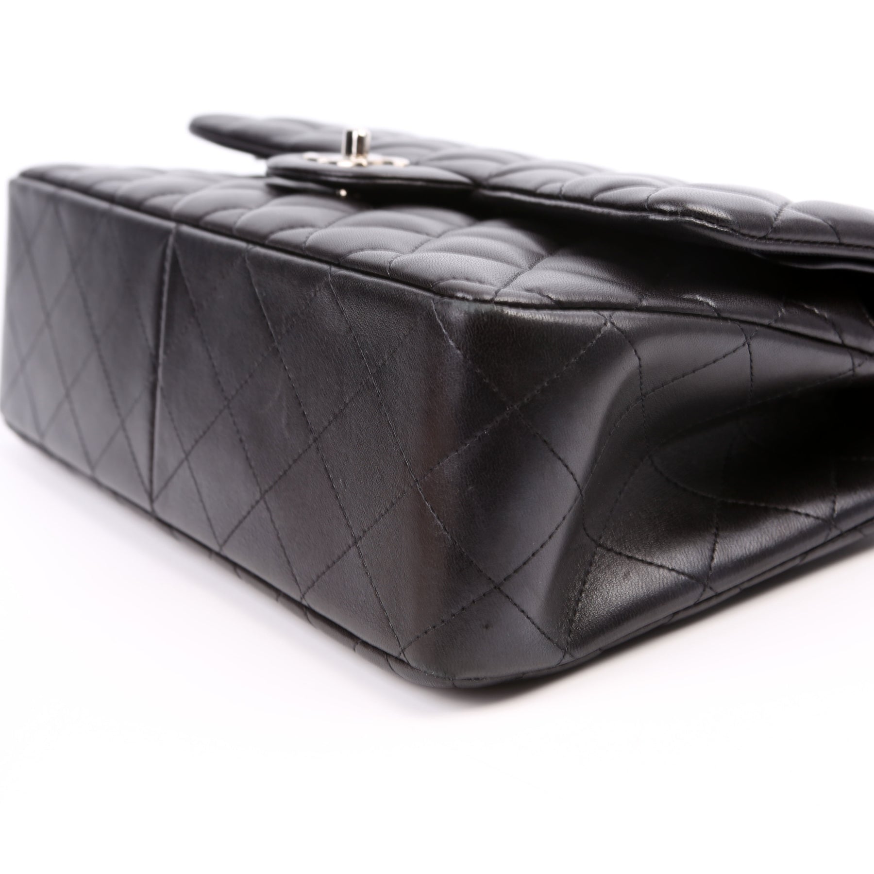 This pre-owned Chanel Classic Flap Jumbo is guaranteed 100% authentic. The exterior is in the classic Chanel Lambskin Leather.