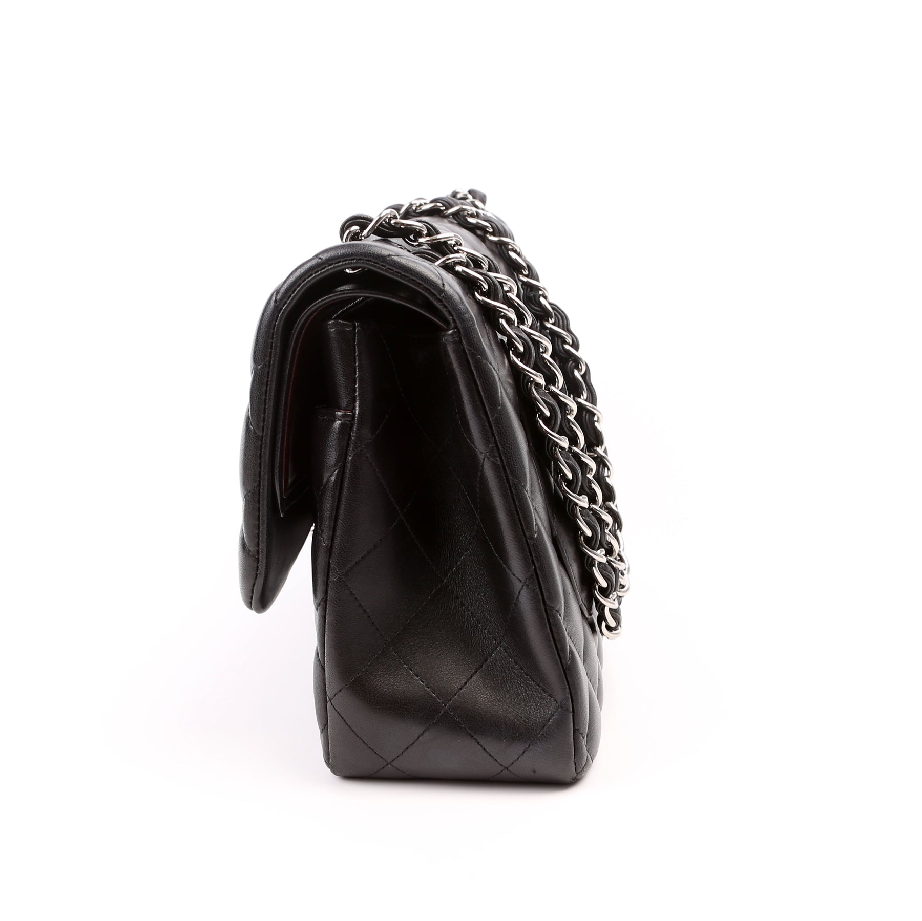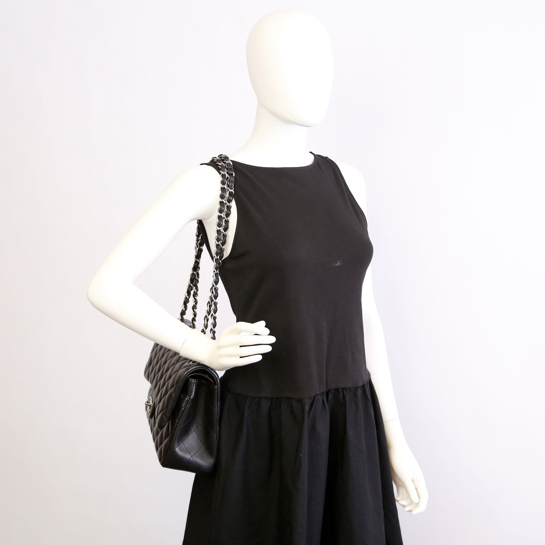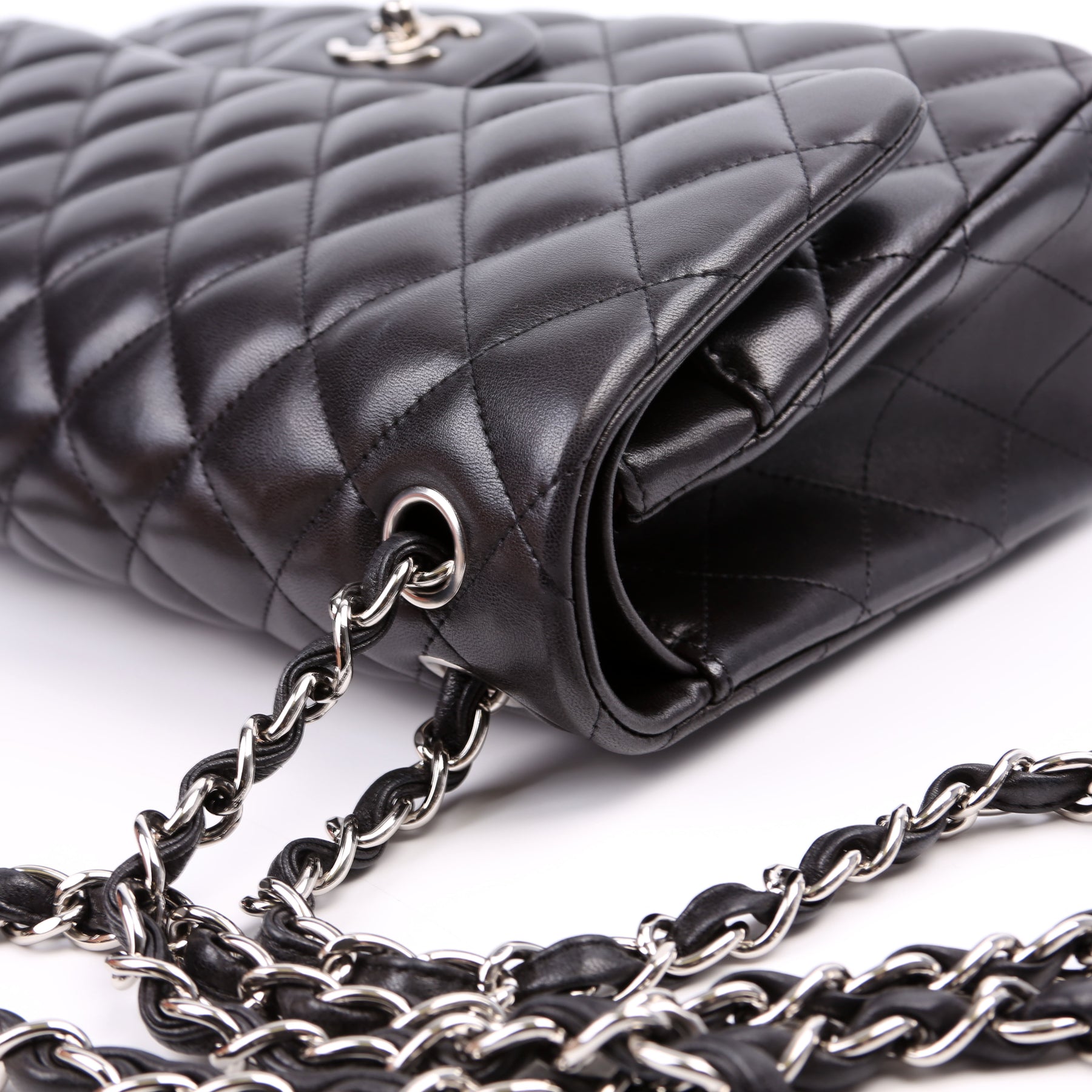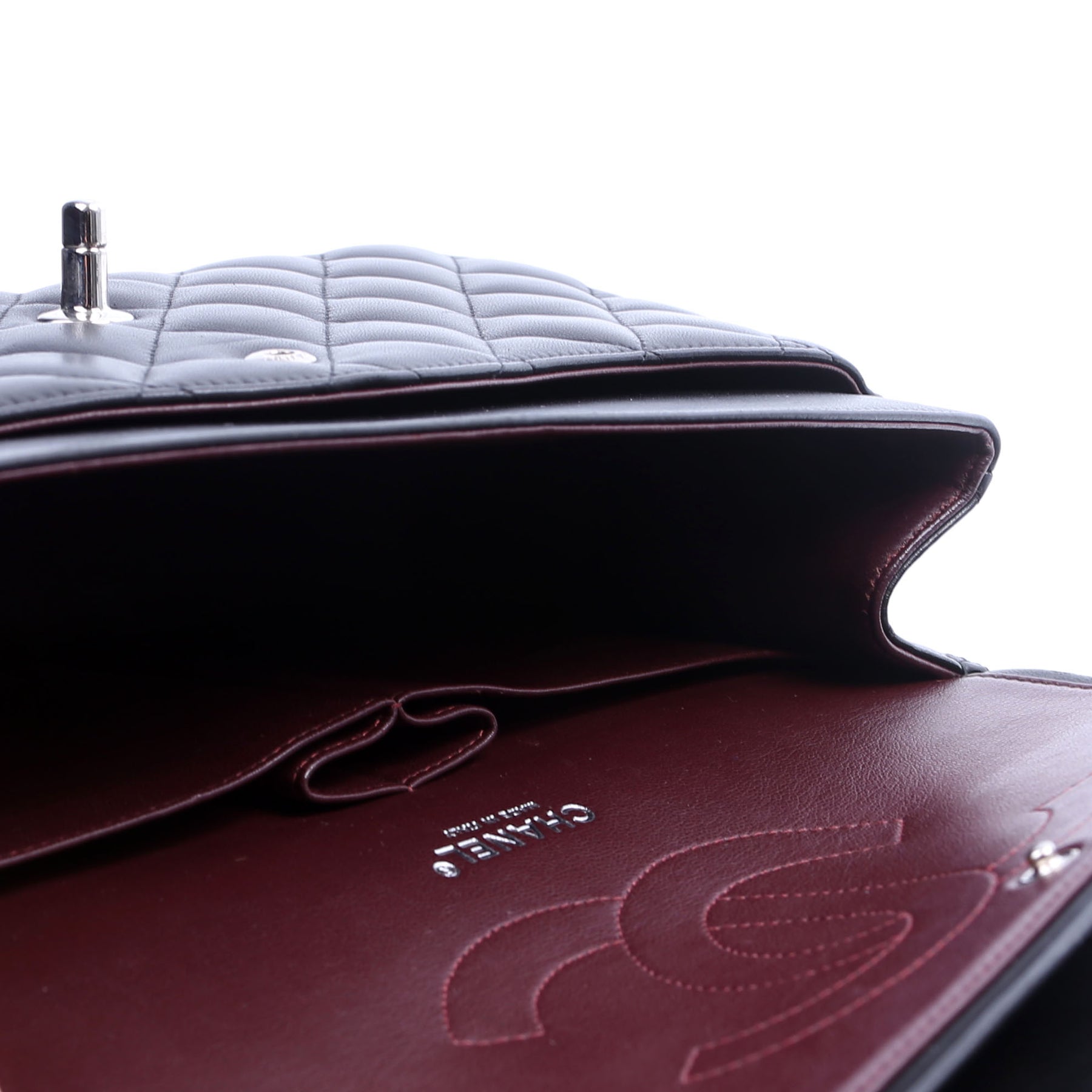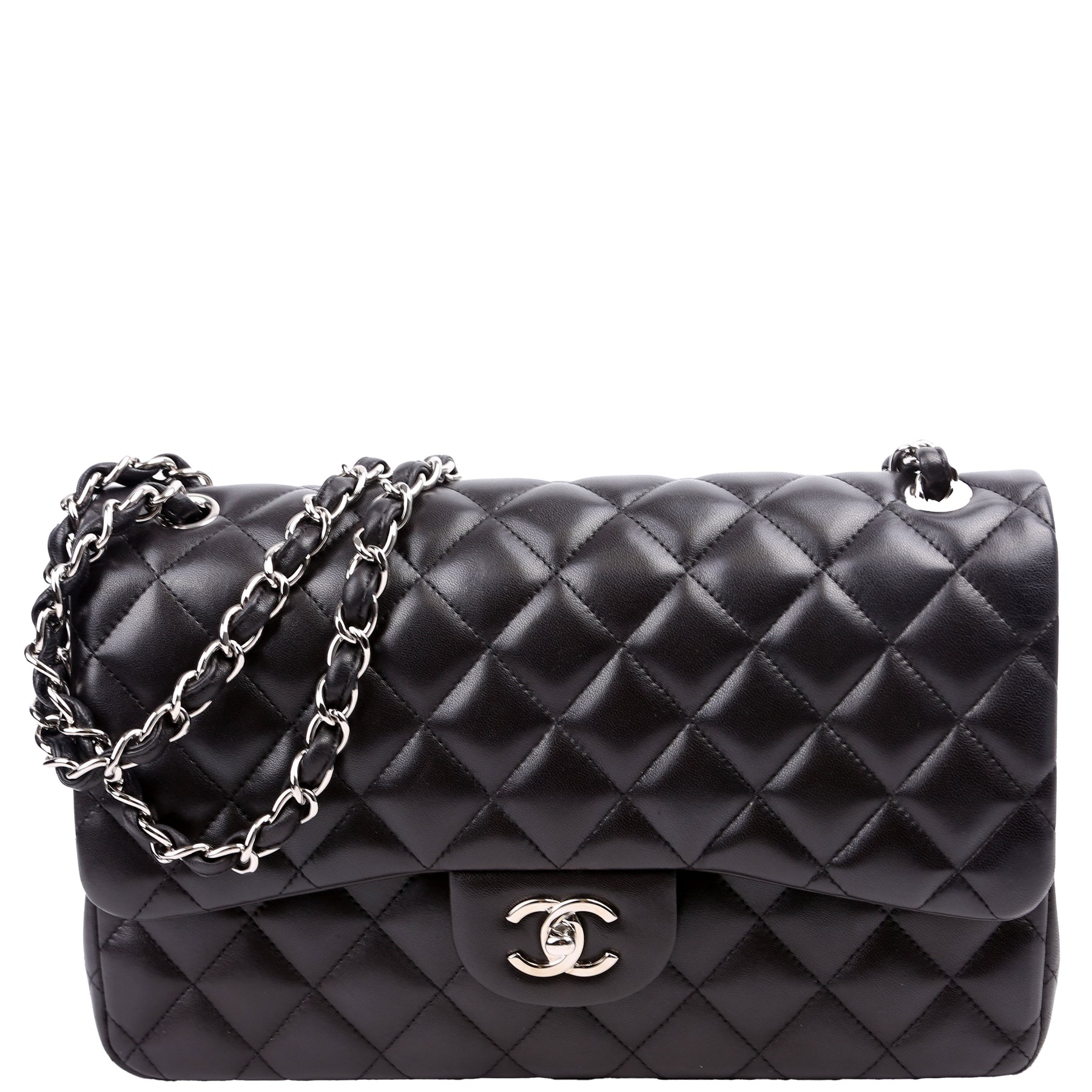 This pre-owned Chanel Classic Flap Jumbo is guaranteed 100% authentic. The exterior is in the classic Chanel Lambskin Leather.