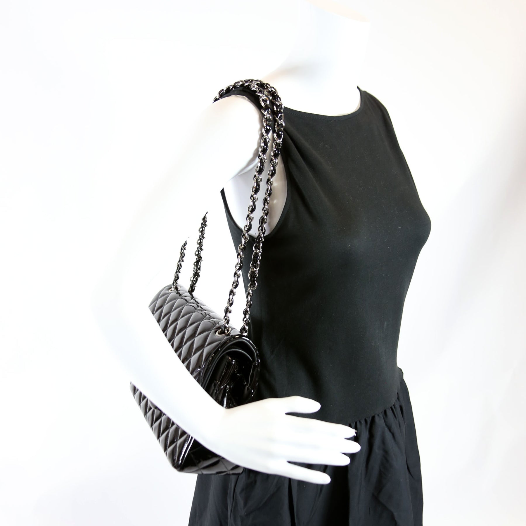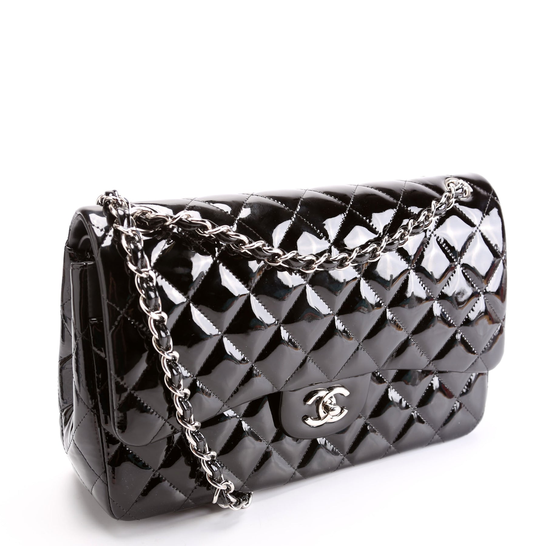 This pre-owned Channel Classic Flap Jumbo is guaranteed 100% authentic. The exterior is in the classic Chanel Patent leather.