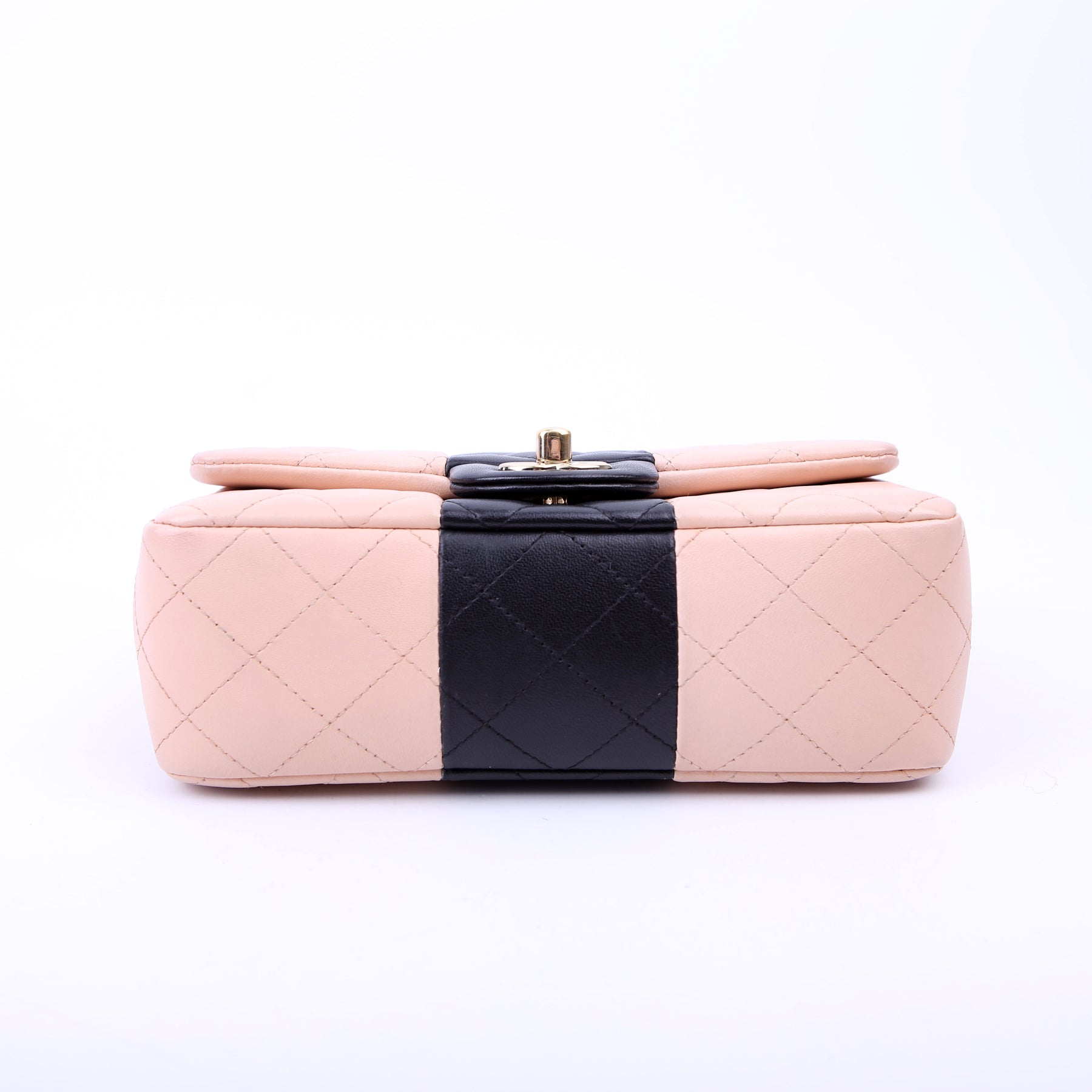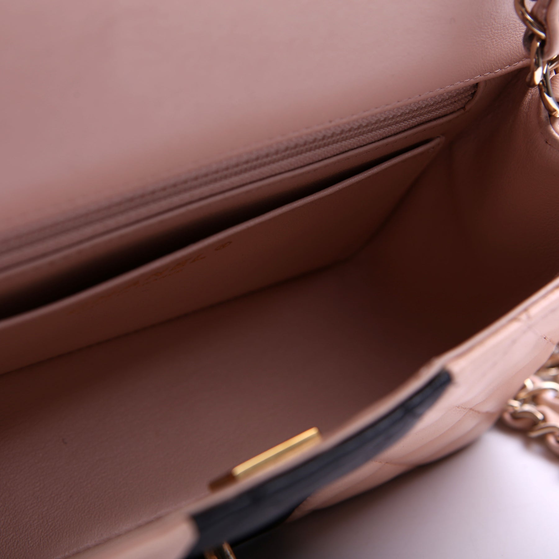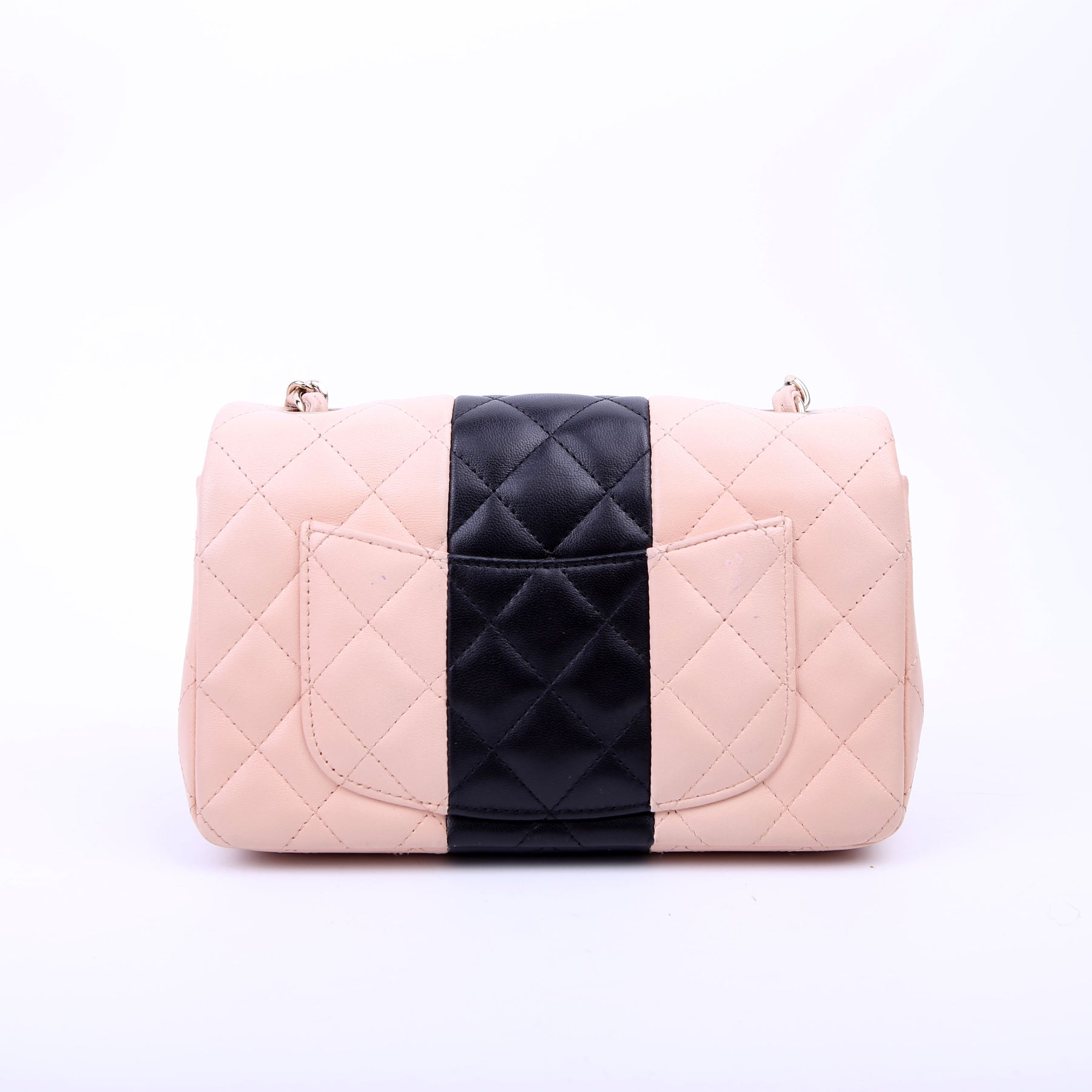 This pre-owned Chanel Classic Flap Mini Rectangle is guaranteed 100% authentic. The exterior is in the classic Chanel Lambskin leather.