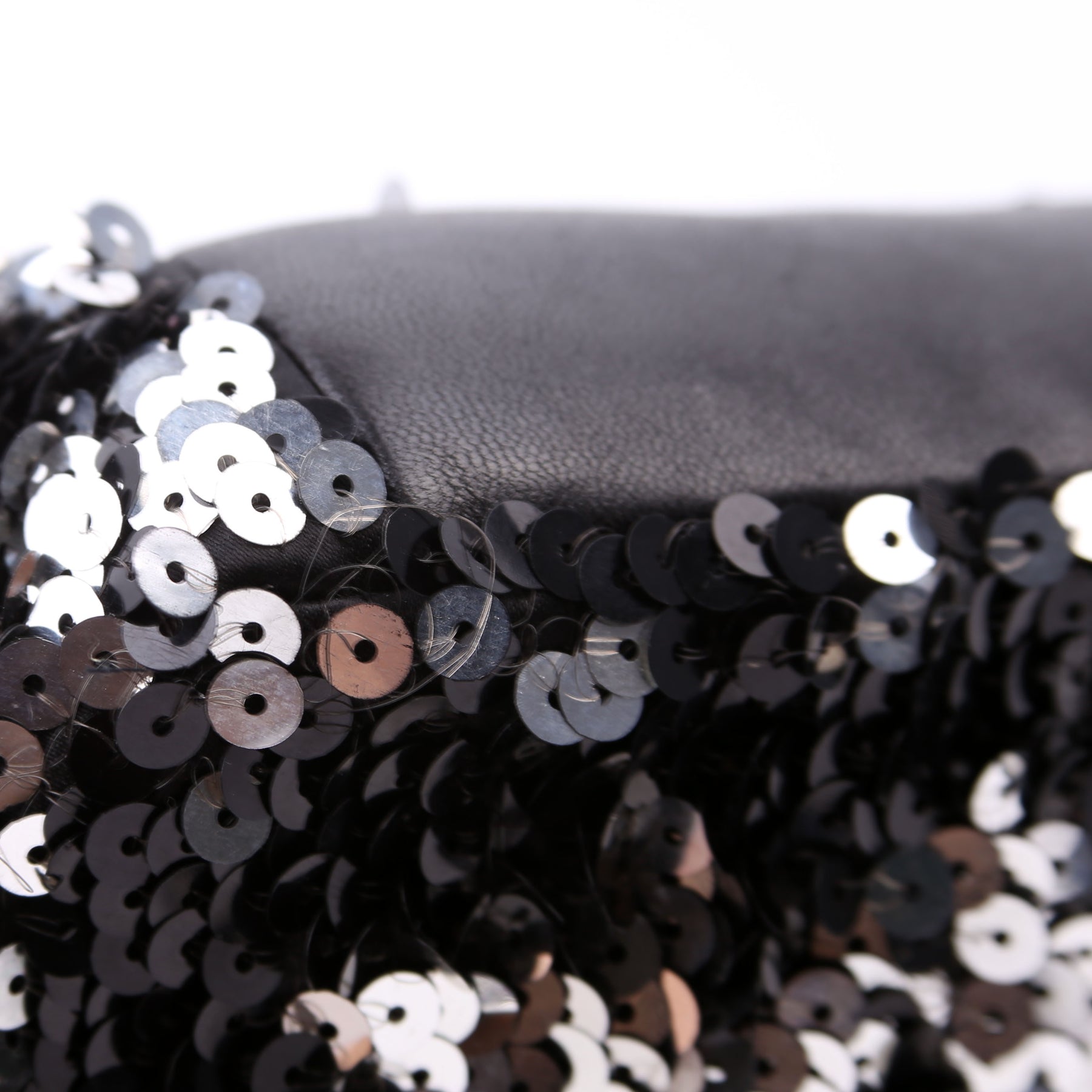 Exterior: The exterior has missing sequins in the corners. The leather base has minor scuffs.