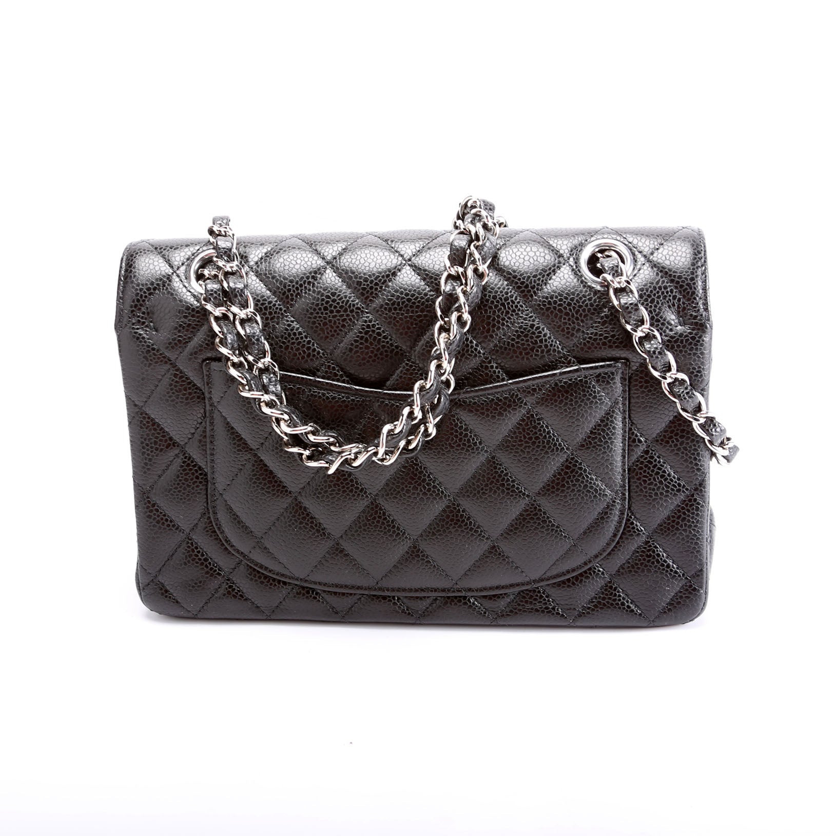 This pre-owned Chanel Classic Flap Small is guaranteed 100% authentic. The exterior is in the classic Chanel Caviar leather.
