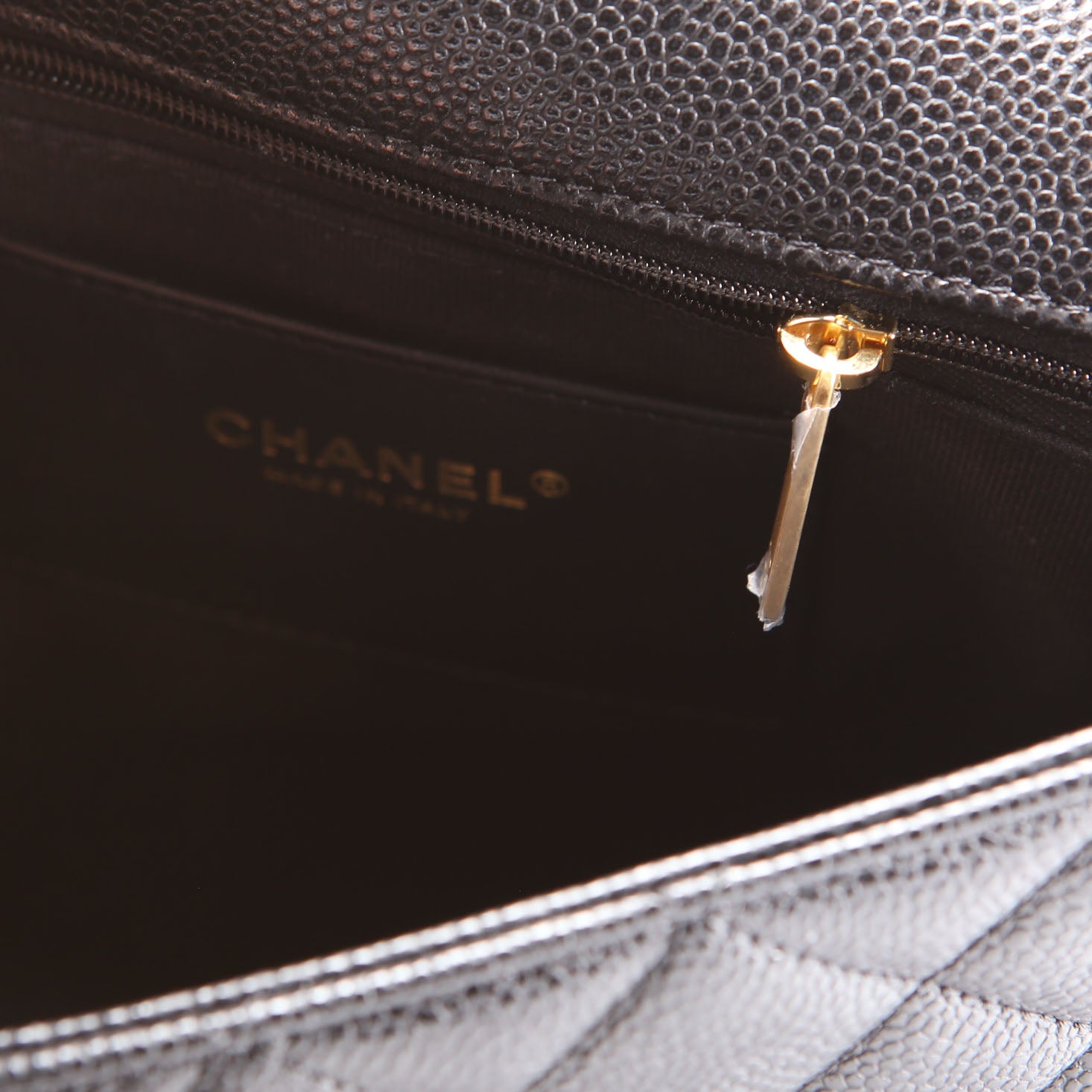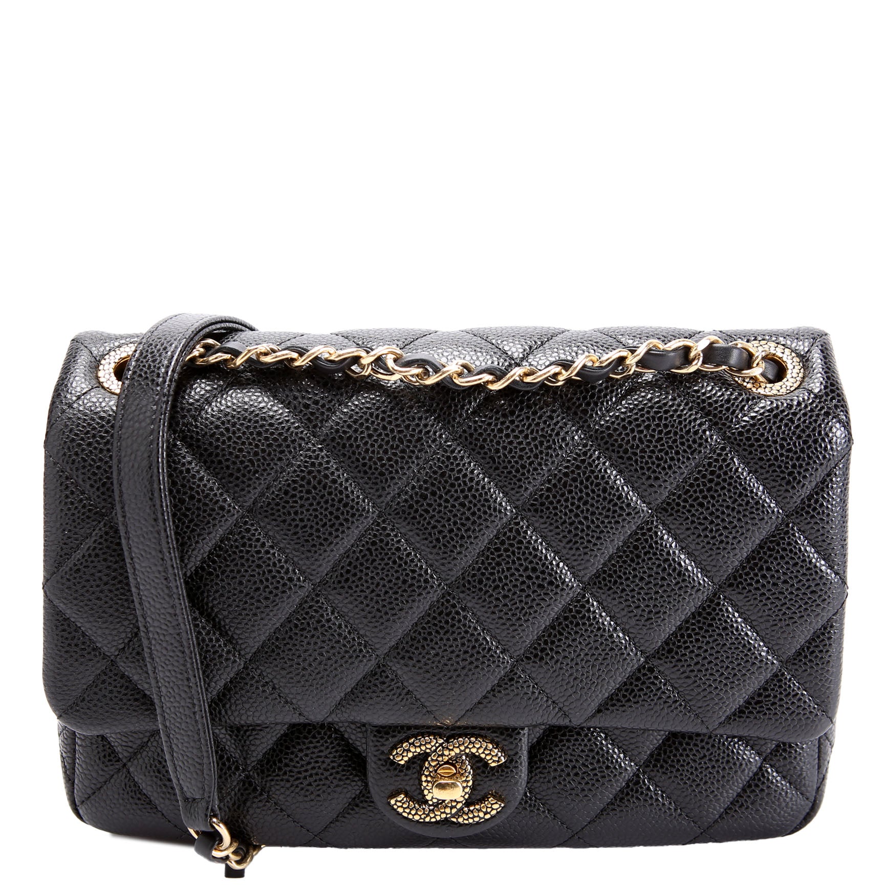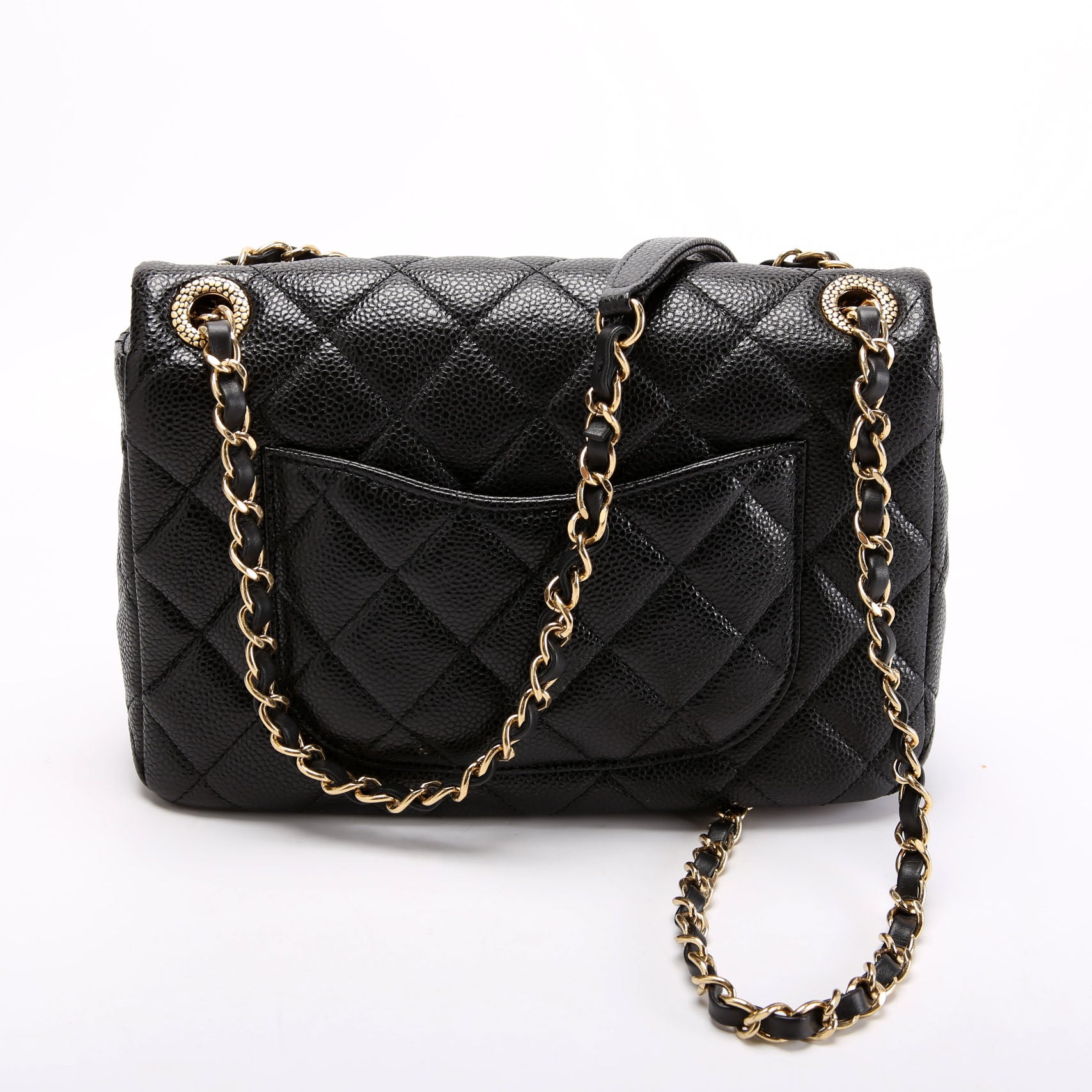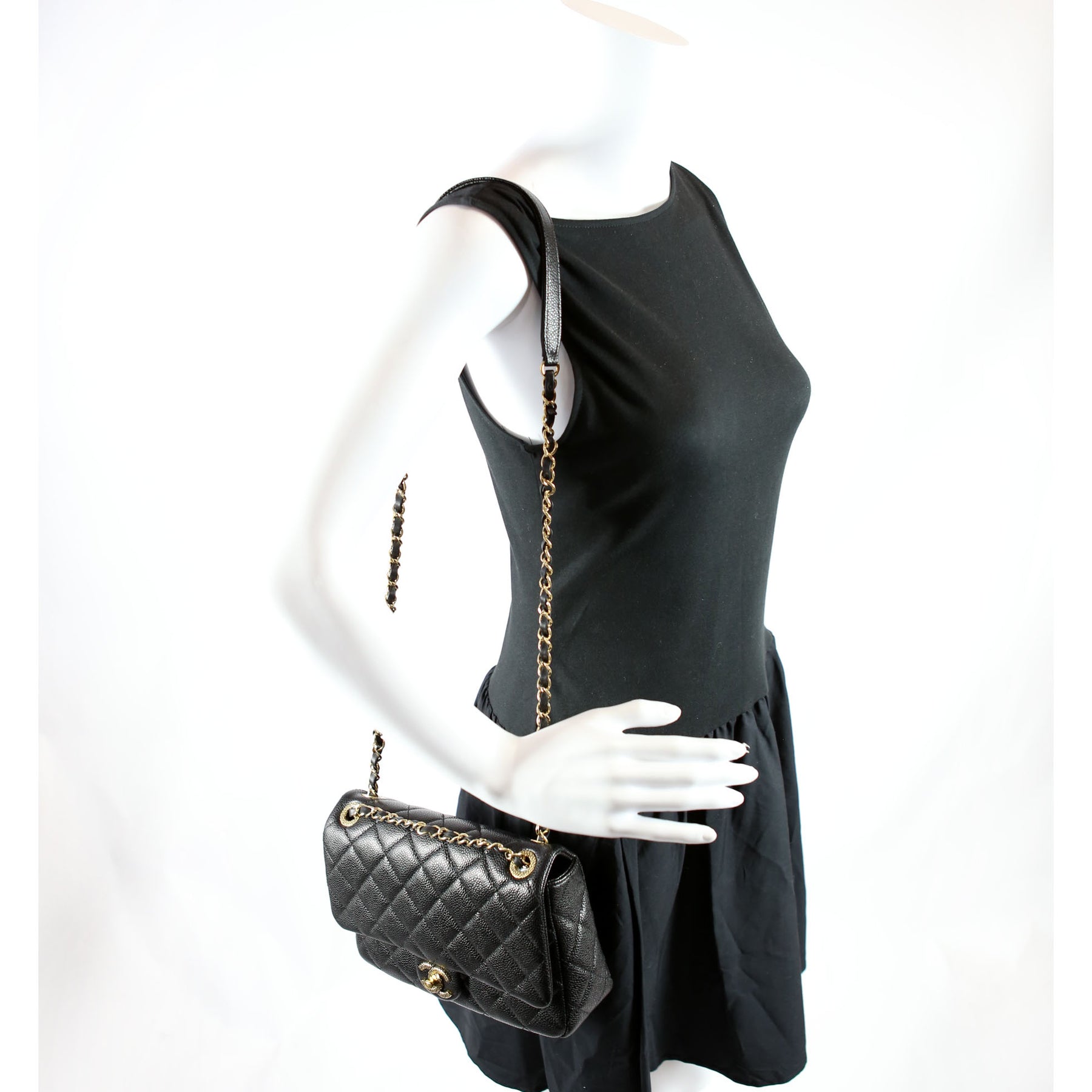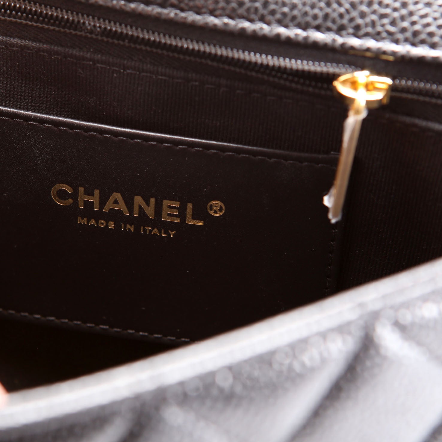 This pre-owned Chanel Classic Flap Small is guaranteed 100% authentic. The exterior is in the classic Chanel Caviar Leather.