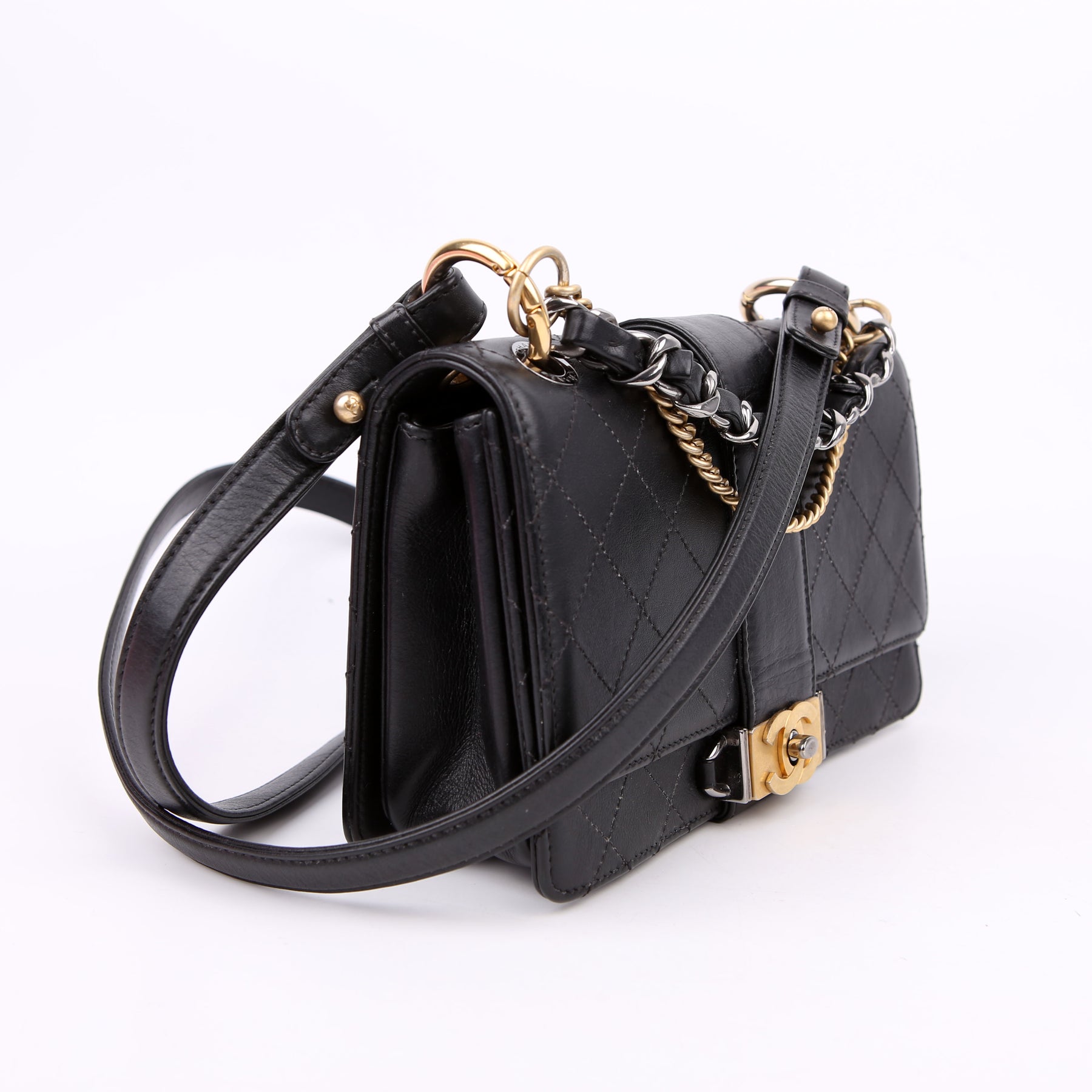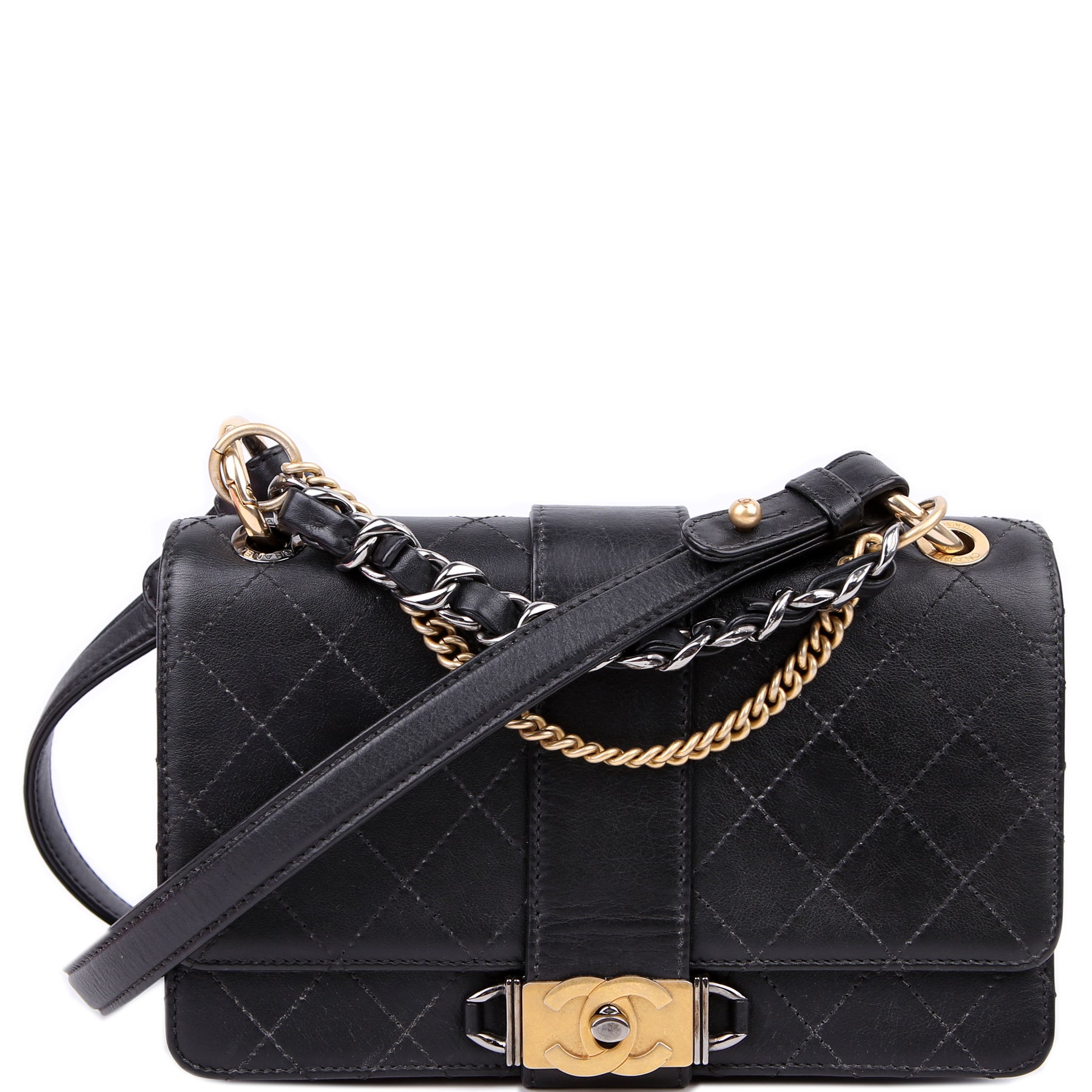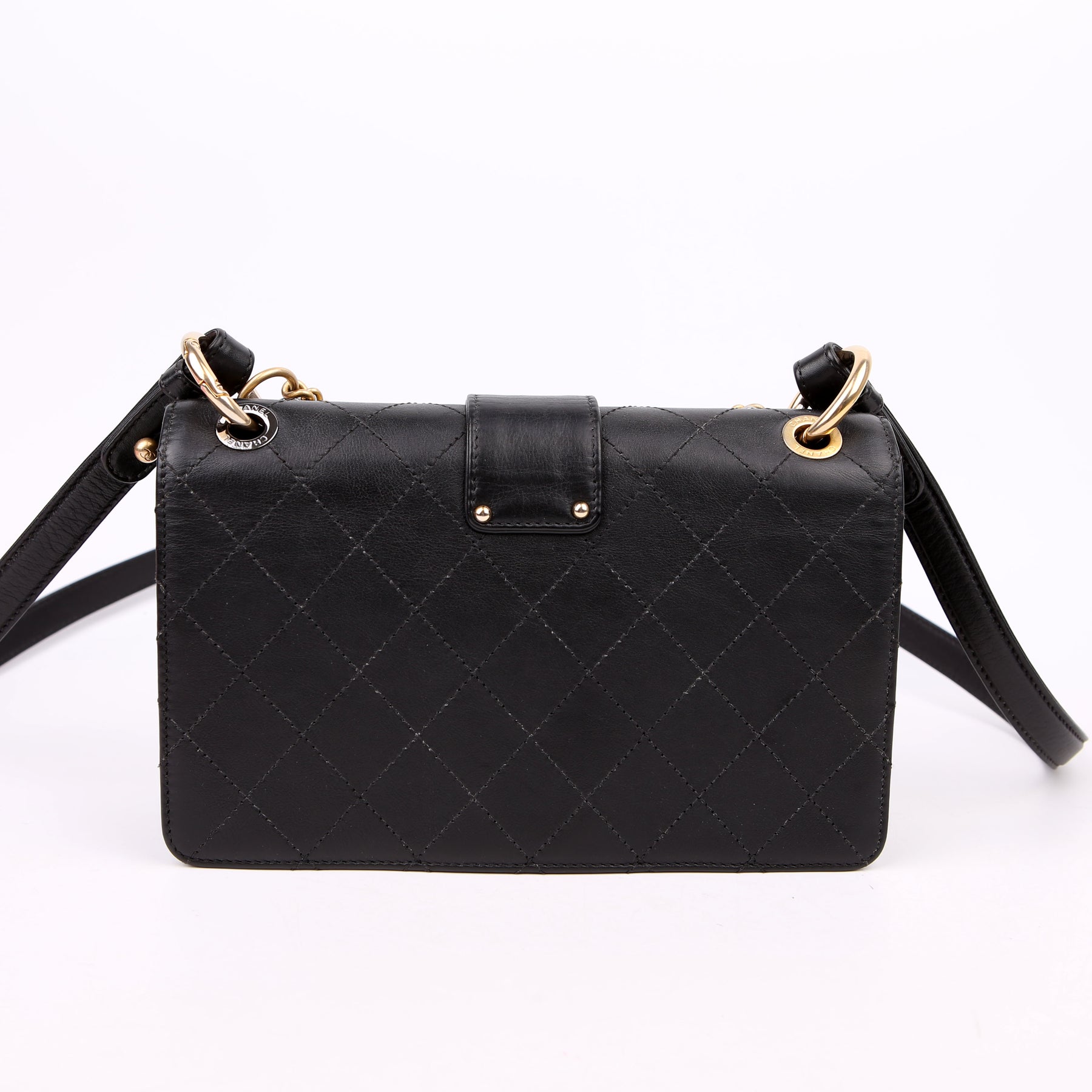 This pre-owned Chanel Double Chain Top Handle Flap Calfskin 26M is guaranteed 100% authentic. The exterior is in the classic Chanel Calfskin leather.