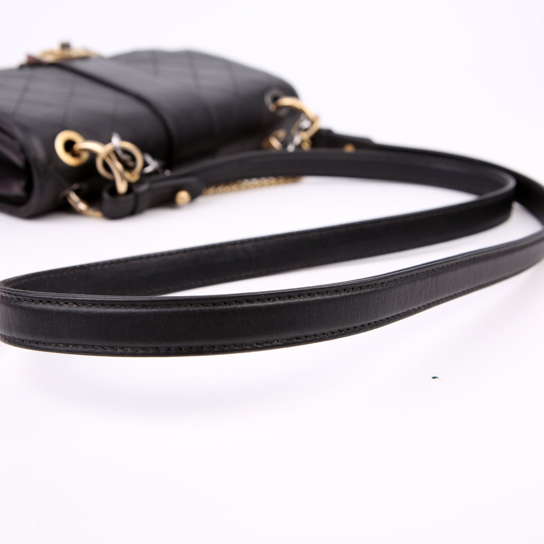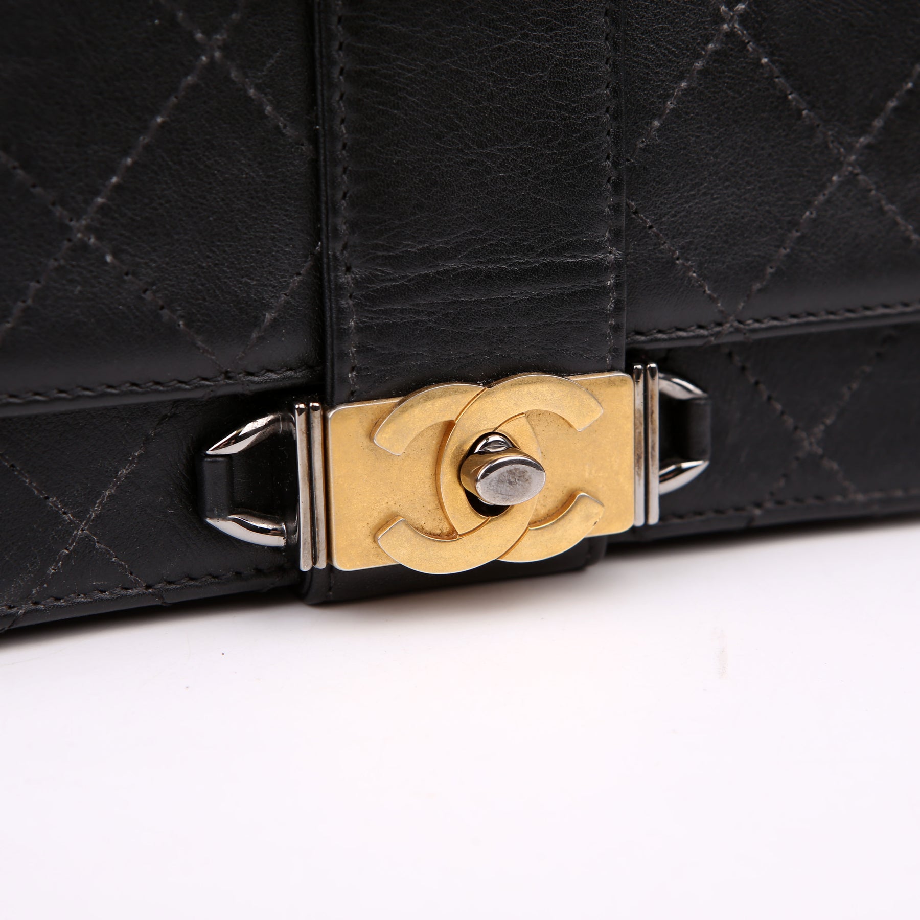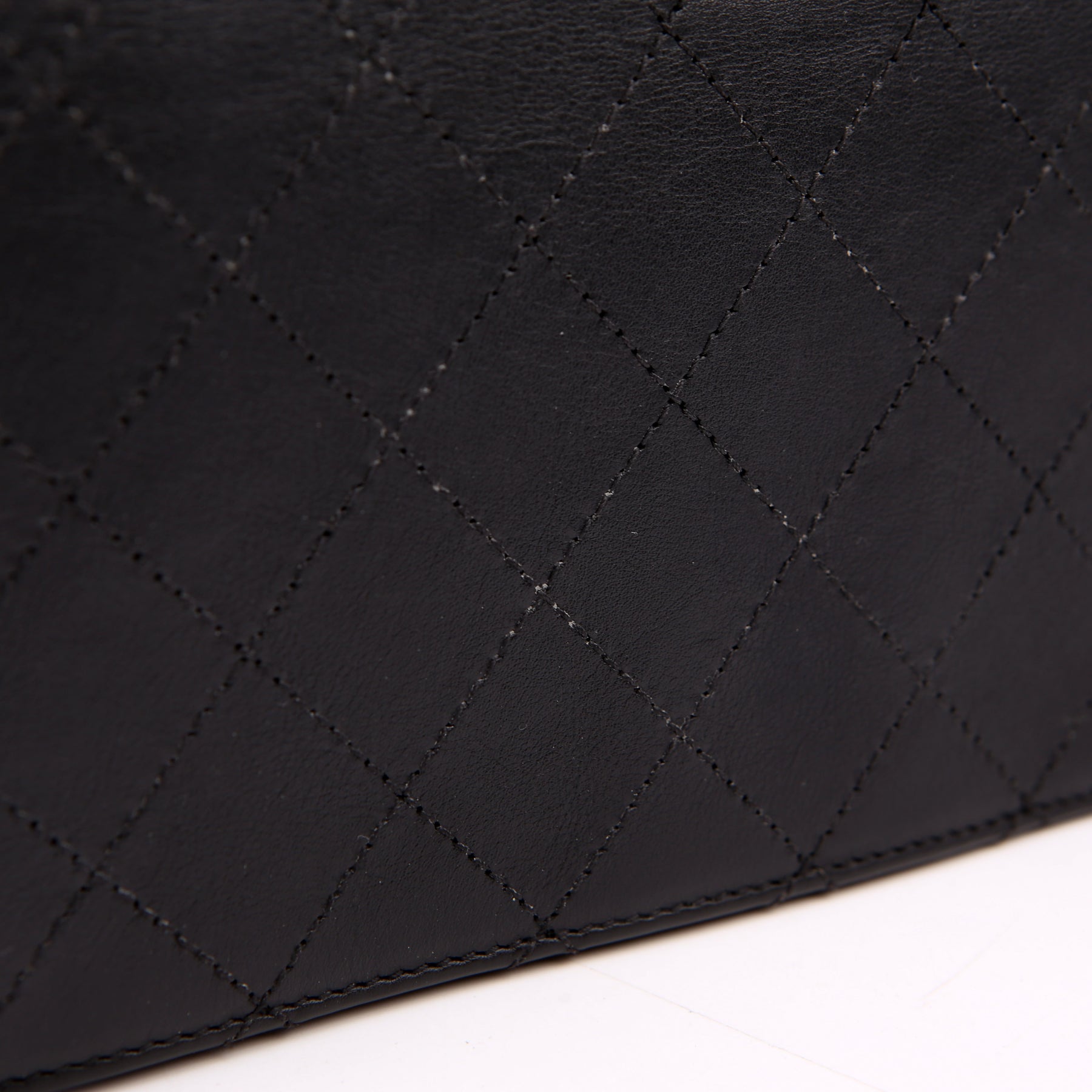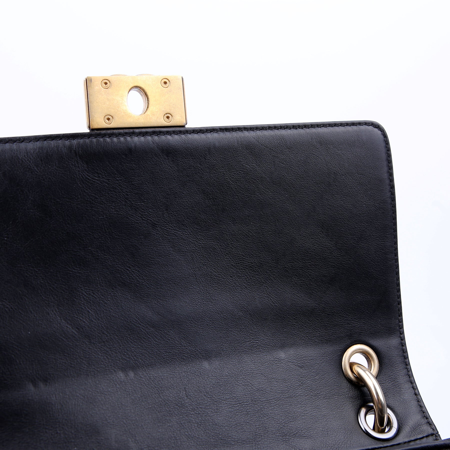 This pre-owned Chanel Double Chain Top Handle Flap Calfskin 26M is guaranteed 100% authentic. The exterior is in the classic Chanel Calfskin leather.