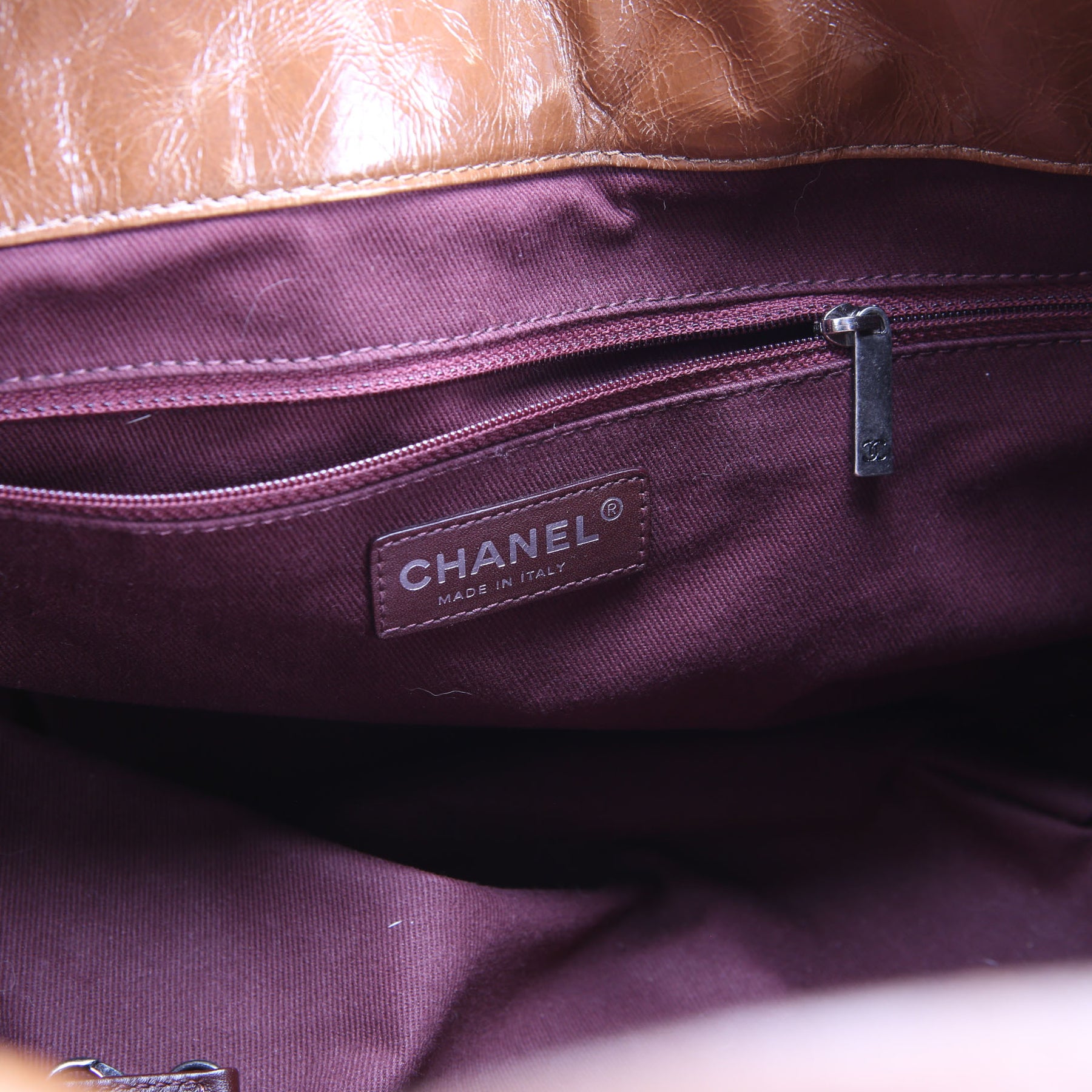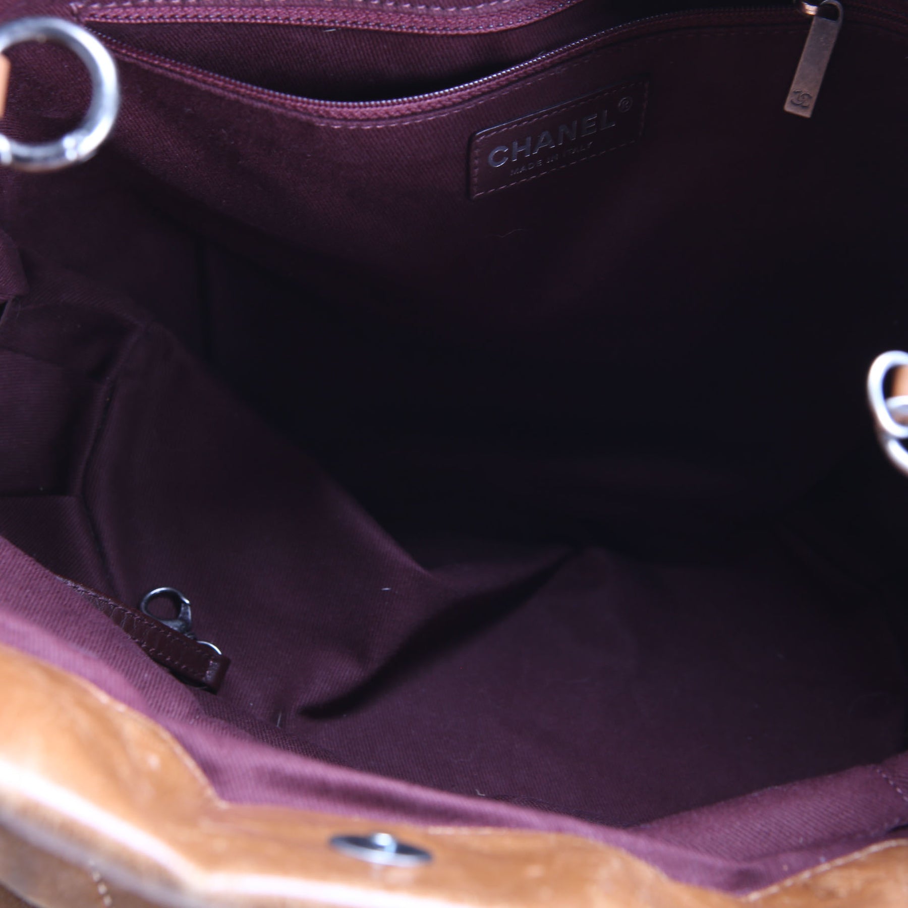 Interior: The interior shows wear and staining throughout. It features two open pockets, and one zip closure pocket.